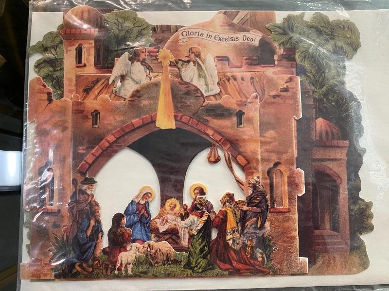 Die cut greeting card. Unopened, Nativity scene. Opens up similar to a pop up book. Card is about 8"x6" flat.