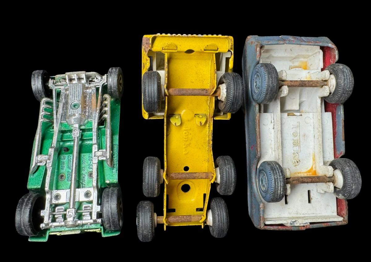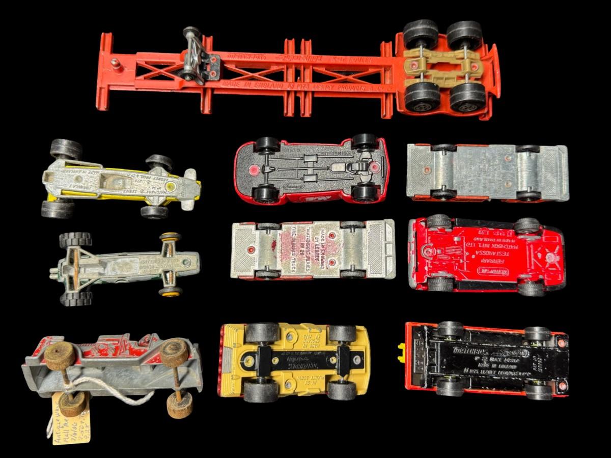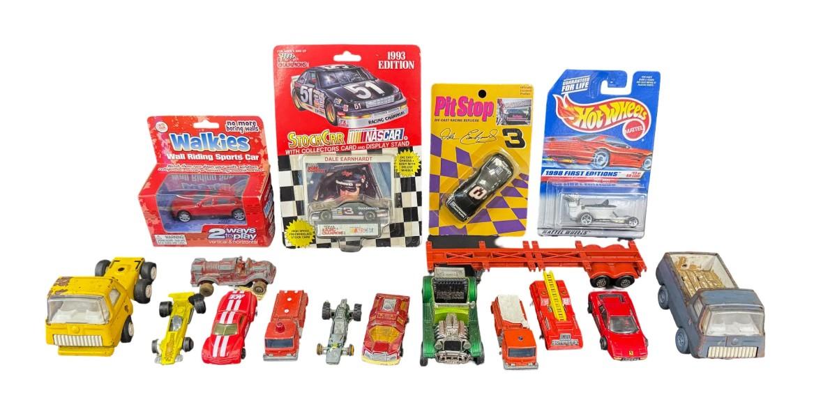 Includes Hot Wheels, Lesney, Matchbox Racing Champions, and more. Total of 16 pieces. Some are NOS. Some have age related wear, including missing paint. [VY]
