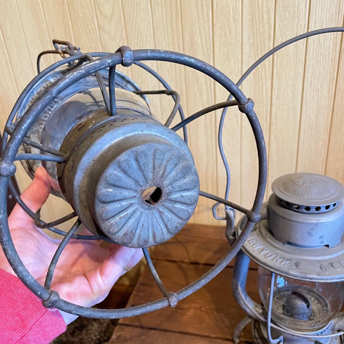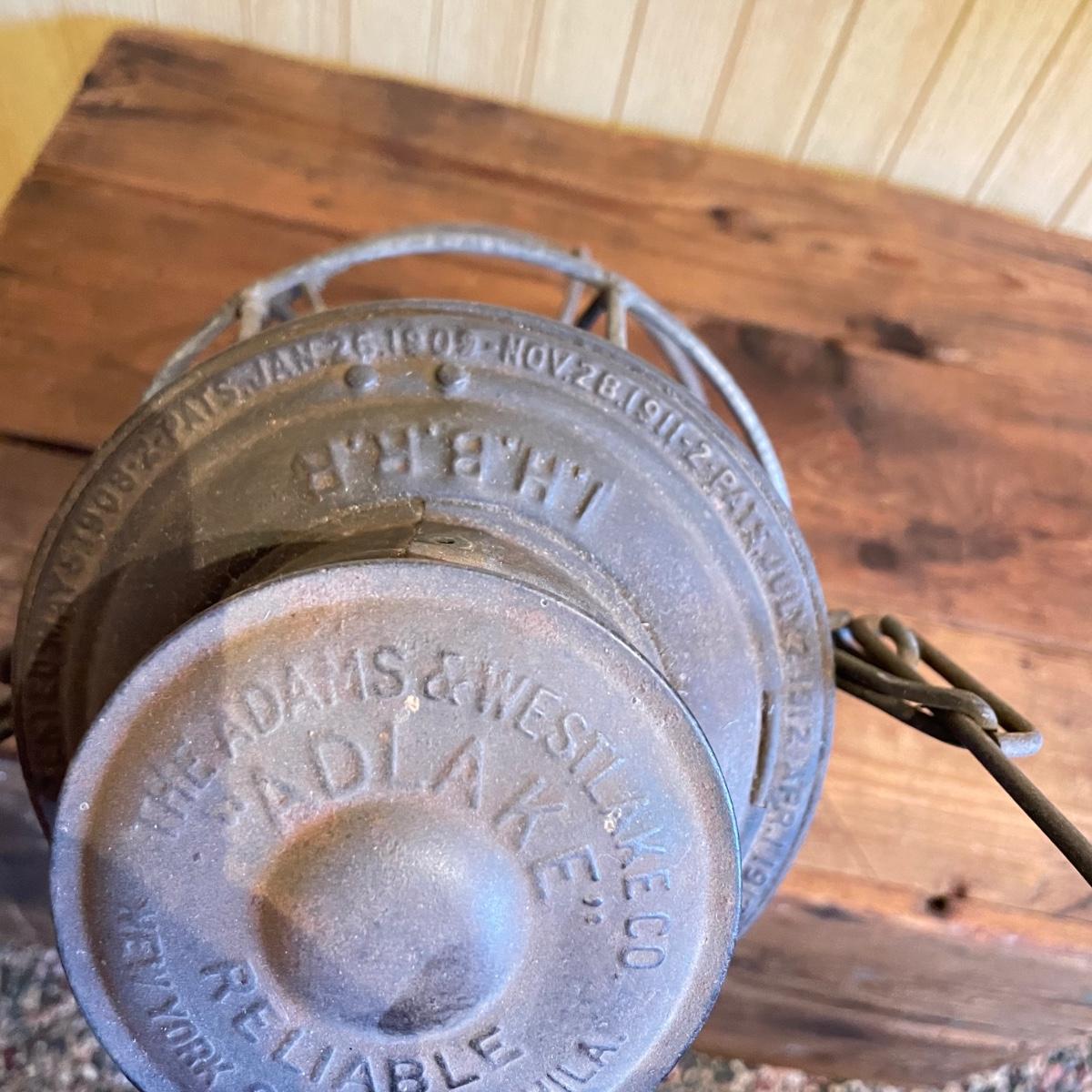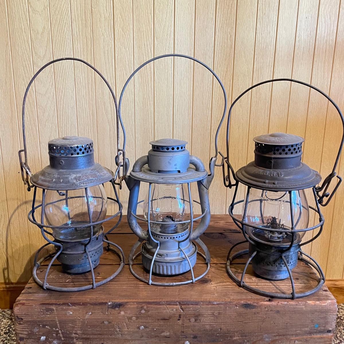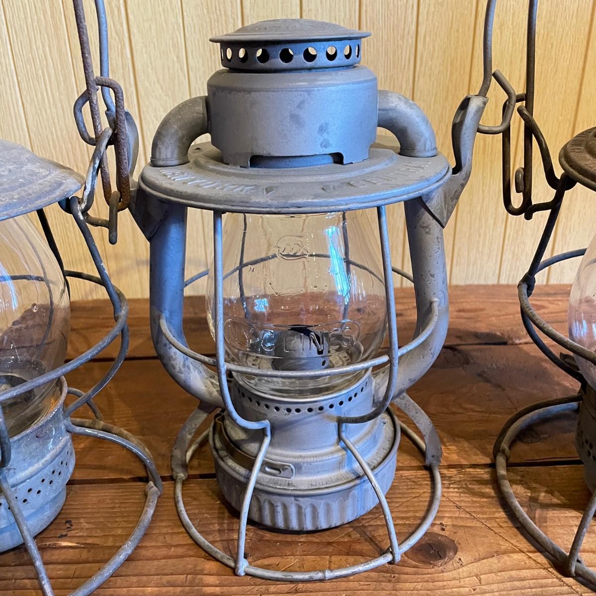Two Adams & Westlake “AdLake” and one Dietz New York antique rail yard lanterns with clear globes. The Adlake lantern with a Dietz globe has a significant crack, but it remains intact currently. Both Adlake lanterns have 1912-1913 patent dates while the Dietz lantern shows “˜07 through “˜27 patent dates. The Burlington Adlake lantern has an unmarked globe while the Dietz and the “New York-Chicago-Phila” Adams & Westlake lanterns have Dietz globes. The AdLakes are about 10.75” tall and the Dietz is about 10.25”. See images shipping available.