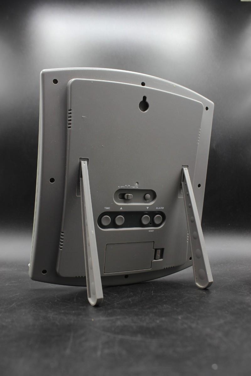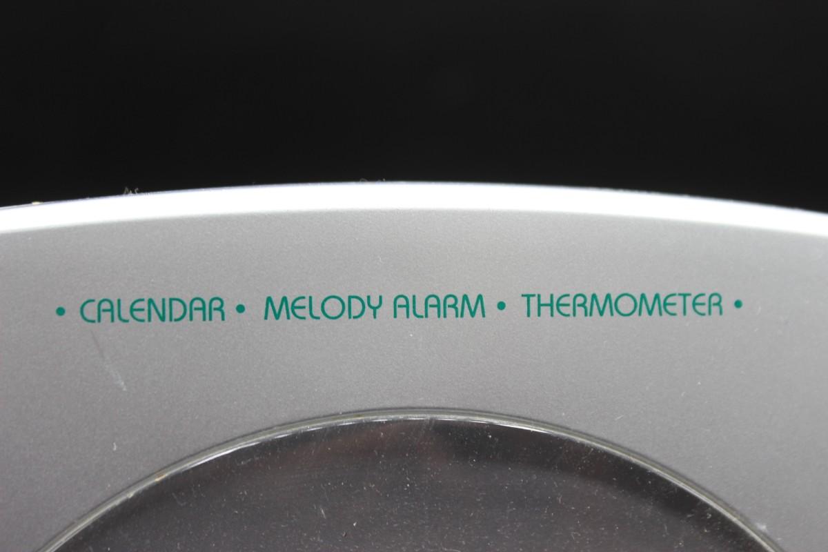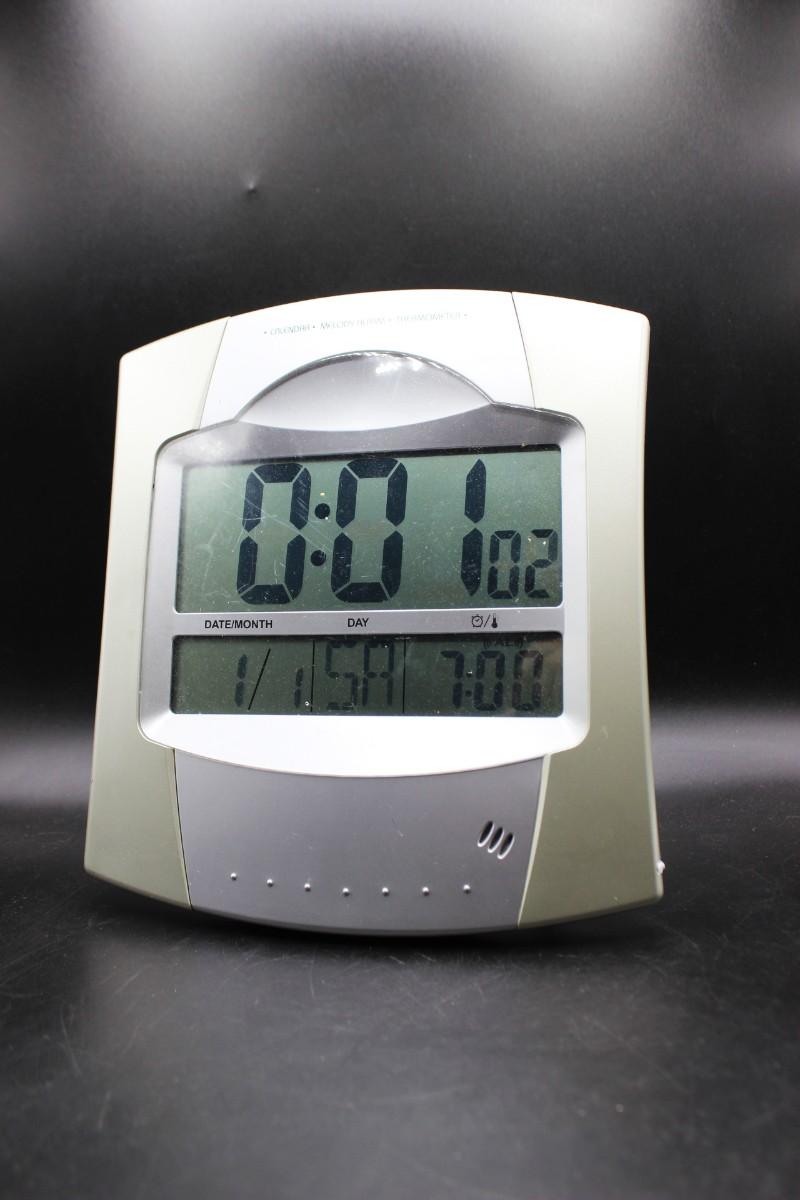 Digital Display Calendar Alarm Thermometer, there are no significant cracks or chips to the plastic body and is in good useable condition. Has been tested with new batteries and works perfectly, check pictures for more details.