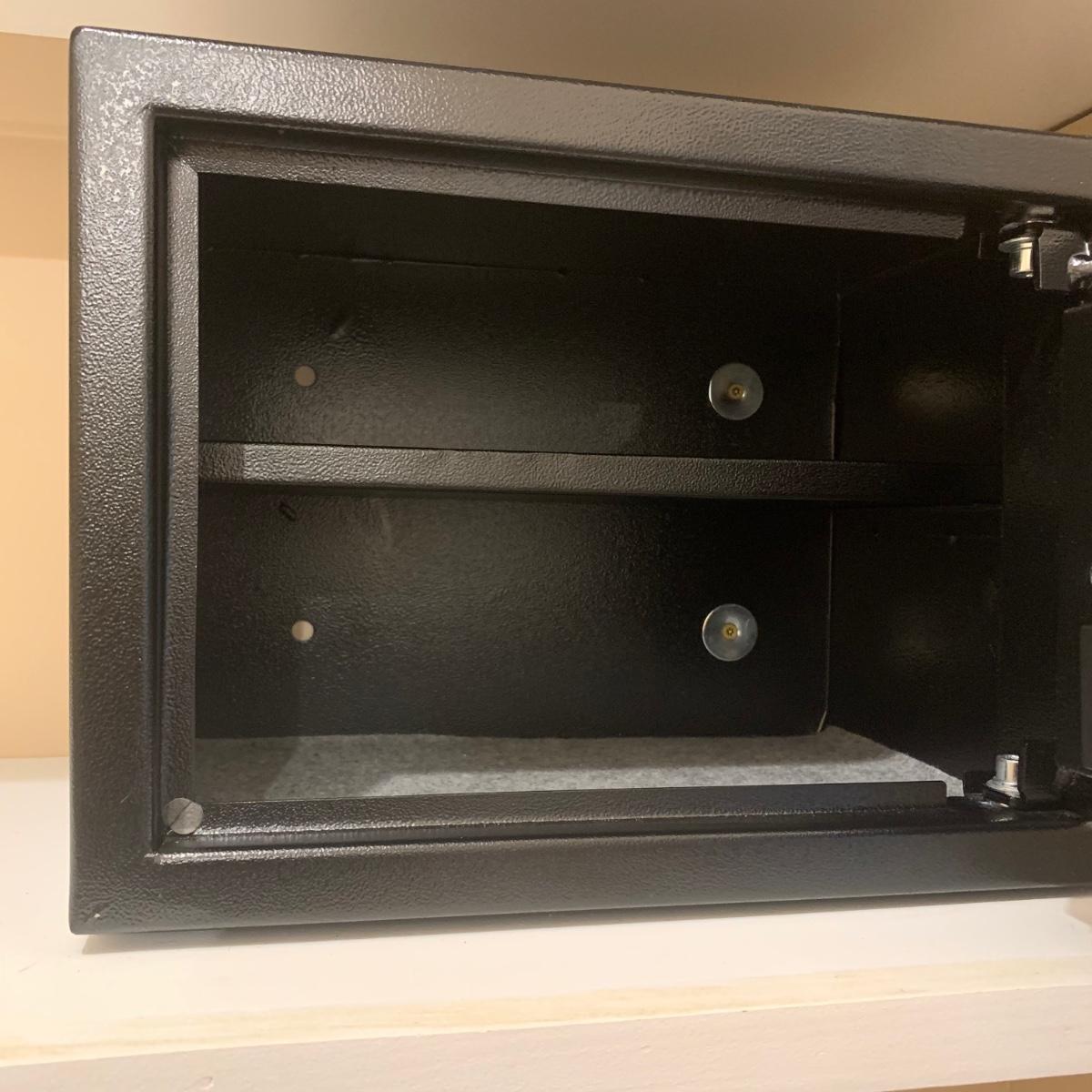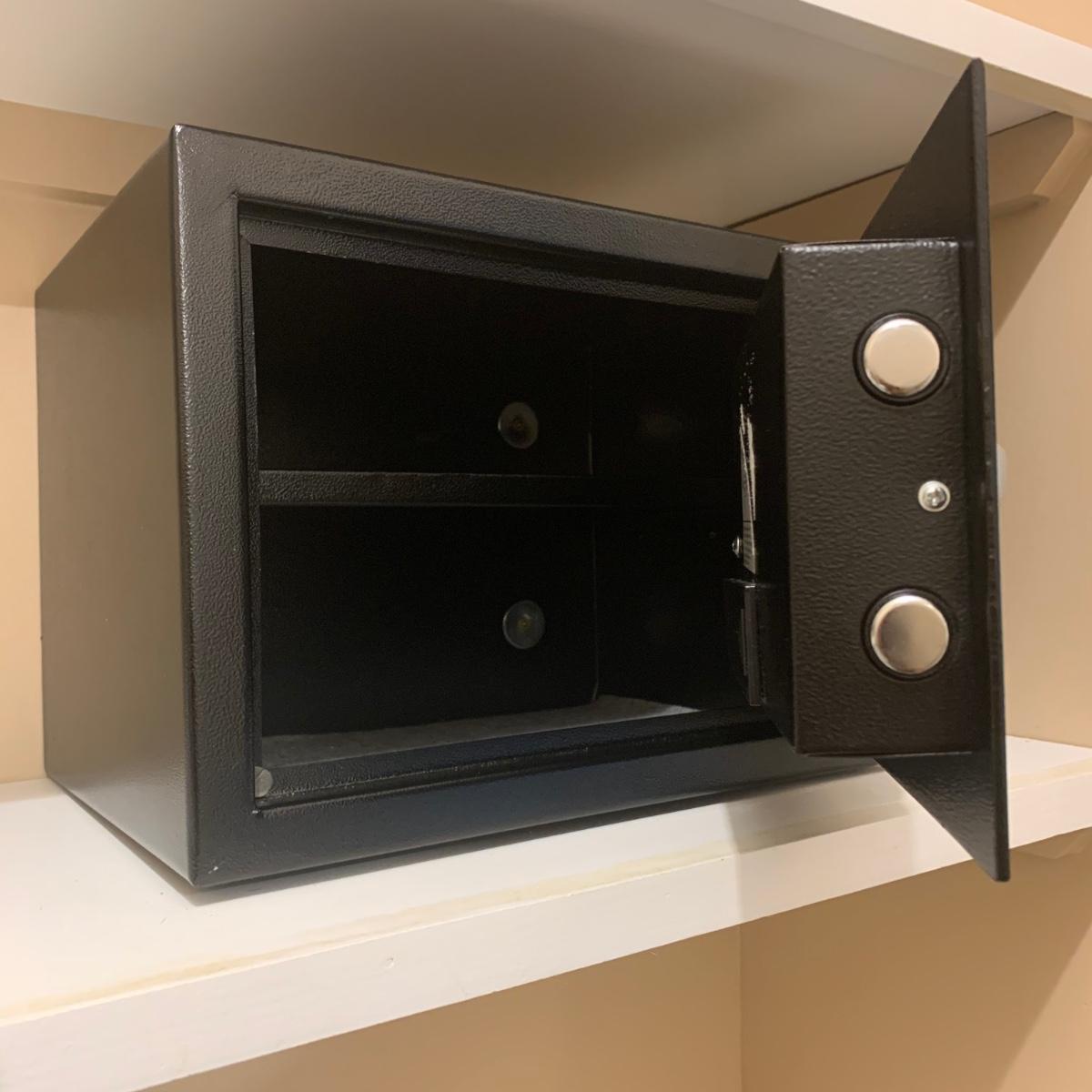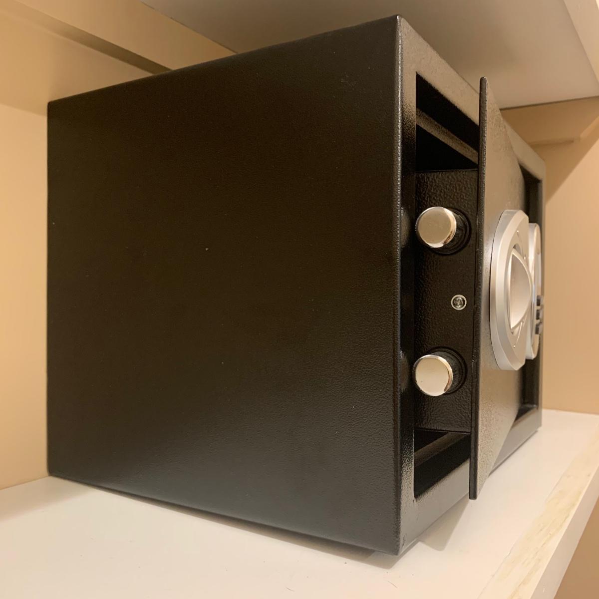Digital safe deposit box with code. Black steel safe deposit box with digital keypad. Code unlocks safe and safe locks securely. Safe measures 14” x 10” x 10”H. Please note that this safe is secured to the wall. Winning bidder will need a star screwdriver to dismount box.
