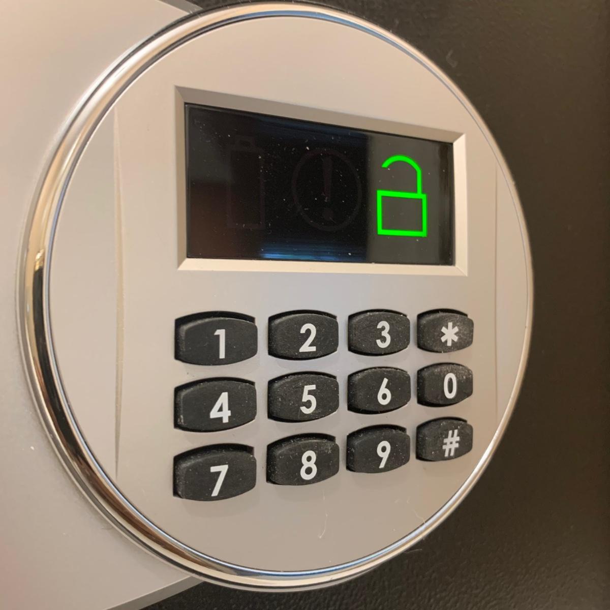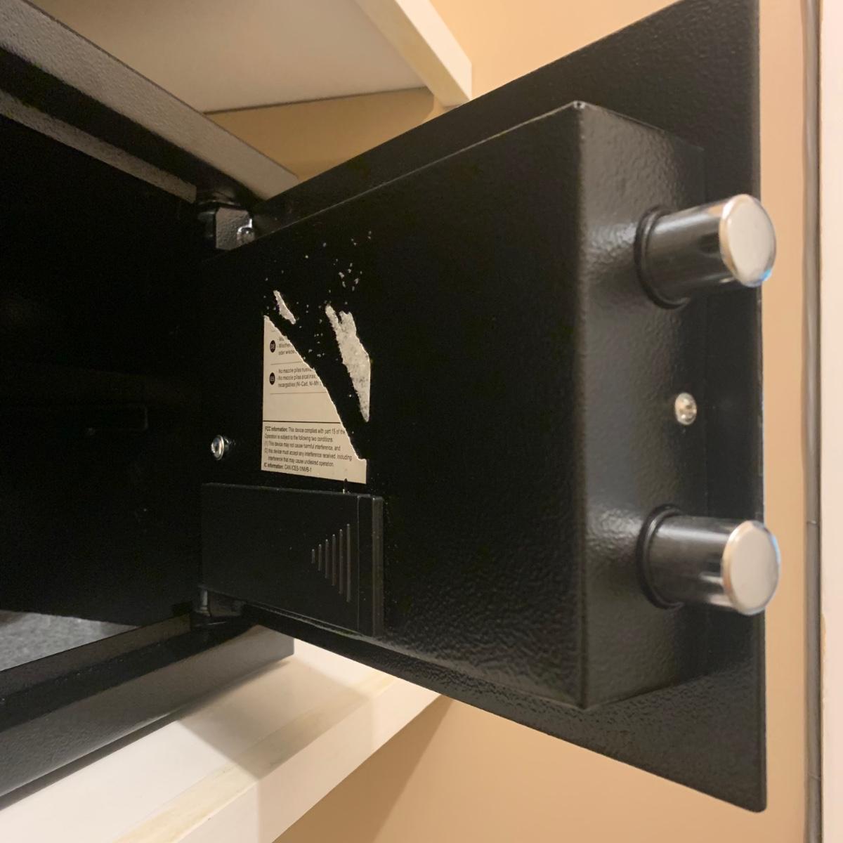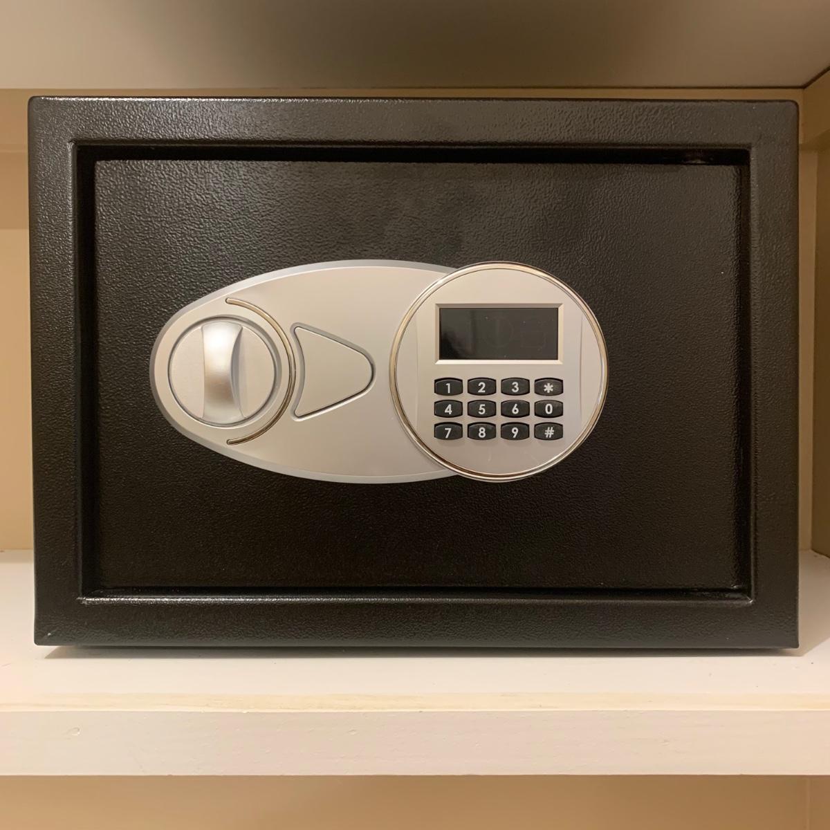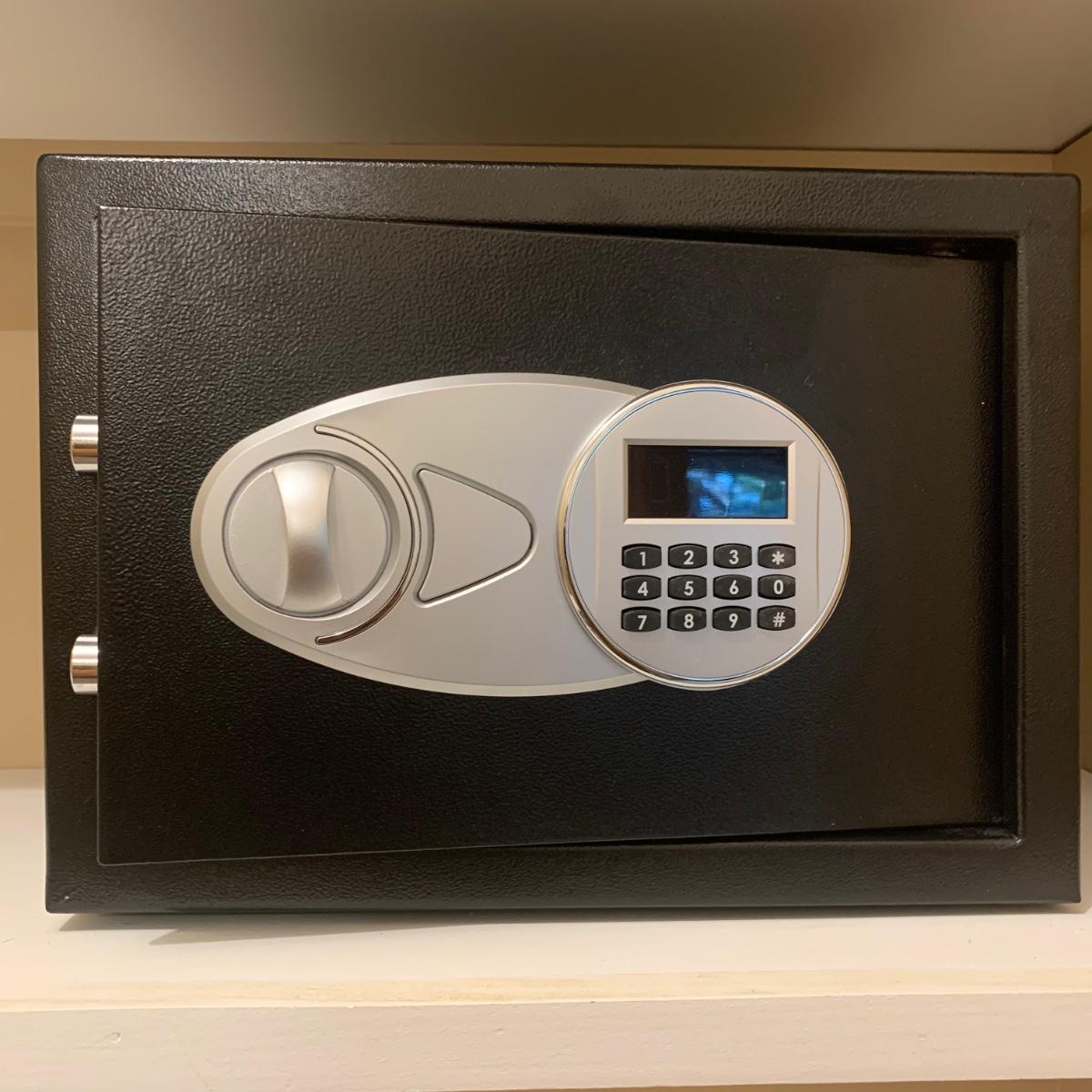 Digital safe deposit box with code. Black steel safe deposit box with digital keypad. Code unlocks safe and safe locks securely. Safe measures 14” x 10” x 10”H. Please note that this safe is secured to the wall. Winning bidder will need a star screwdriver to dismount box.