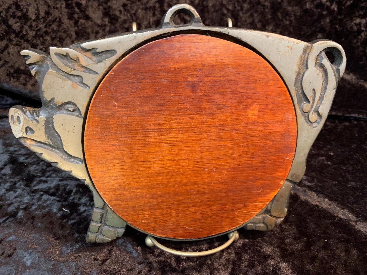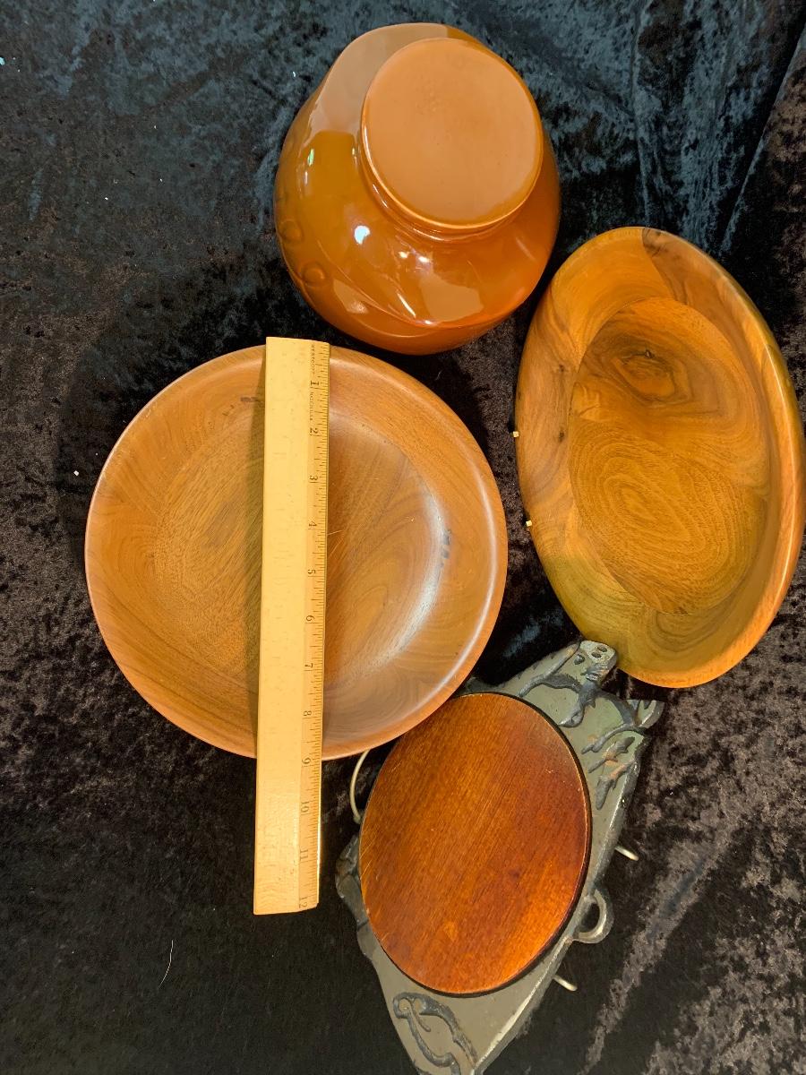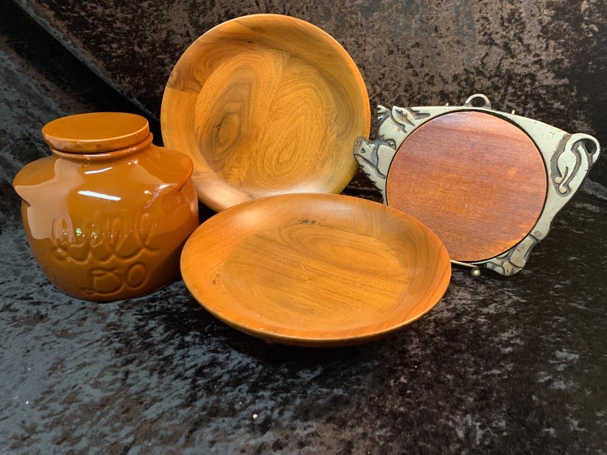 Dill Pickle Crock, Pig Trivet l and (2) footed wood bowls
