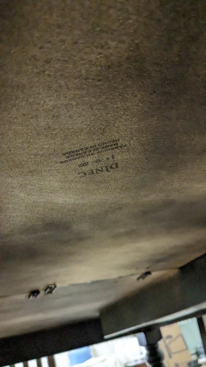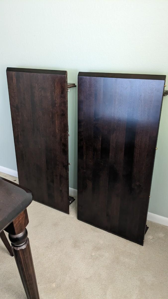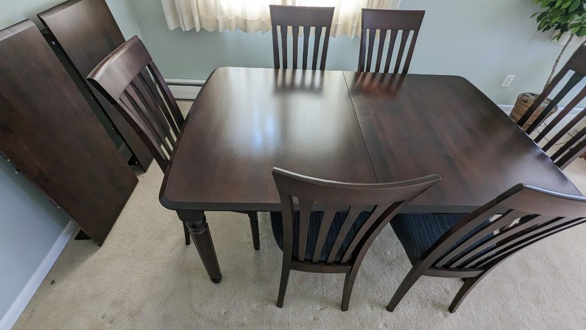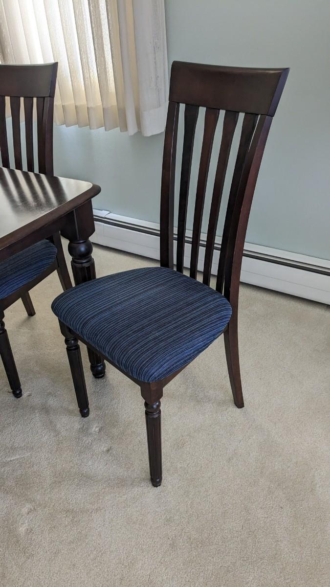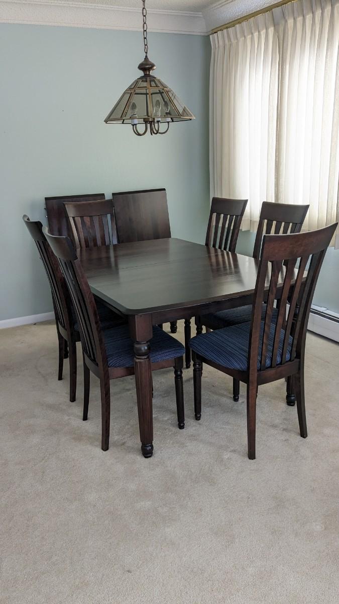 a gorgeous dark wood 62.25"x42"x29.5" 6 person dining set. includes (2) approx. 19"x 41.75" leaves. Chairs are 19.5"x17"x41", seat sits 19" from ground with lovely blue seats. Very minimal flaws to this set. No heat marks, gouging, or major flaws. Nearly new. No shipping. diningroom