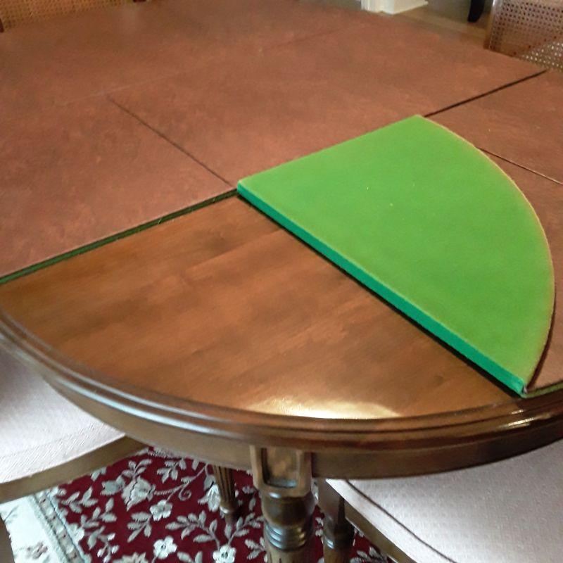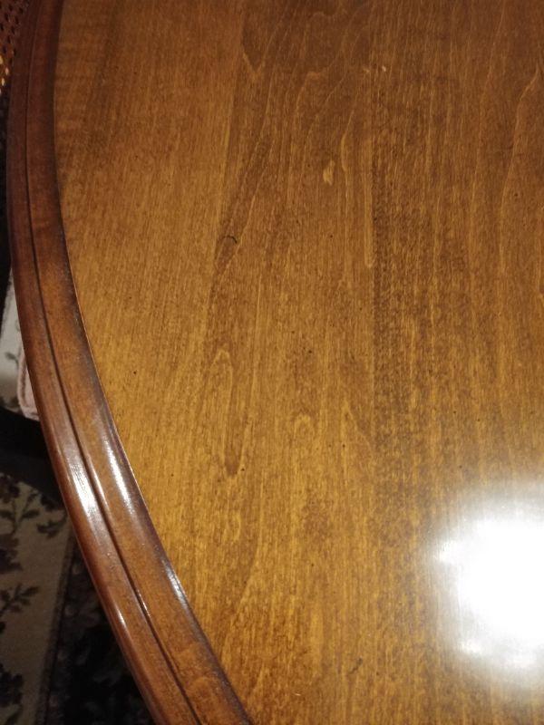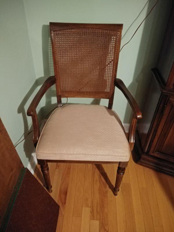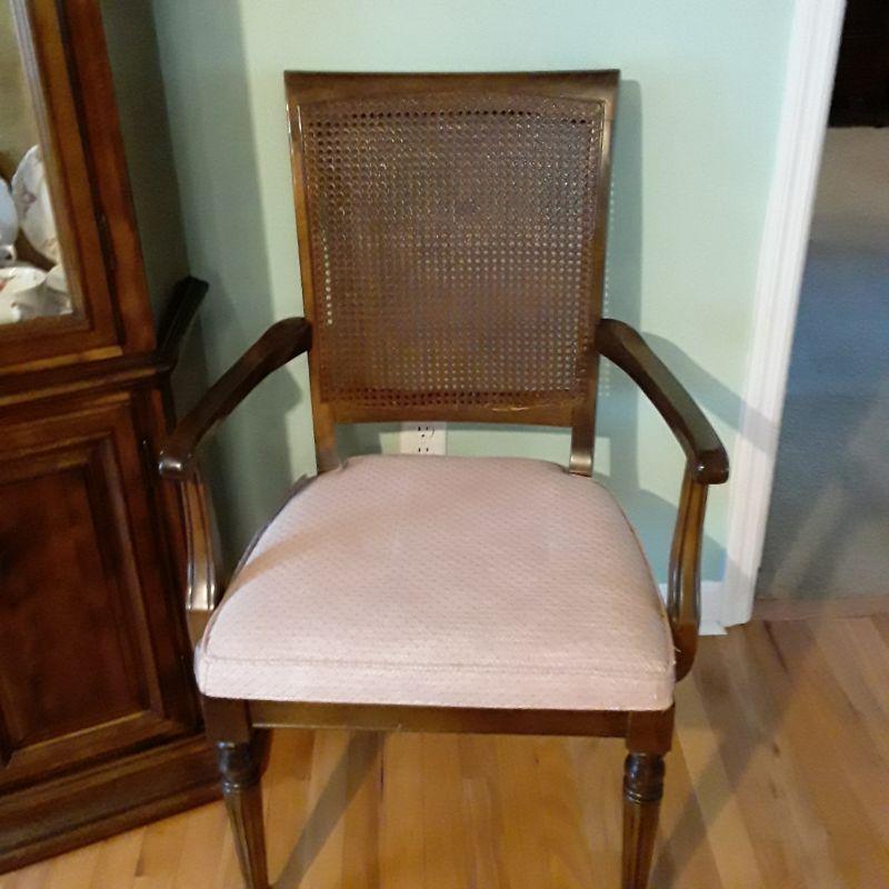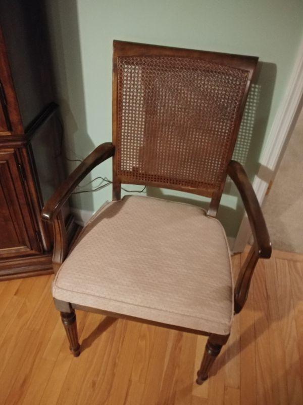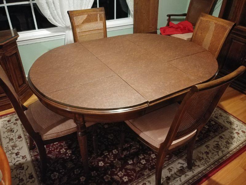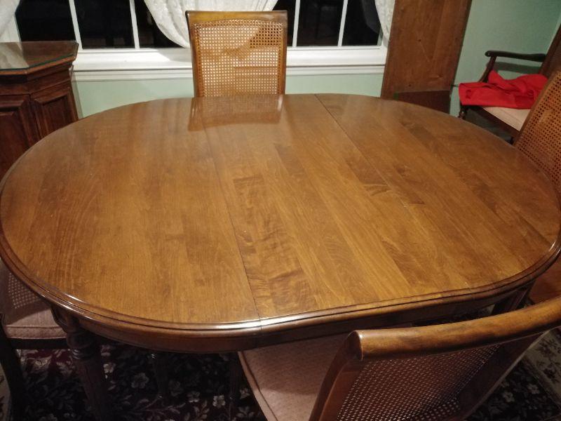 Ethan Allan Table and Chairs ONLY includes 6 Cain back chairs with padded seat, table with extra leaf and pads. In very good condition Table measures 44"w x 61"l x 29"t ~ leaf measures 18"w