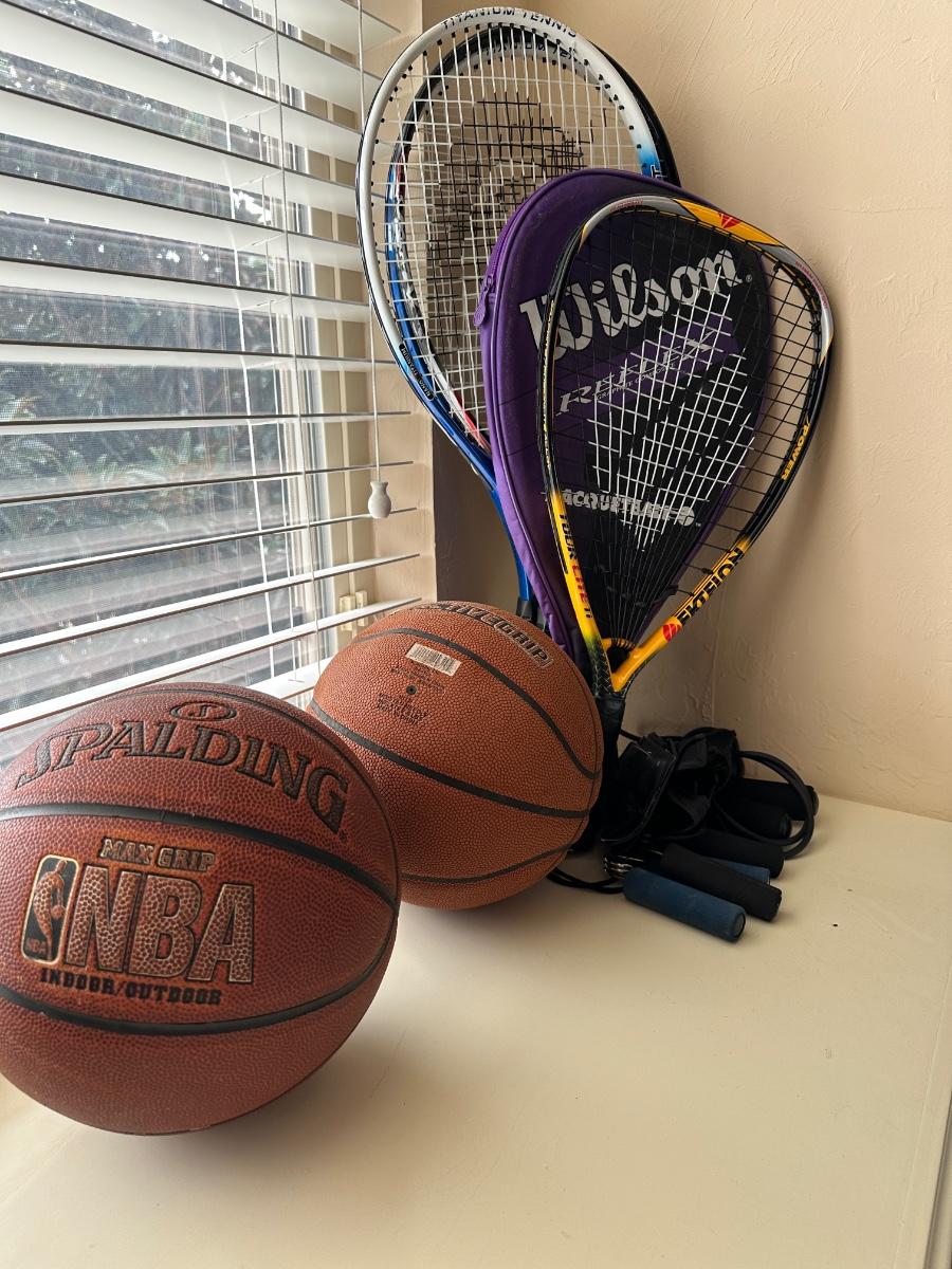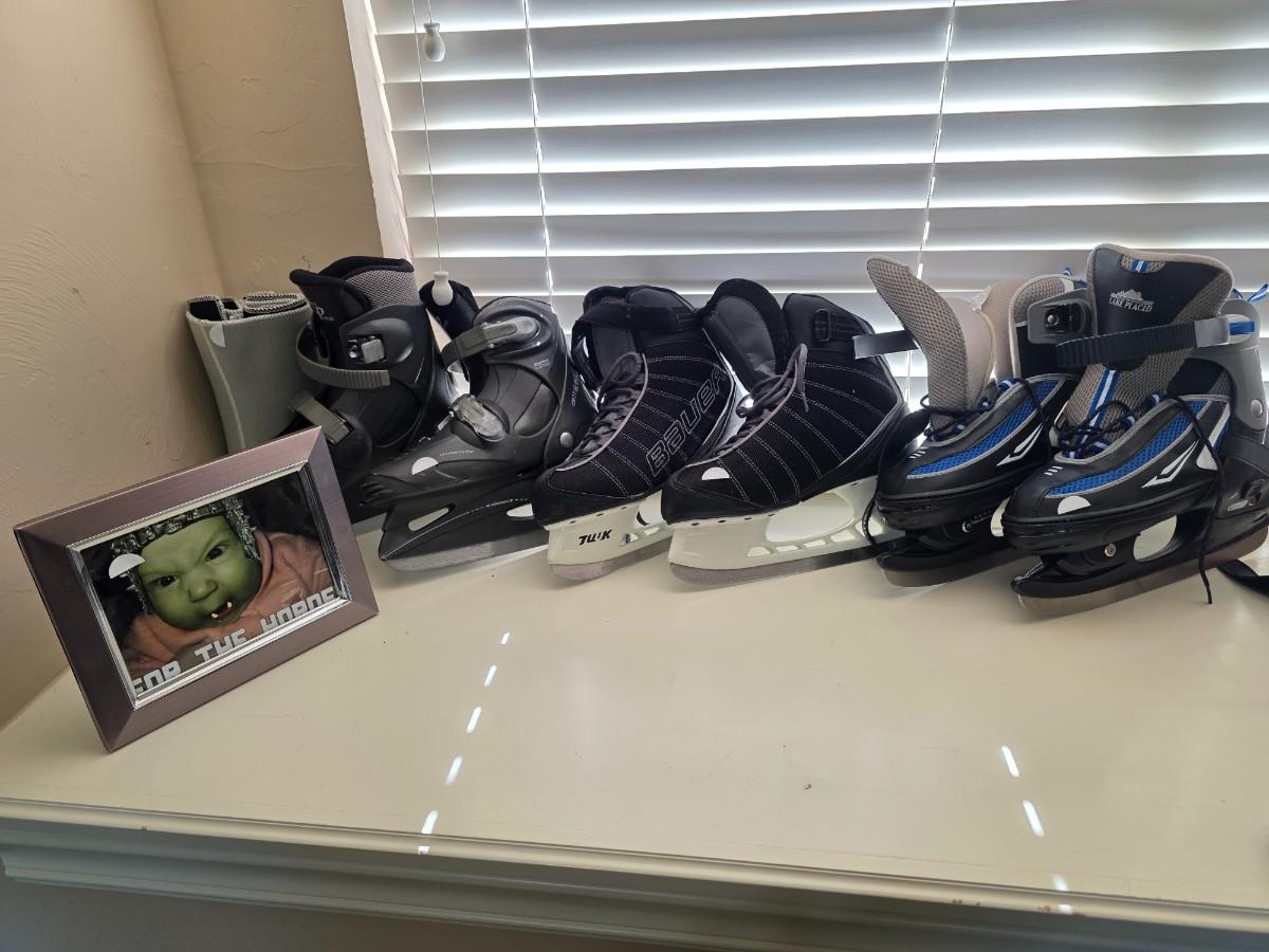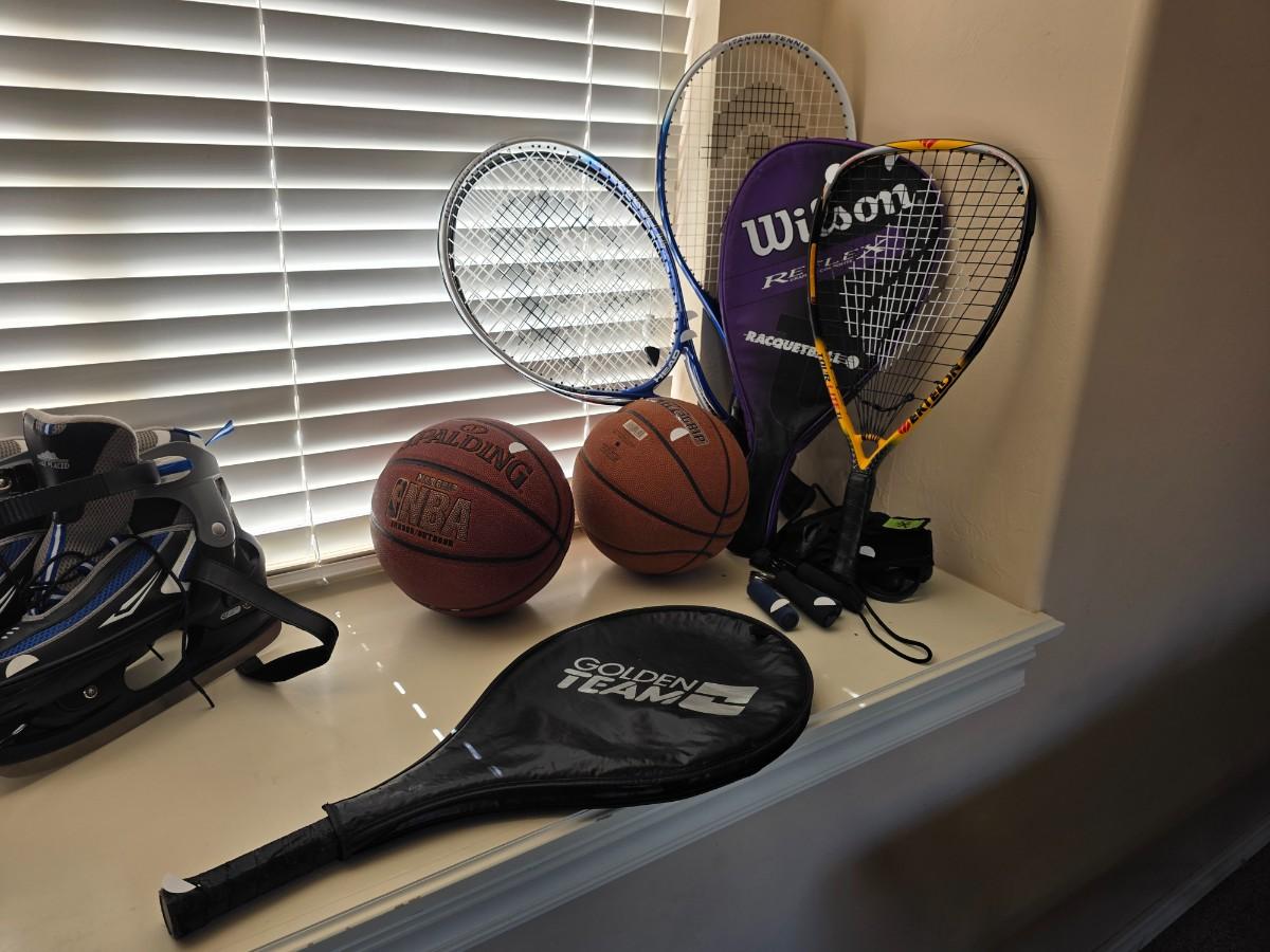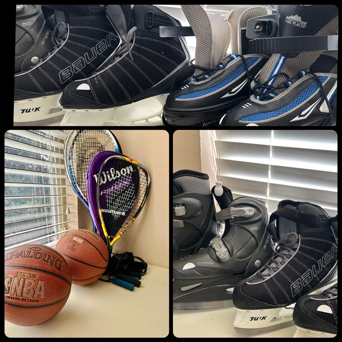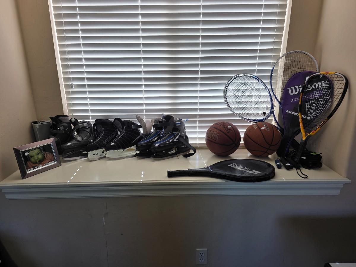 There is a large selection of sporting items in this Online sale. You are bidding on all the items in the photo. Everything in the photo is included except any displays and items used for sizing. We do not have time to measure individual items