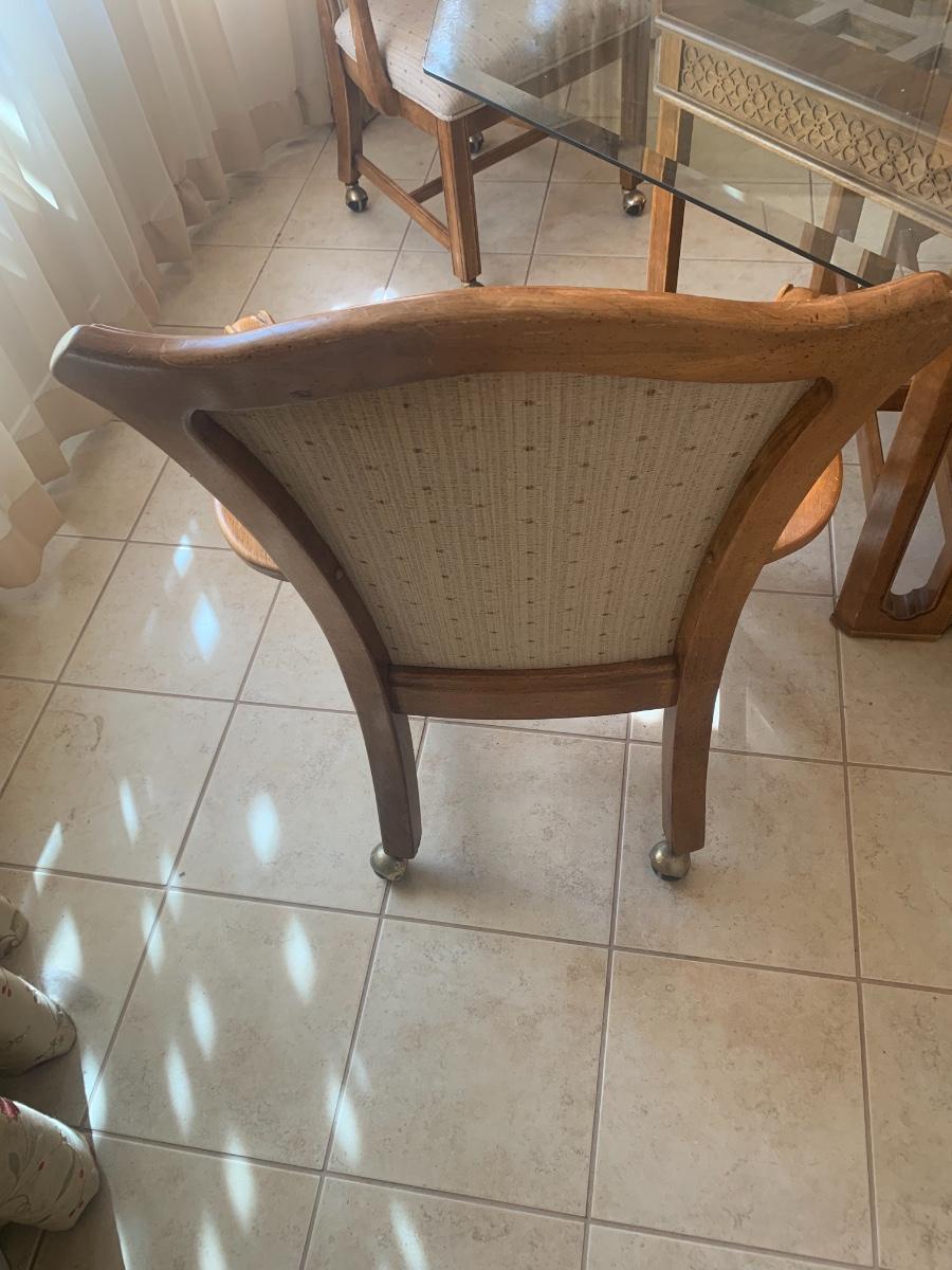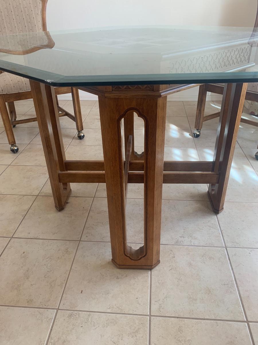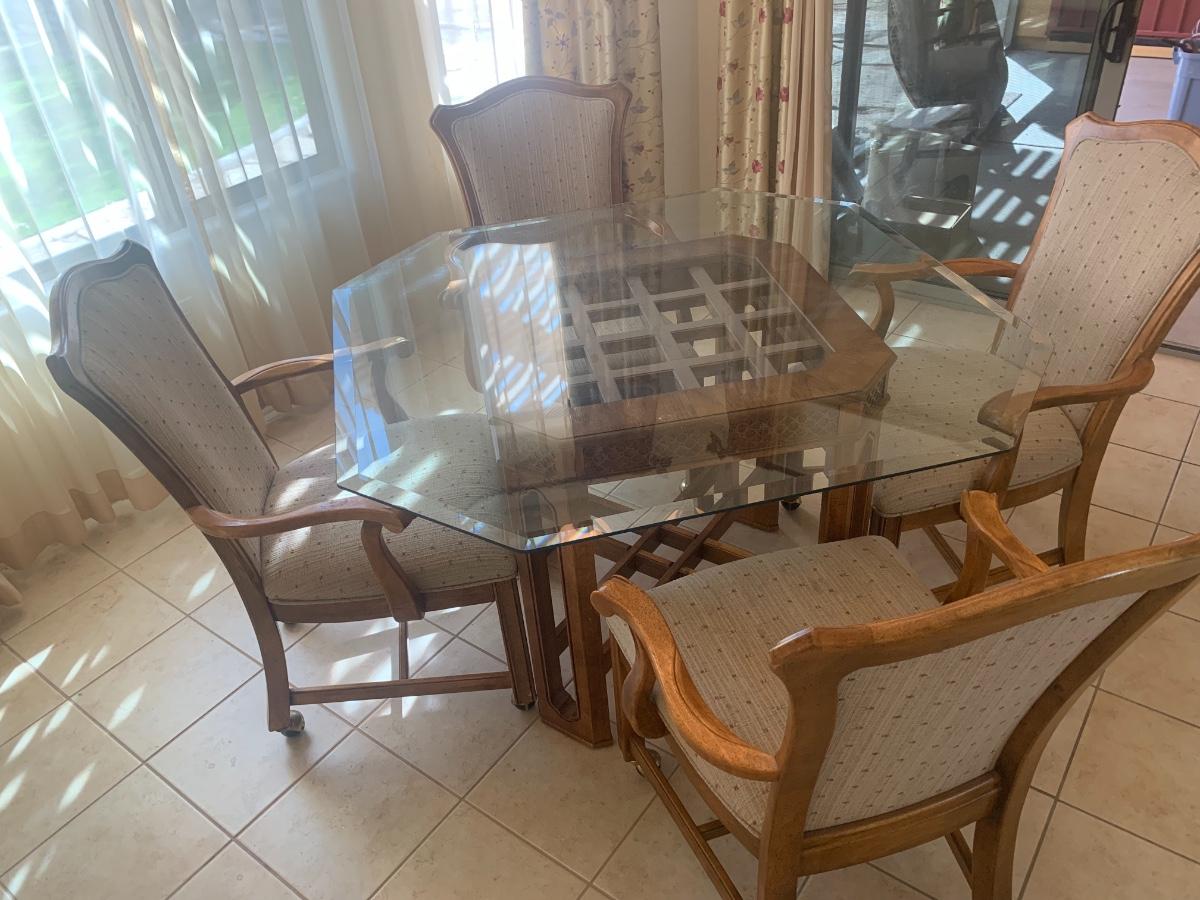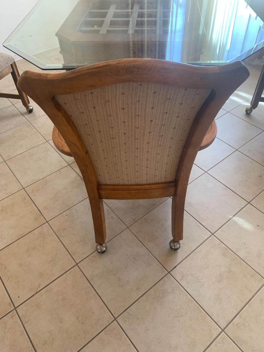 1980s dining set with carved lattice wood base and glass top. (One small chip on one corner of glass). Includes 4 upholstered chairs (good condition, one chair has a few very minor stains) with arms and casters. Table top 46” x 46” and 29.5” tall. Chair back height is 39”.