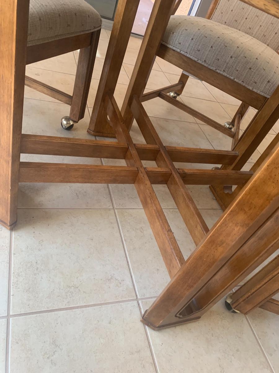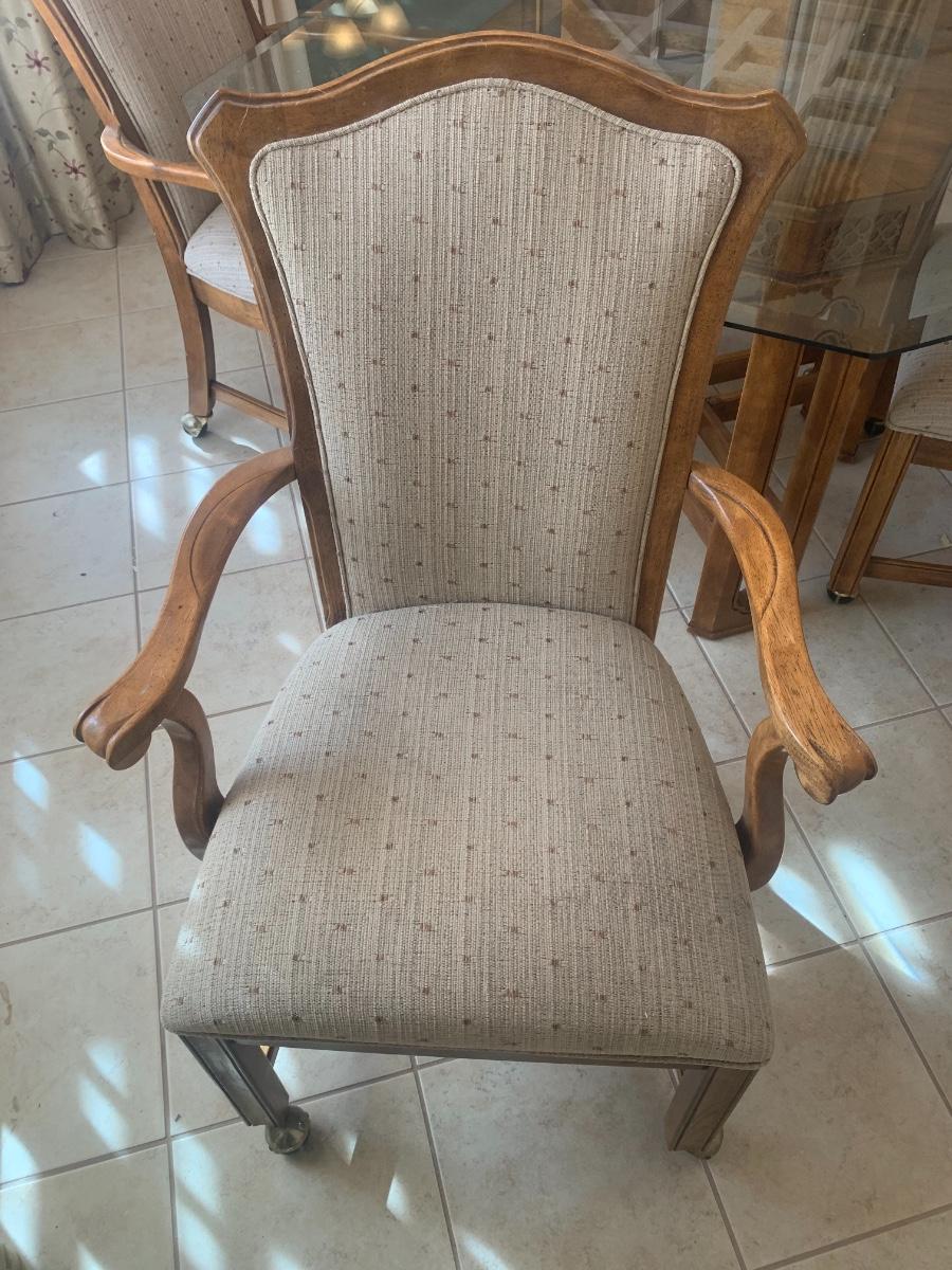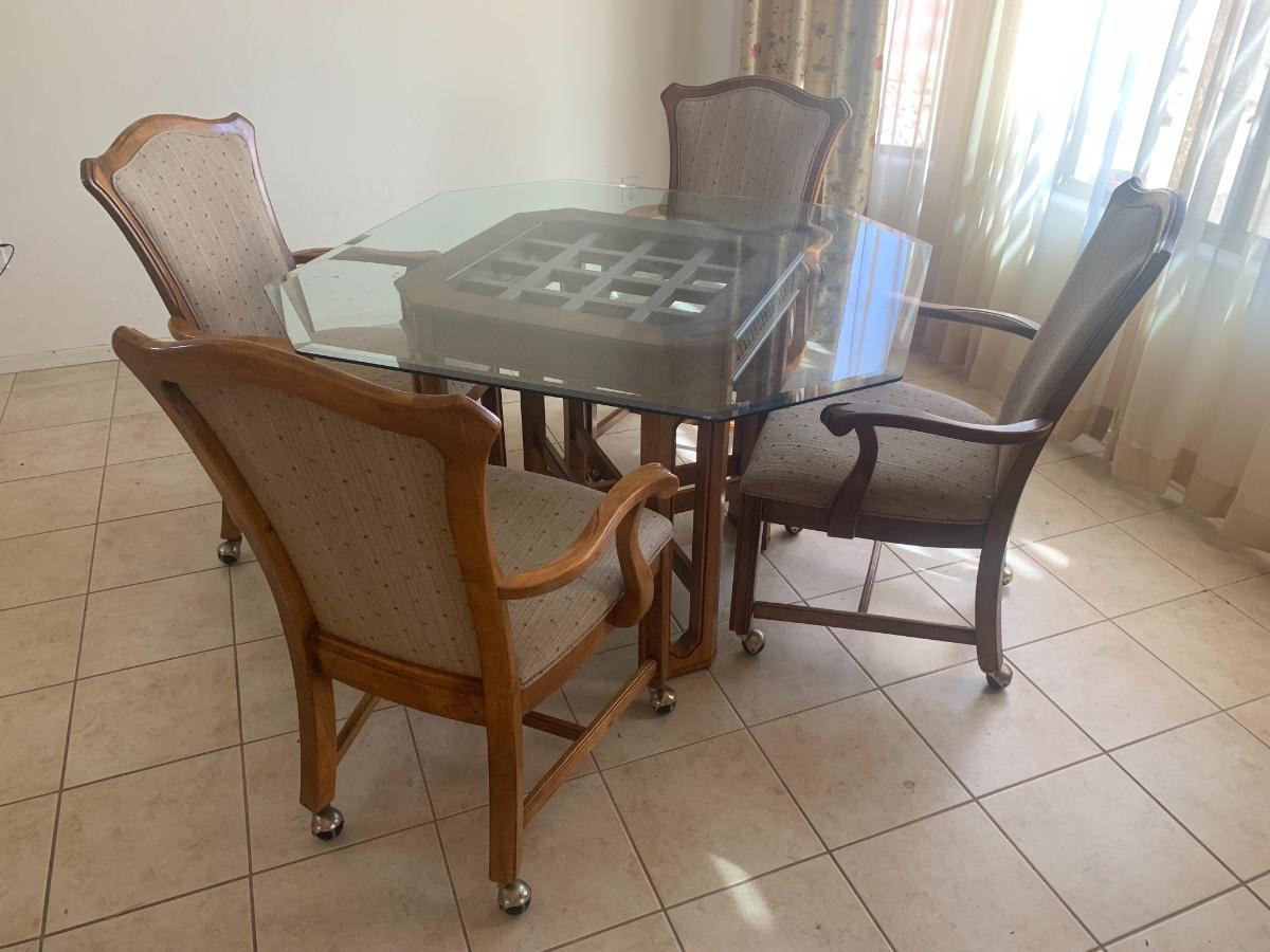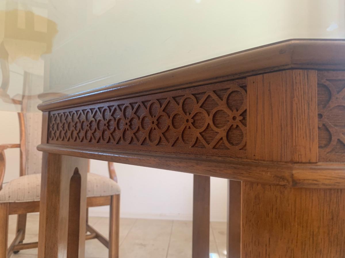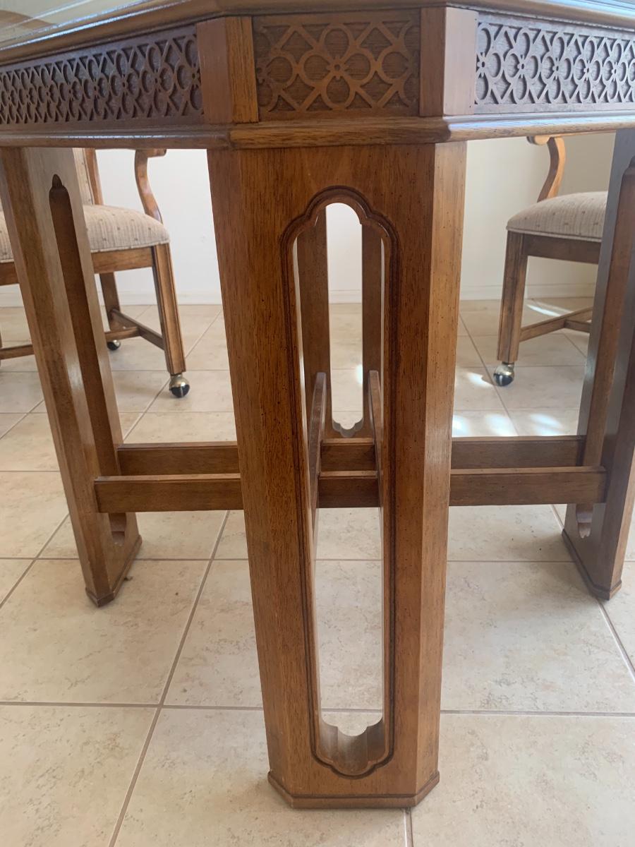 1980s dining set with carved lattice wood base and glass top. (One small chip on one corner of glass). Includes 4 upholstered chairs (good condition, one chair has a few very minor stains) with arms and casters. Table top 46” x 46” and 29.5” tall. Chair back height is 39”.