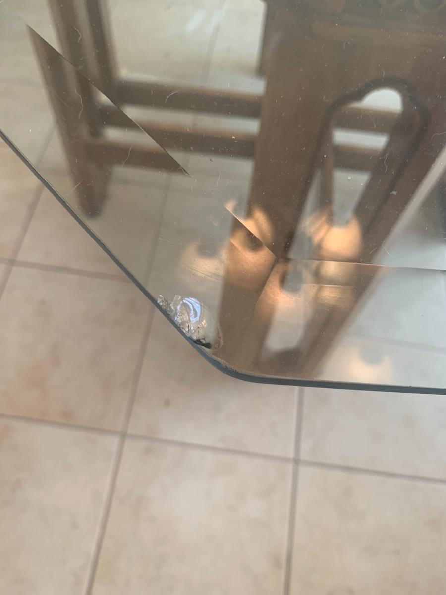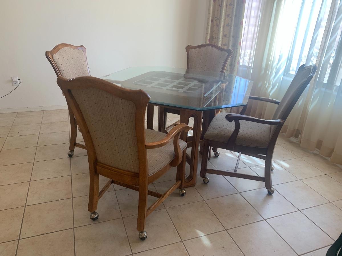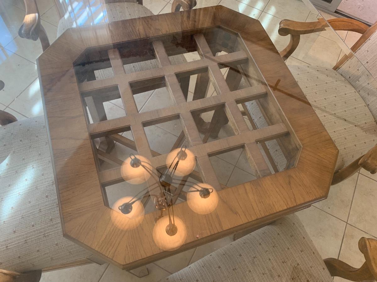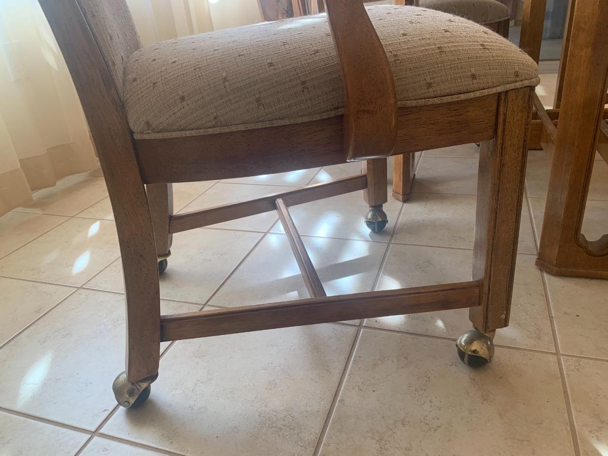 1980s dining set with carved lattice wood base and glass top. (One small chip on one corner of glass). Includes 4 upholstered chairs (good condition, one chair has a few very minor stains) with arms and casters. Table top 46” x 46” and 29.5” tall. Chair back height is 39”.