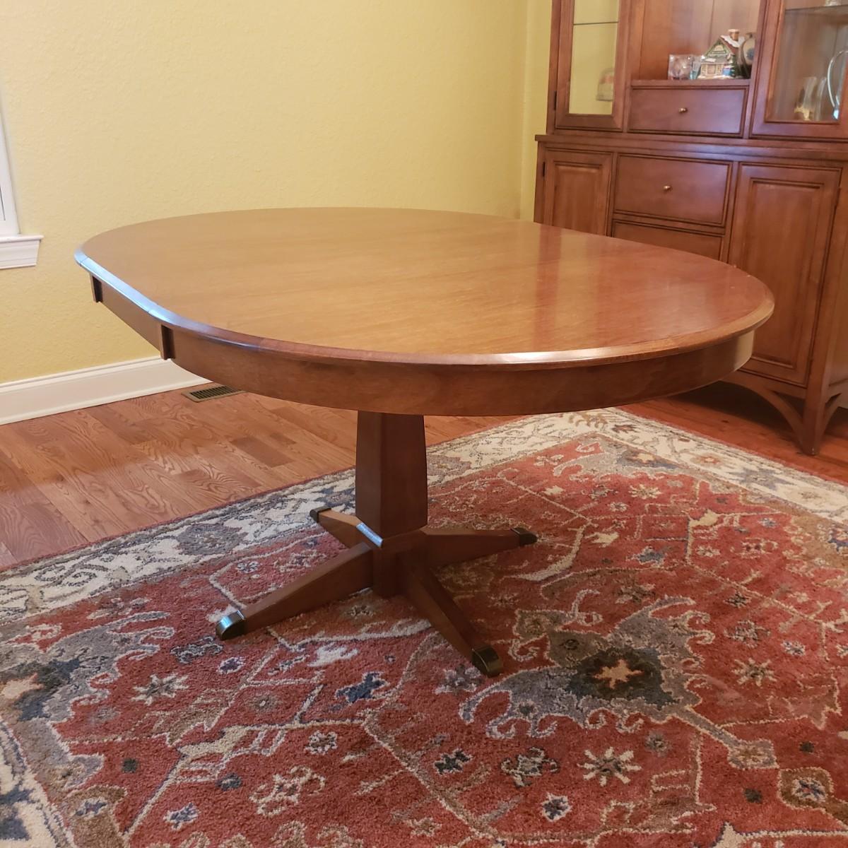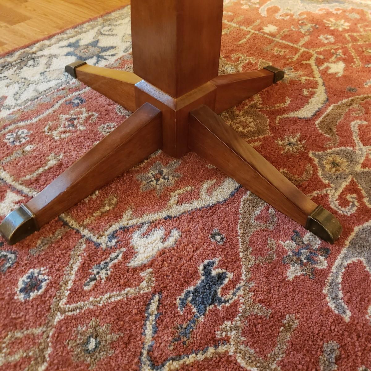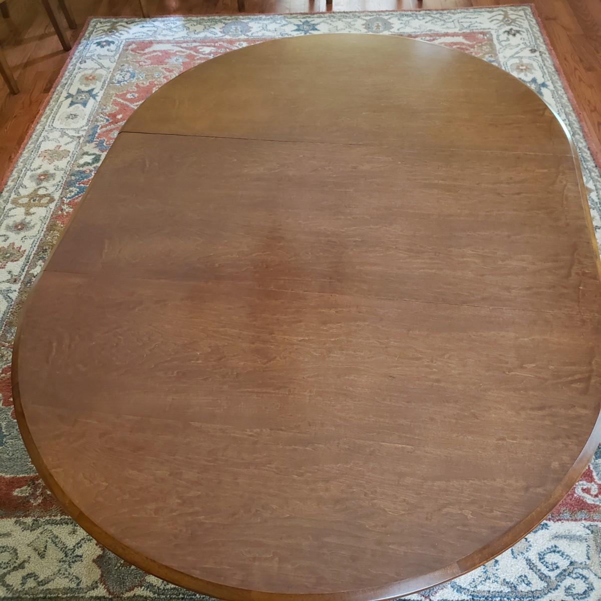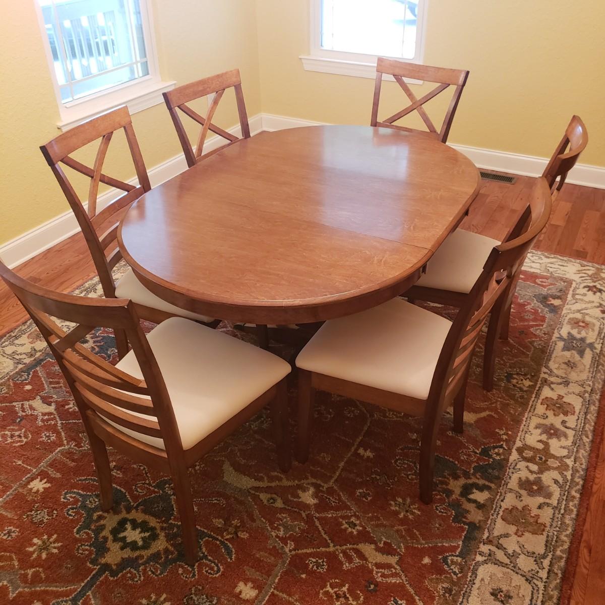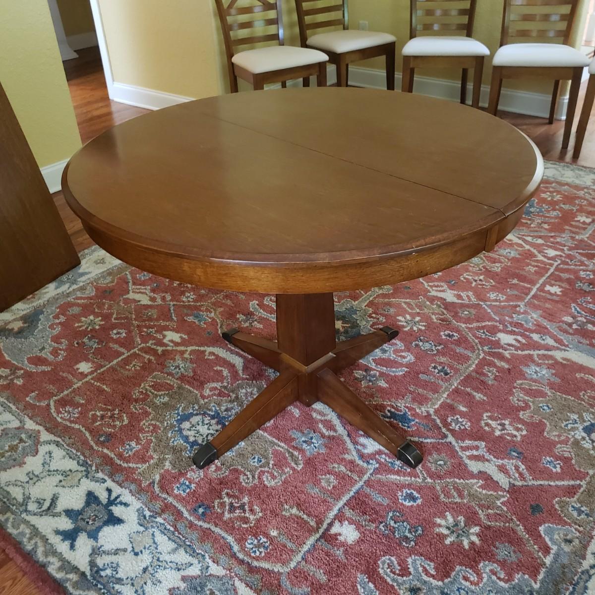 This lot has a wooden table with one leaf (18" x 42") and six matching chairs. The table without the leaf measures 42"D x 30"H. The table has metal on the feet. The chairs measure 18" x 19" x 39"H. Four of the chairs have spots on the material which the tag states is a polyester blend. Rug not included.