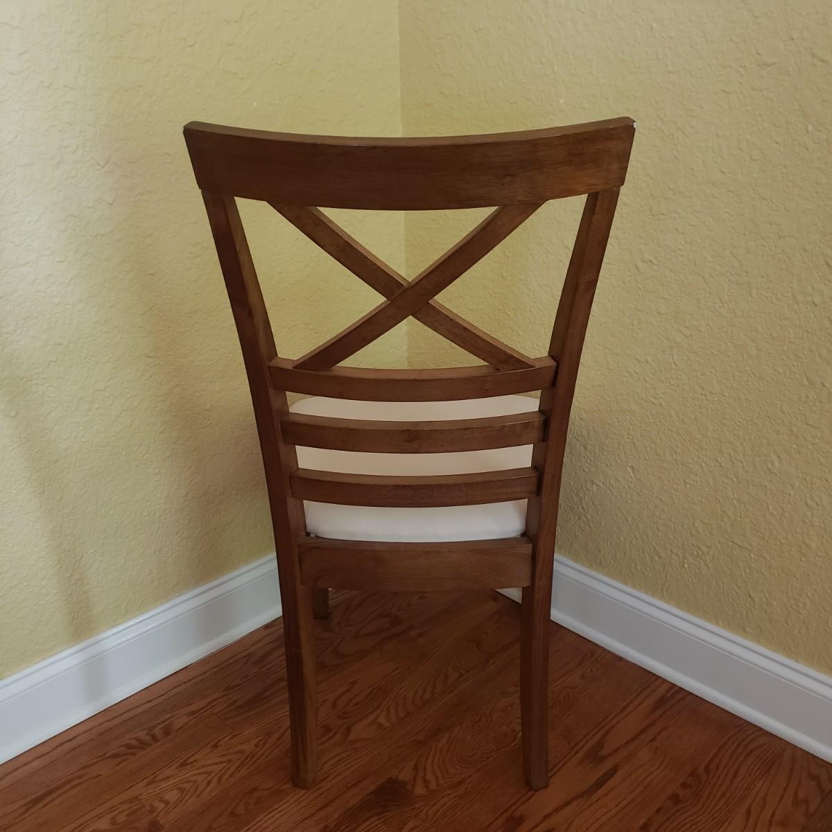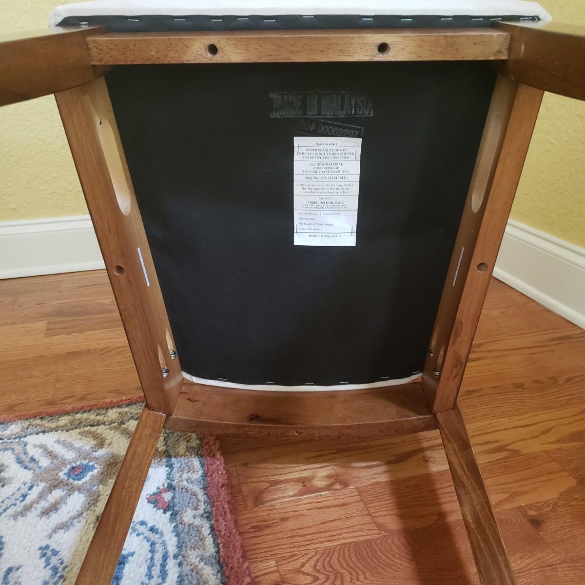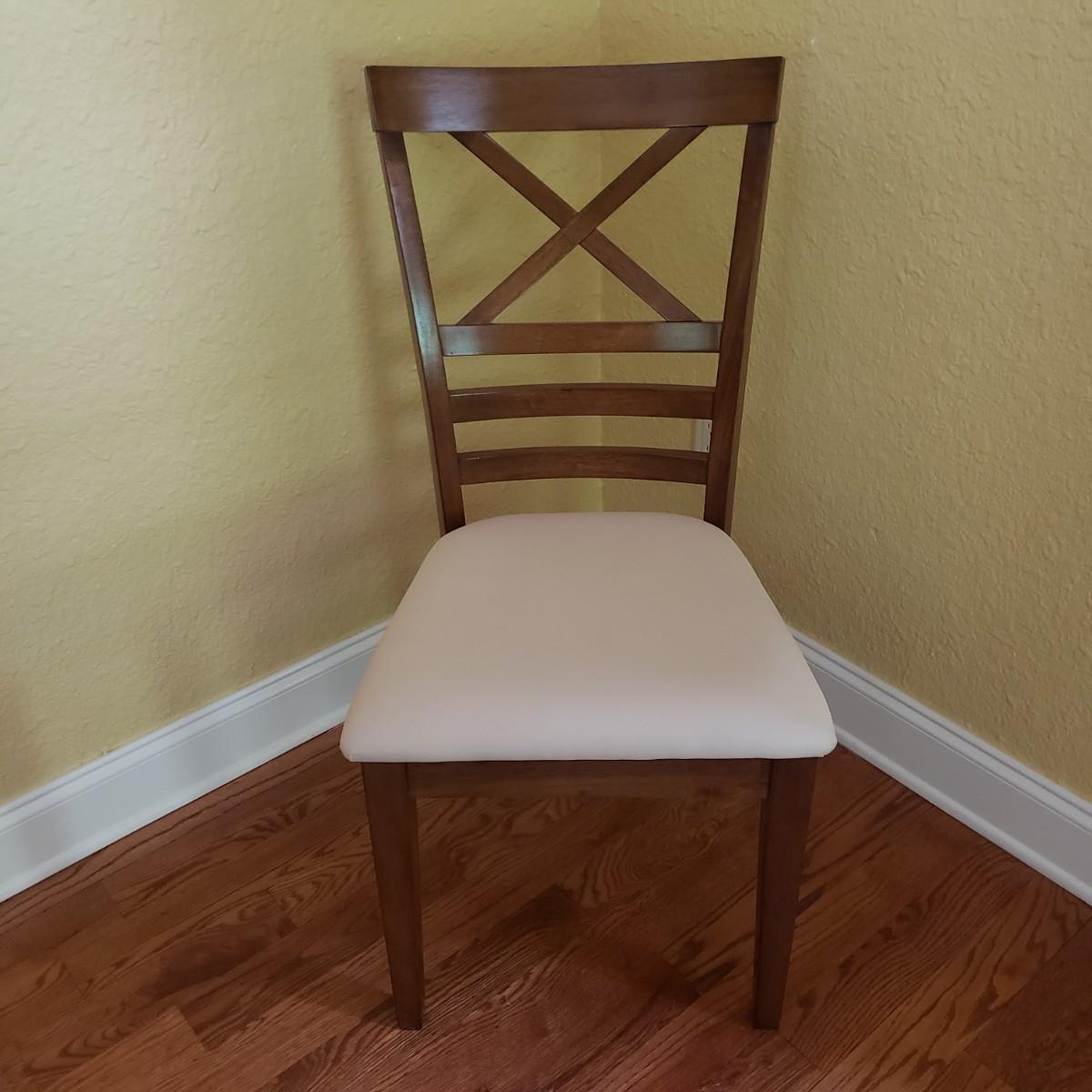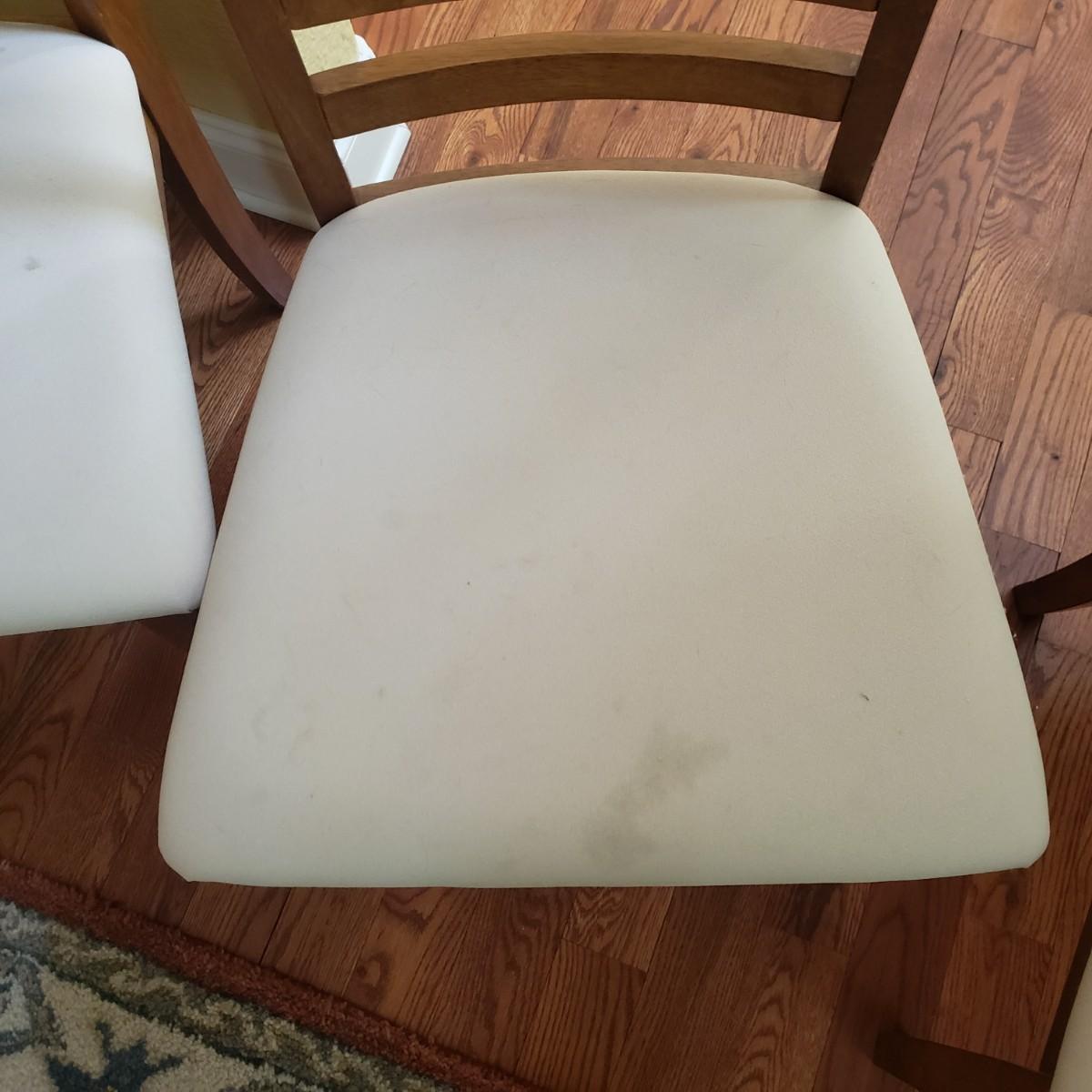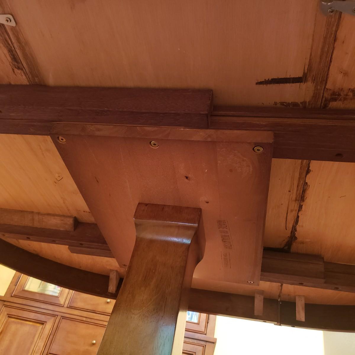 This lot has a wooden table with one leaf (18" x 42") and six matching chairs. The table without the leaf measures 42"D x 30"H. The table has metal on the feet. The chairs measure 18" x 19" x 39"H. Four of the chairs have spots on the material which the tag states is a polyester blend. Rug not included.