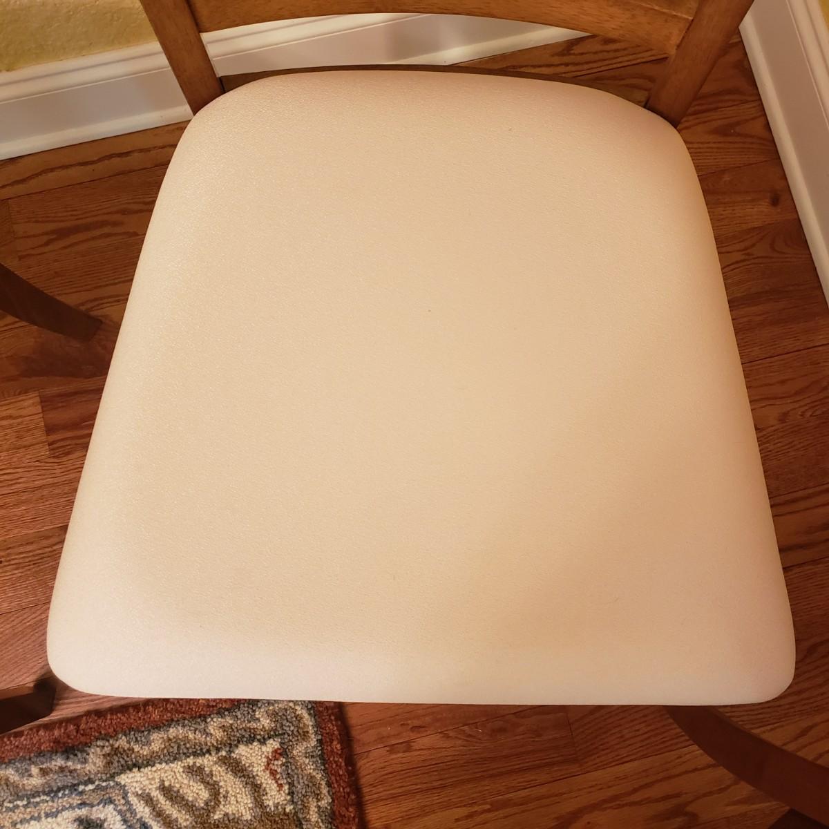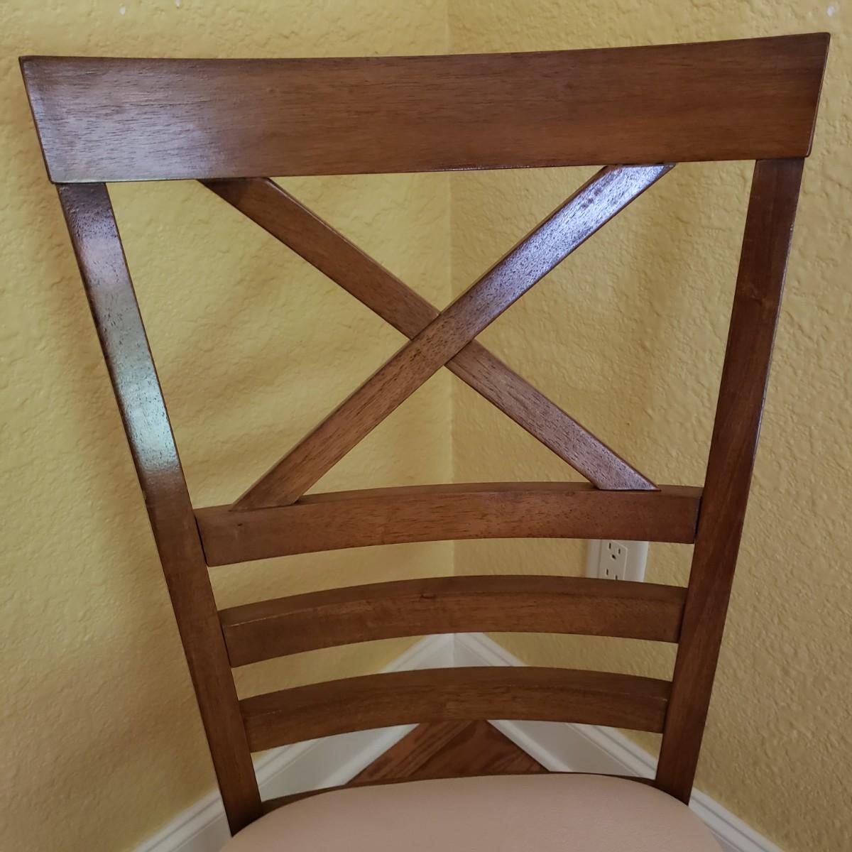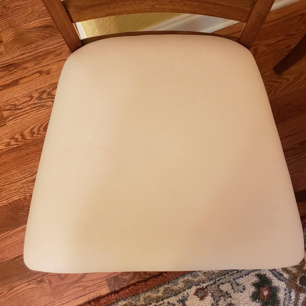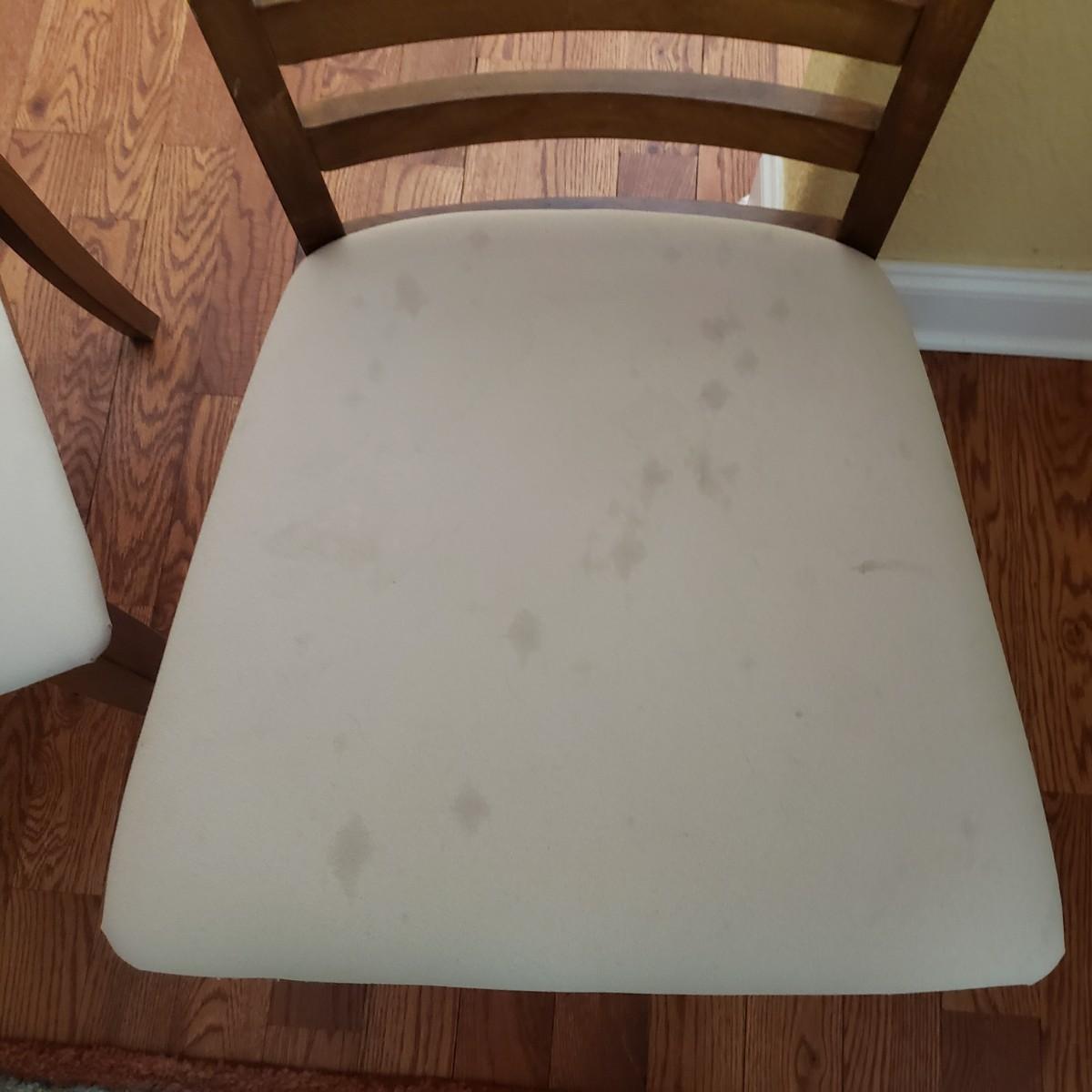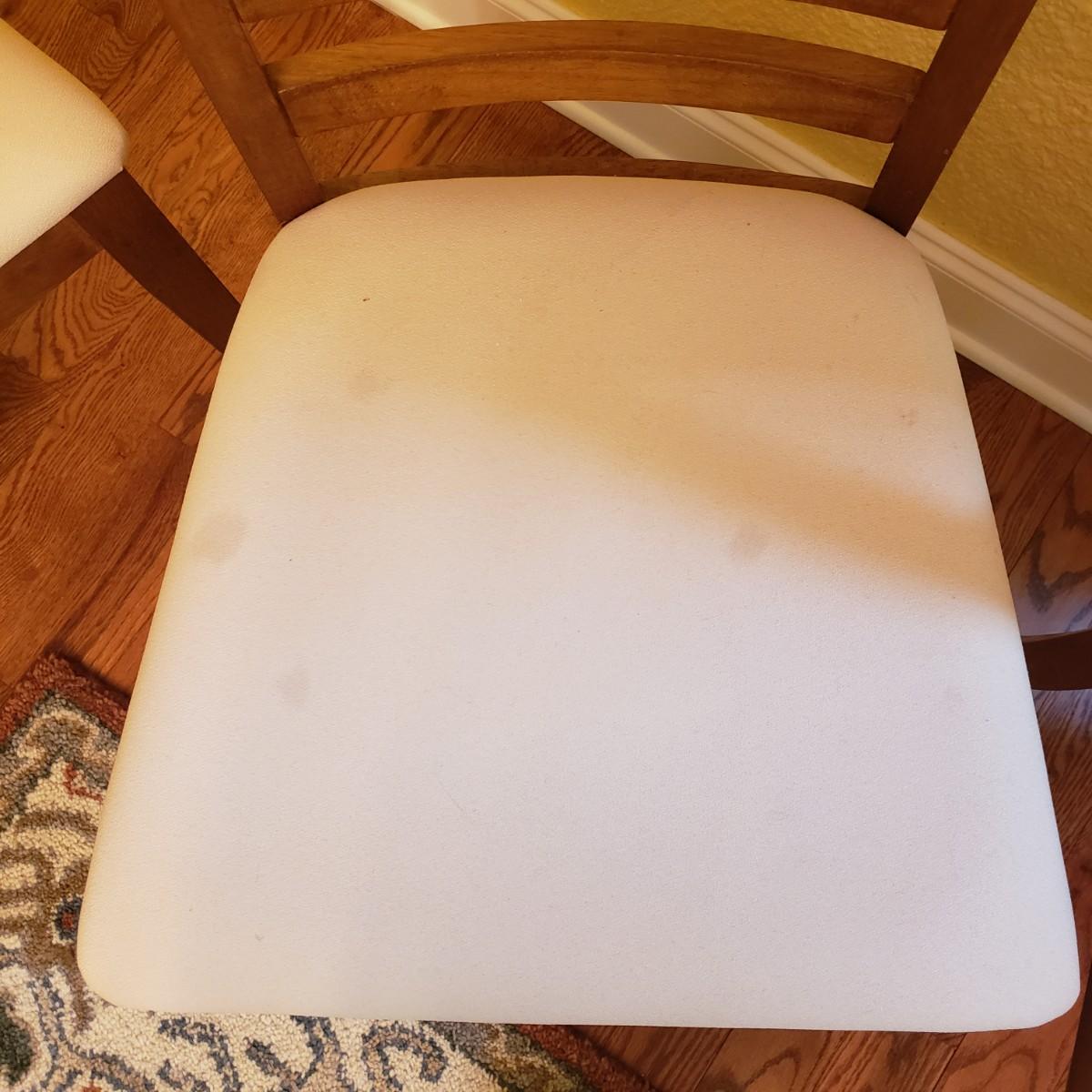 This lot has a wooden table with one leaf (18" x 42") and six matching chairs. The table without the leaf measures 42"D x 30"H. The table has metal on the feet. The chairs measure 18" x 19" x 39"H. Four of the chairs have spots on the material which the tag states is a polyester blend. Rug not included.