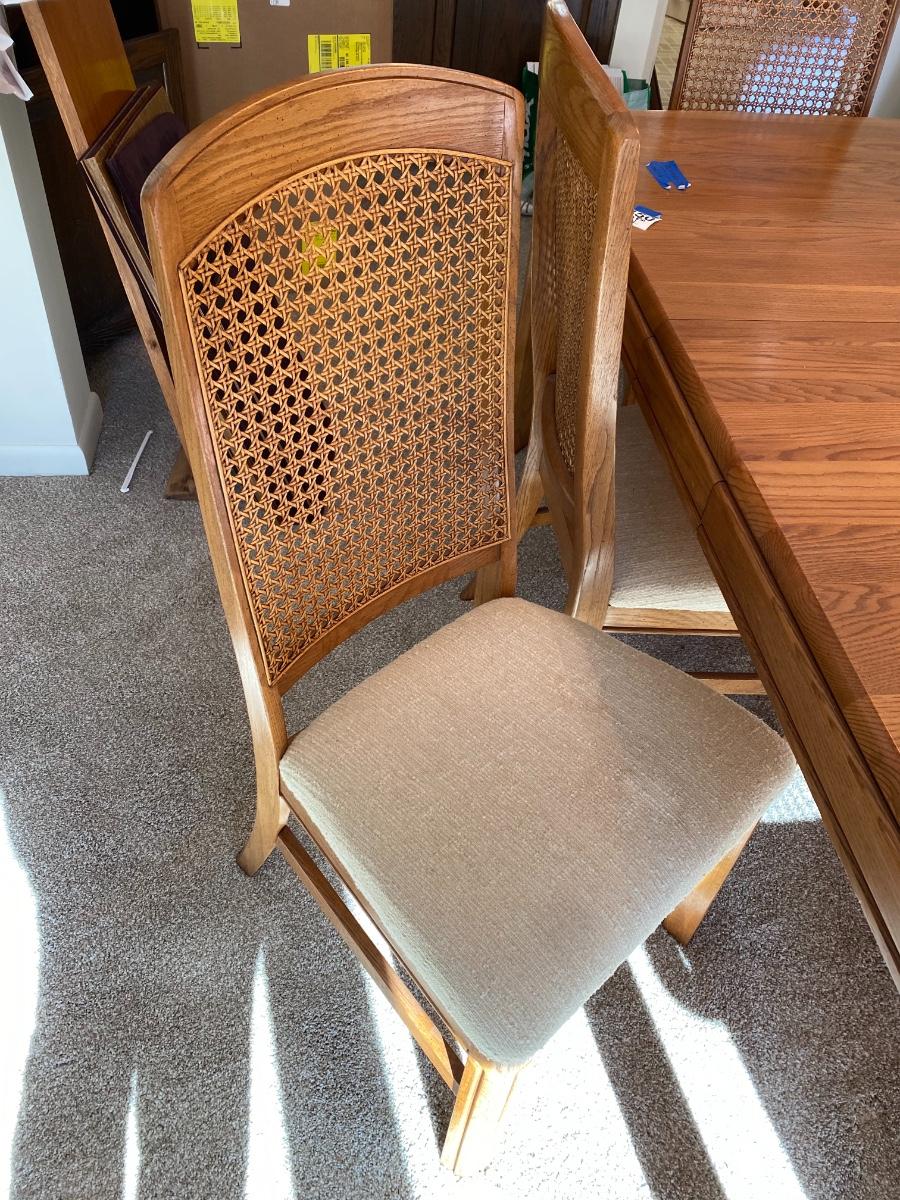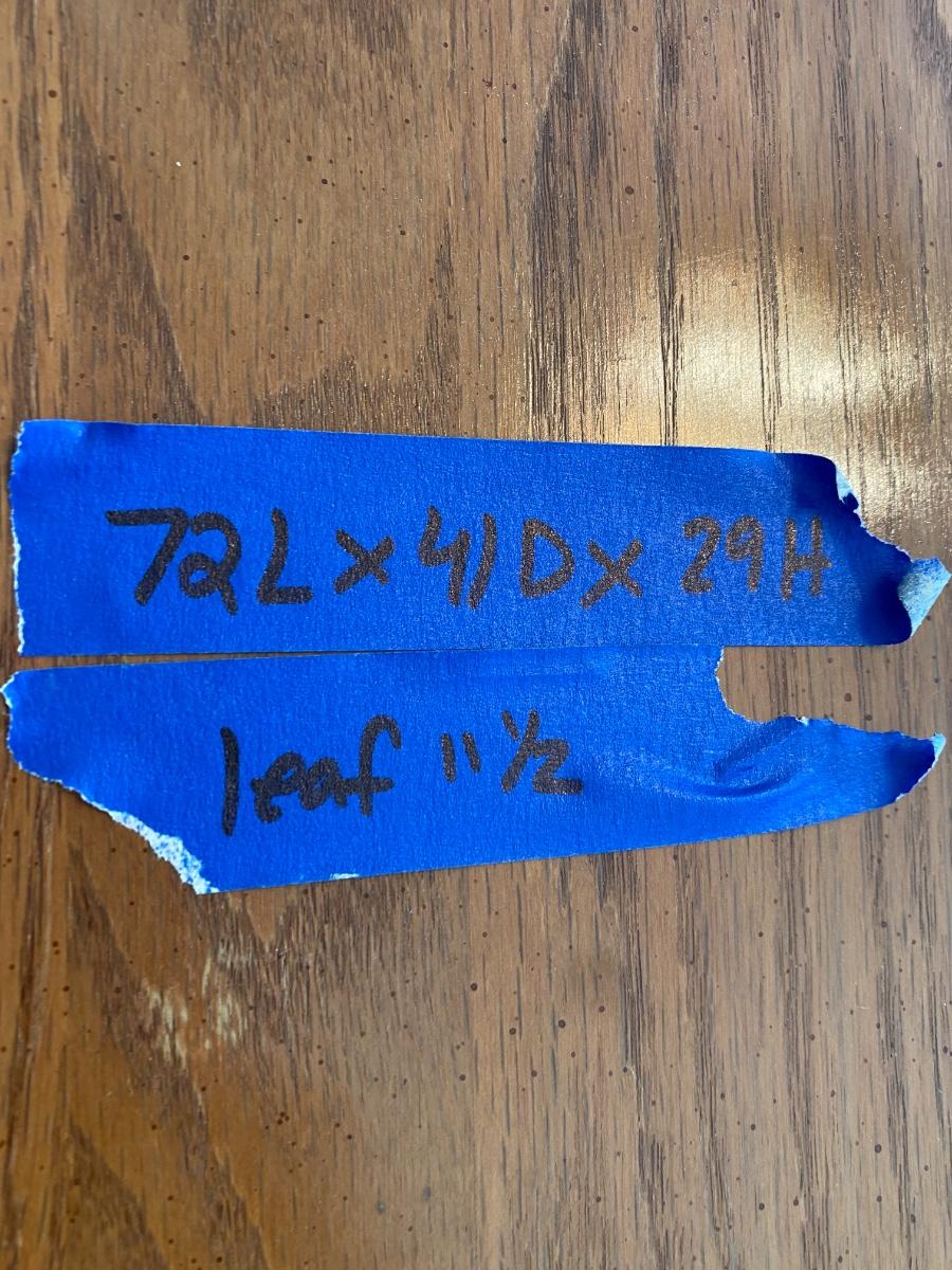 72”long x 41”deep x 29”high. One leaf 11 1/2”wide. Includes 4 side chairs and 2 arm chairs.