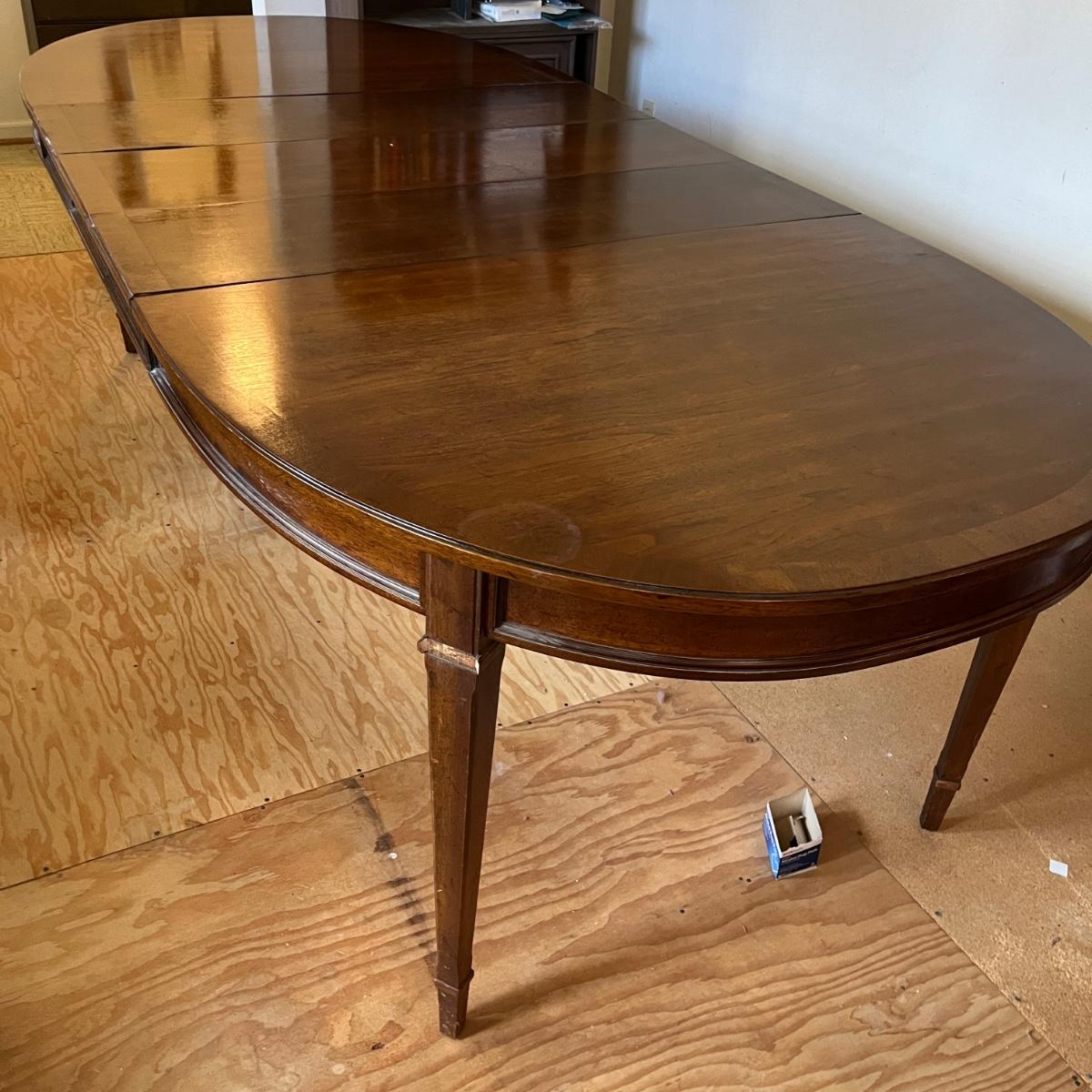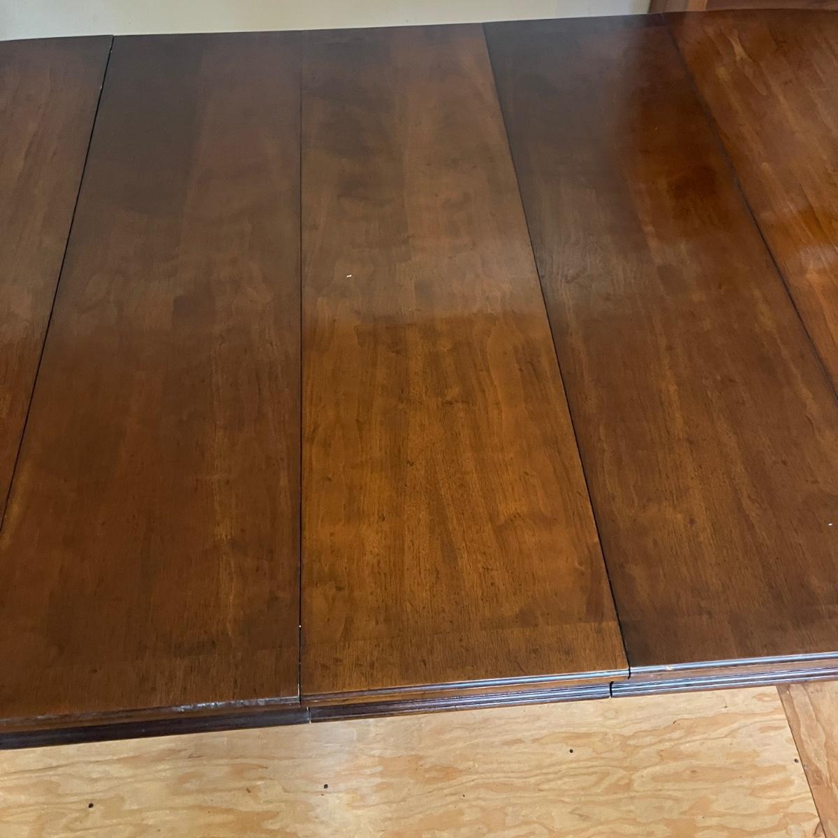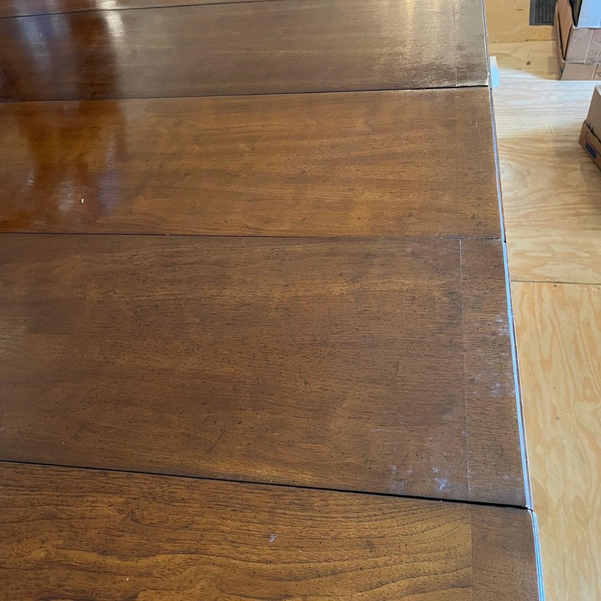 Lot includes a solid wood dining table with veneer. Includes three 12” leaves. Table without leaves measures 44.5” x 64” x 29”. Table has chips and one spot on end that the finish is worn through, see pictures.
