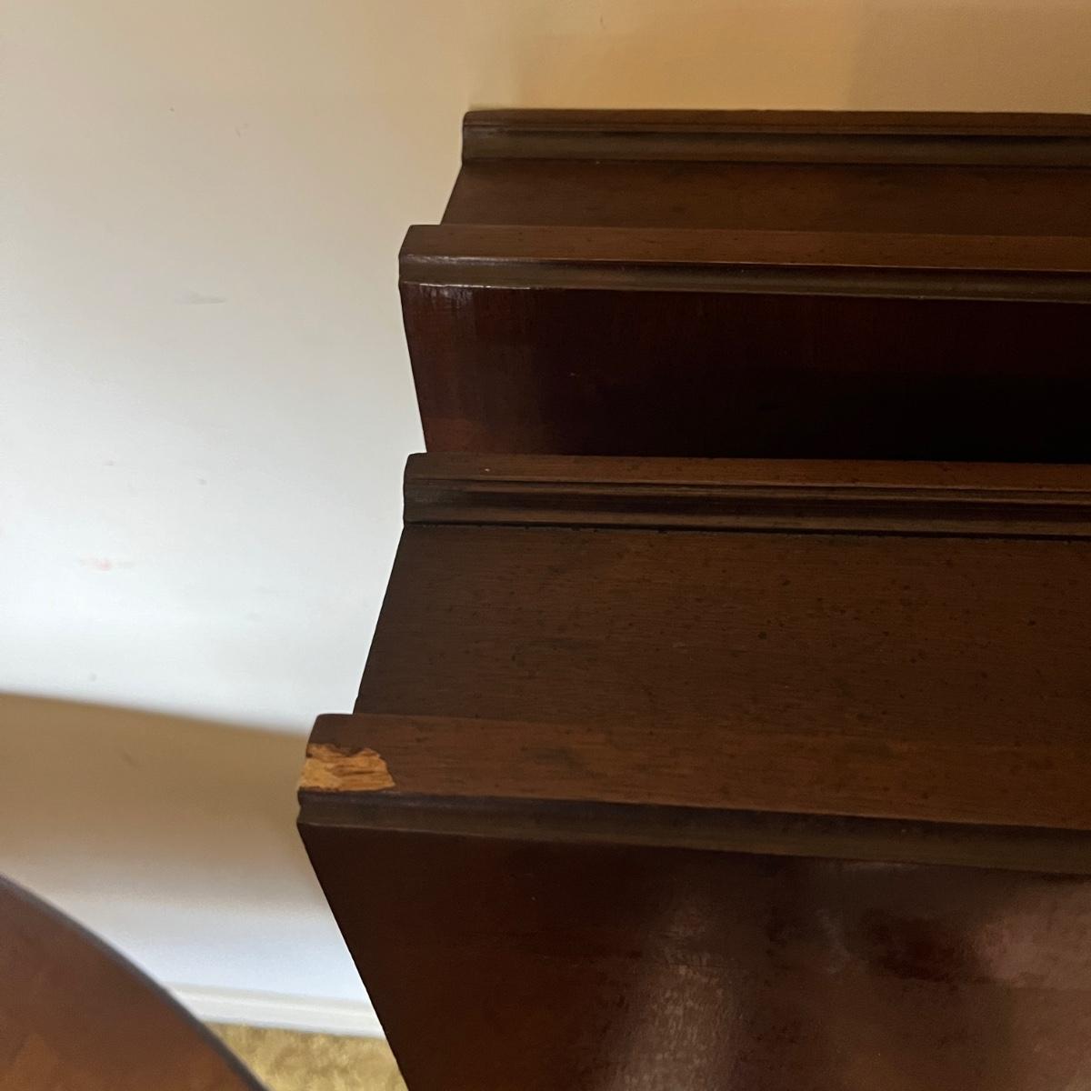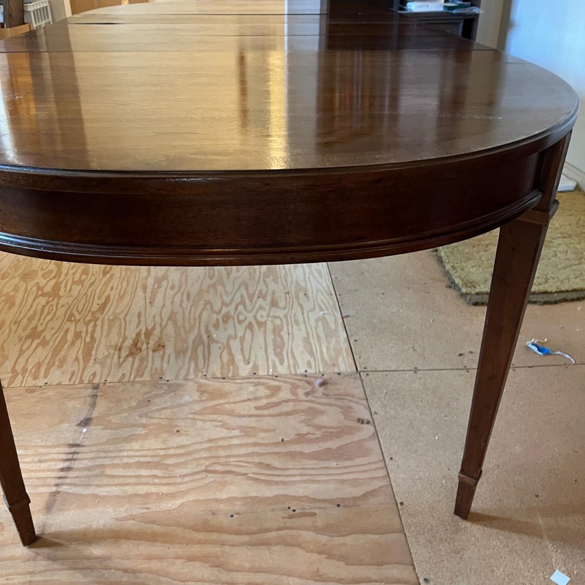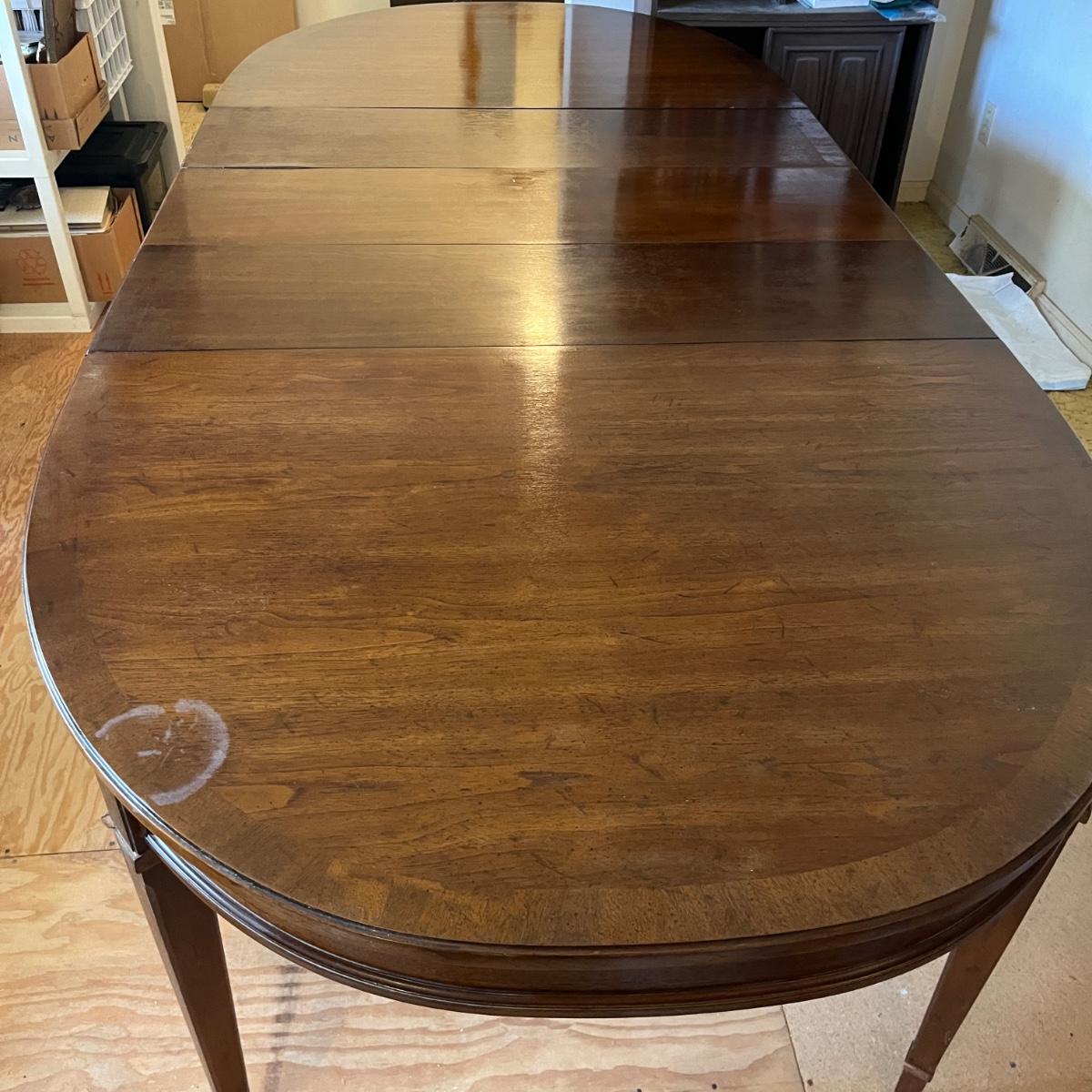 Lot includes a solid wood dining table with veneer. Includes three 12” leaves. Table without leaves measures 44.5” x 64” x 29”. Table has chips and one spot on end that the finish is worn through, see pictures.