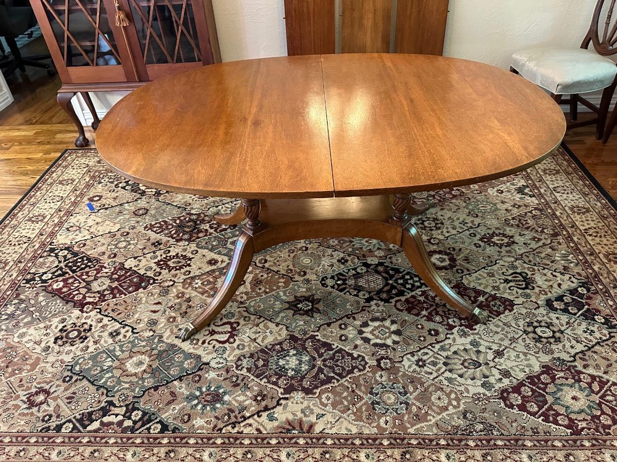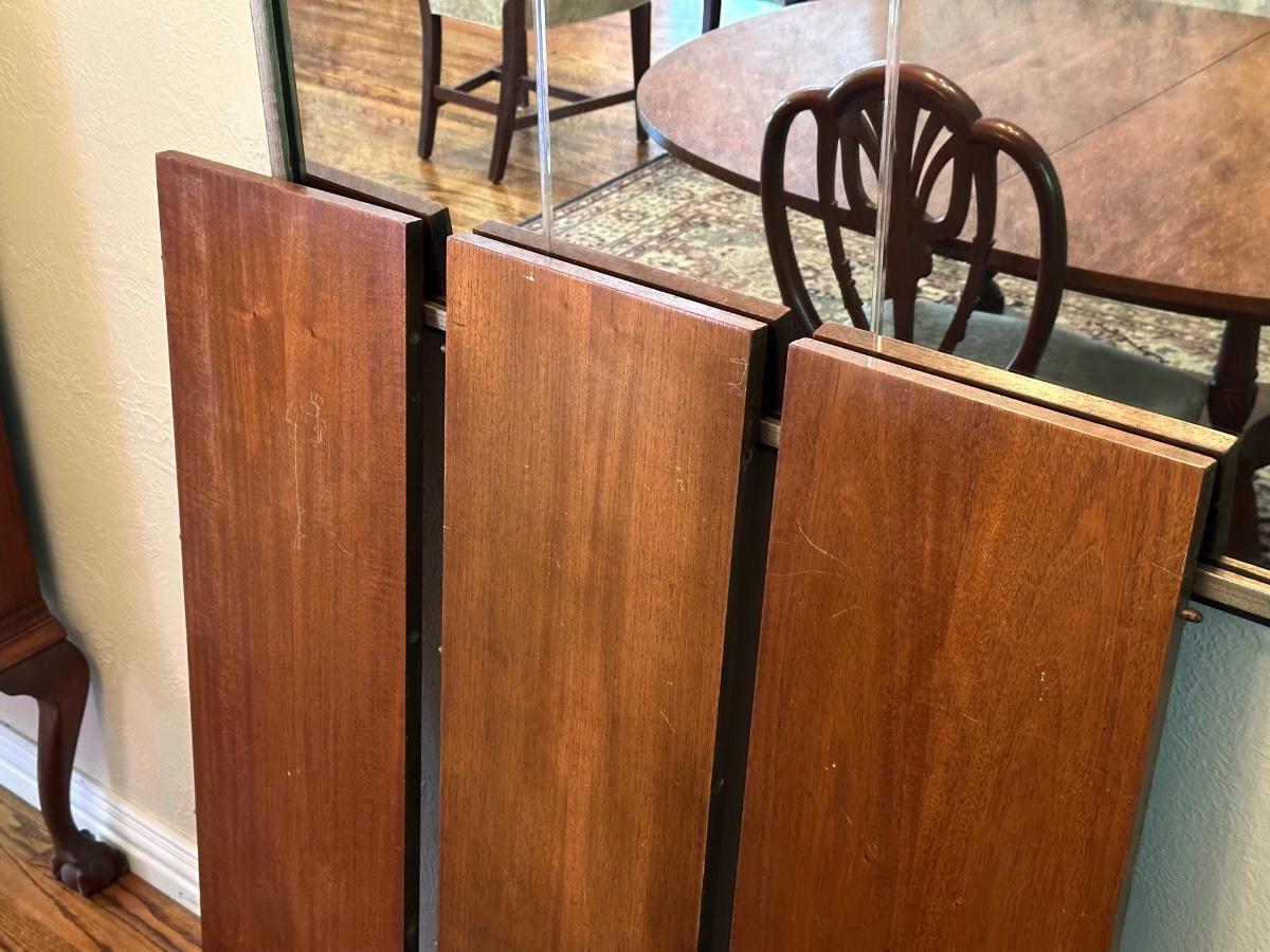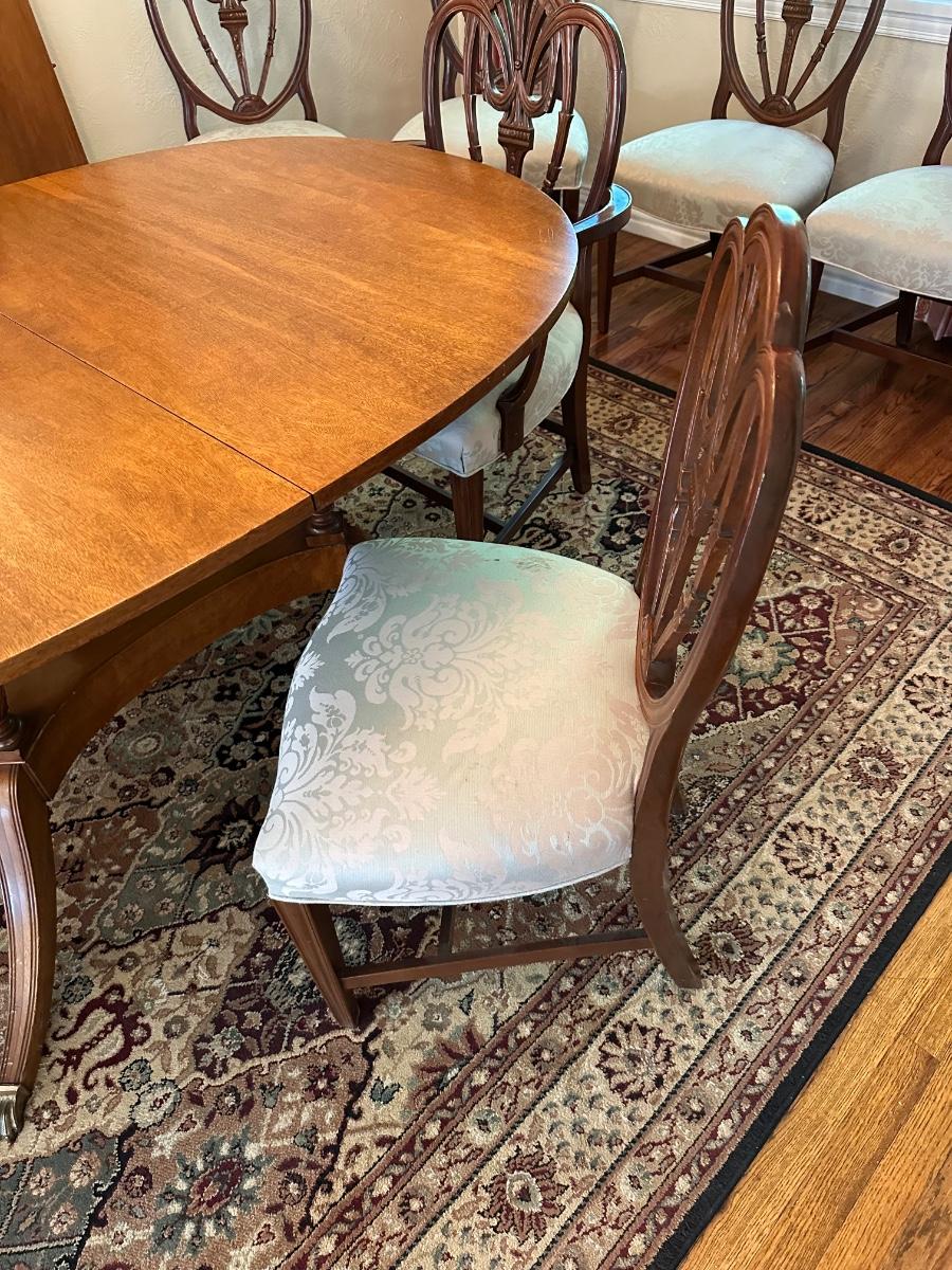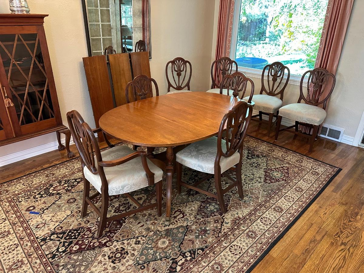 DINING ROOM TABLE WITH 2 ARM CHAIRS, 6 SIDE CHAIRS AND 3 TABLE LEAVES