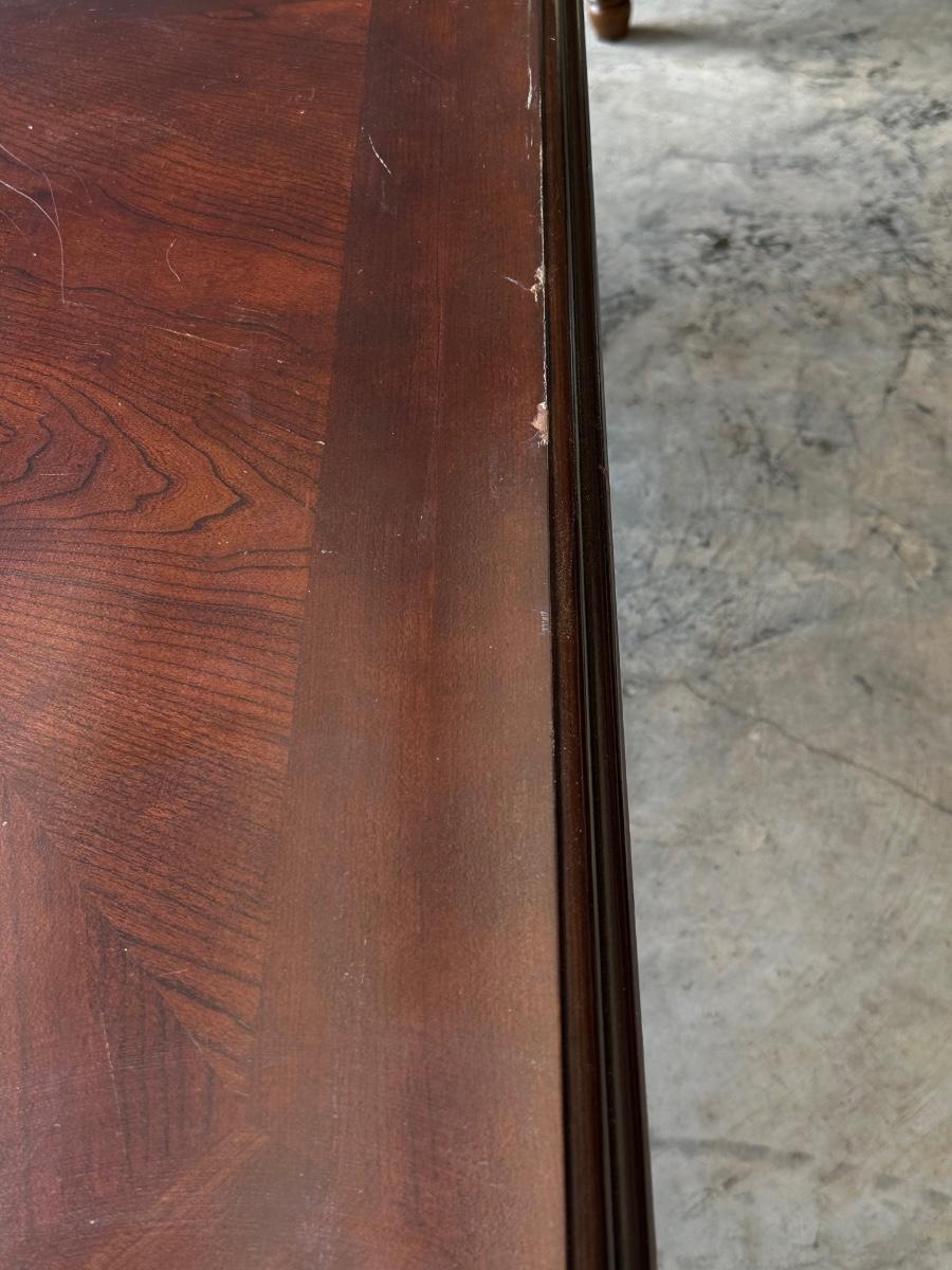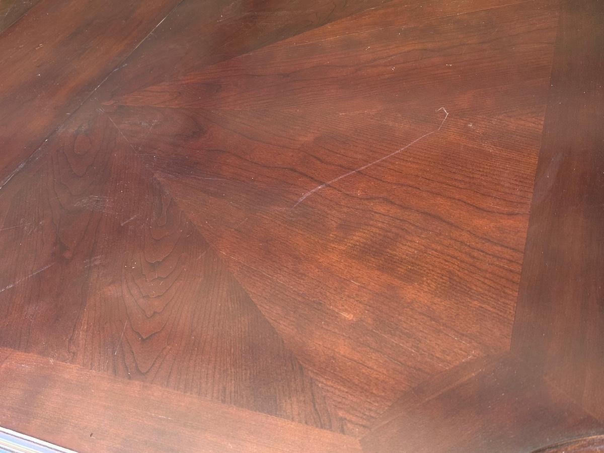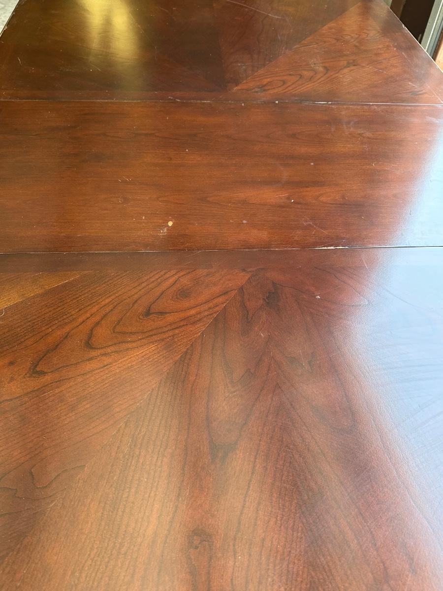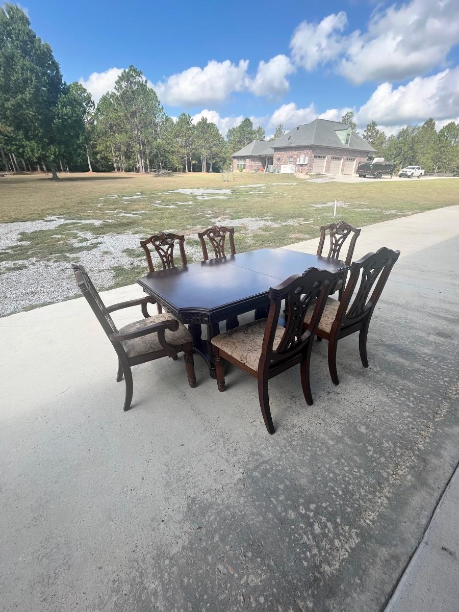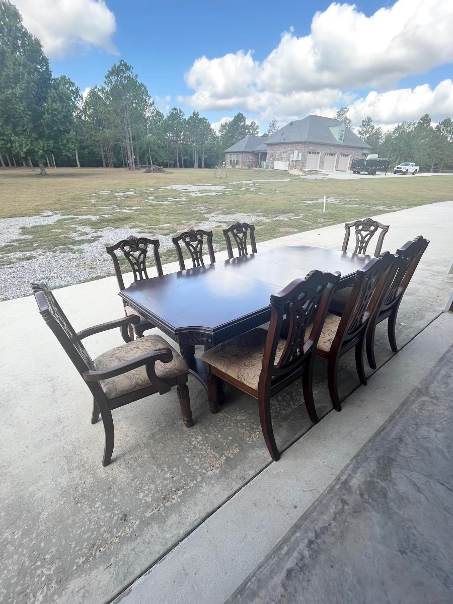 No brand name found ~ Dining table Includes 1 leaf = 18” D ~ table = 31” H x 85” W with leaf x 43” D ~ 2 captain chairs = 41” H x 25.5” W x 22.5” D ~ 6 Side chairs = 41” H x 17.5” W x 22.5” D ~ Some chairs may need tightening. Top of Table has scratches and some end damage from moving. see photos.