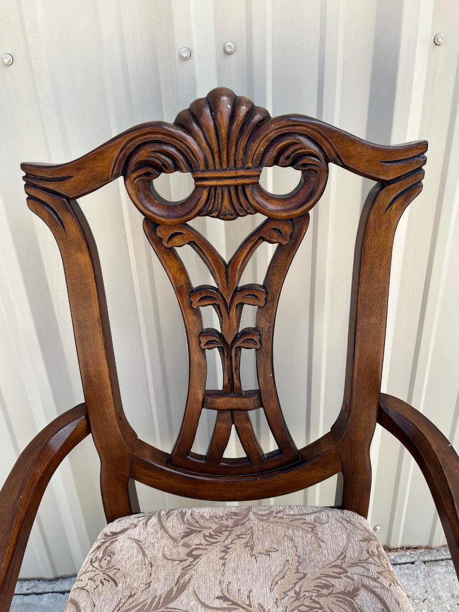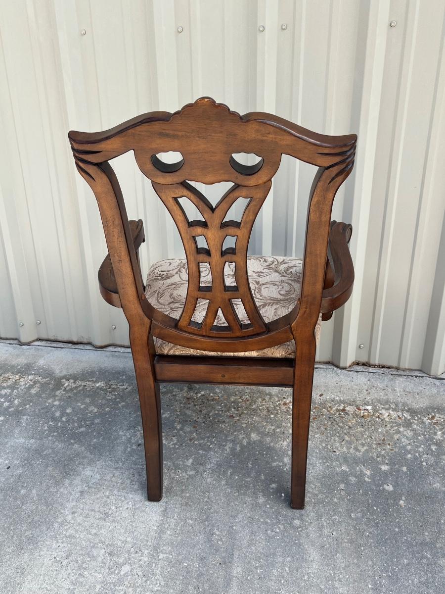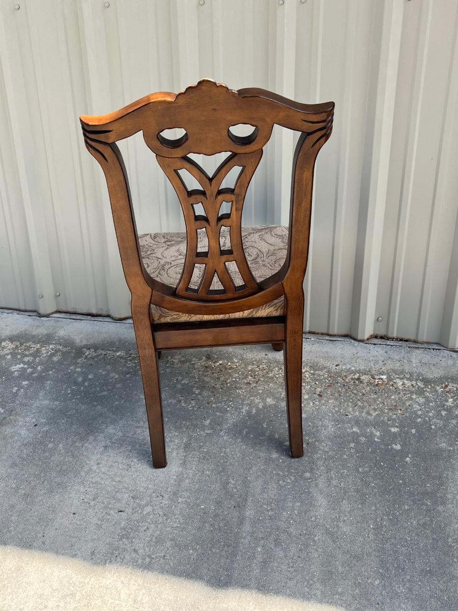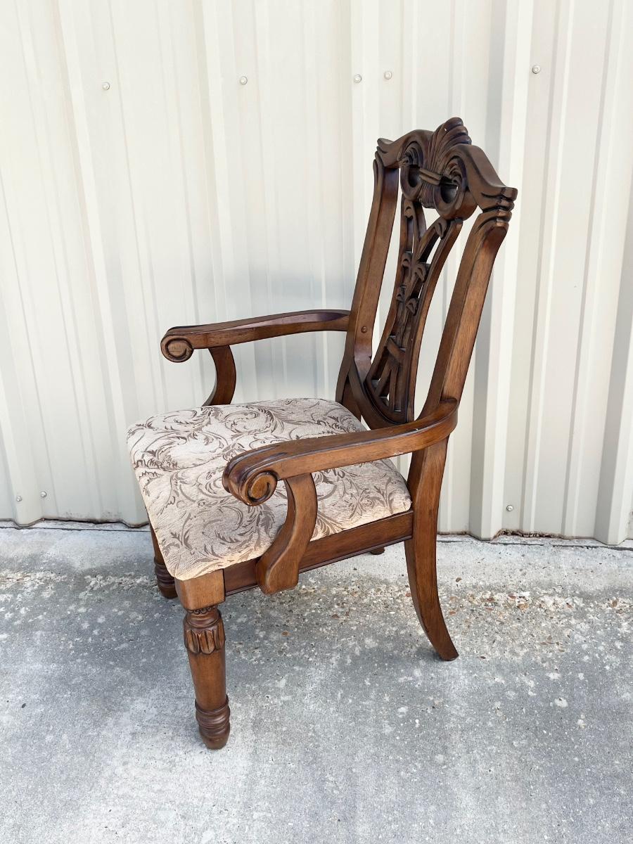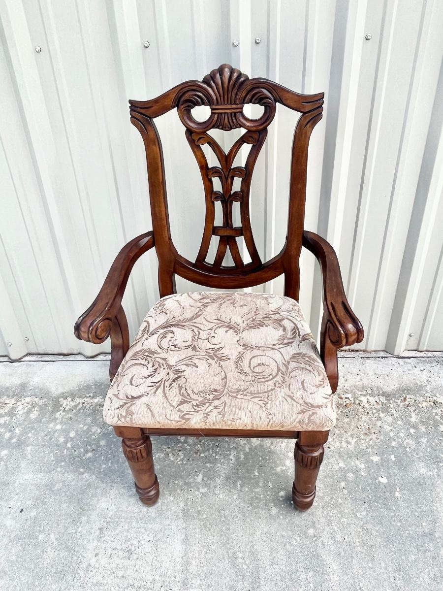 No brand name found ~ Dining table Includes 1 leaf = 18” D ~ table = 31” H x 85” W with leaf x 43” D ~ 2 captain chairs = 41” H x 25.5” W x 22.5” D ~ 6 Side chairs = 41” H x 17.5” W x 22.5” D ~ Some chairs may need tightening. Top of Table has scratches and some end damage from moving. see photos.