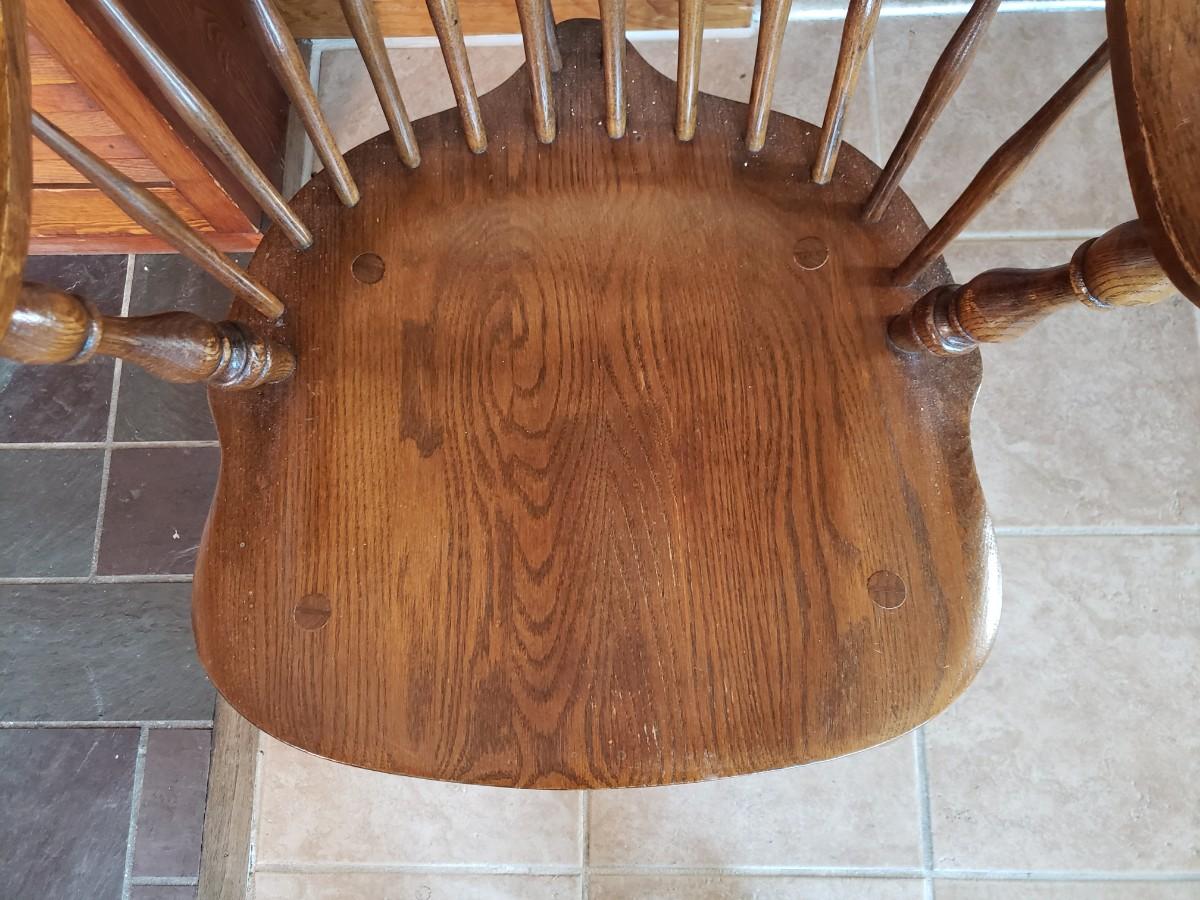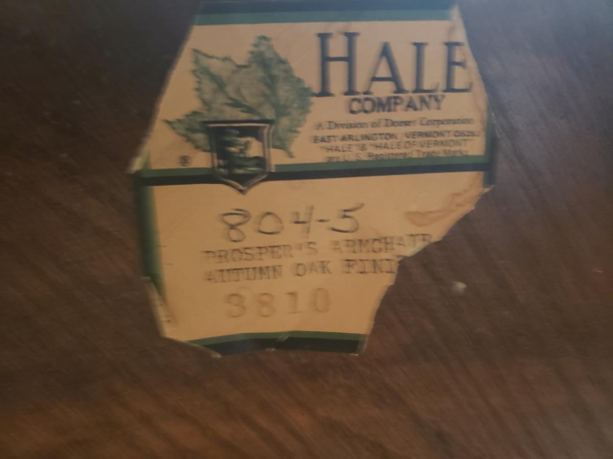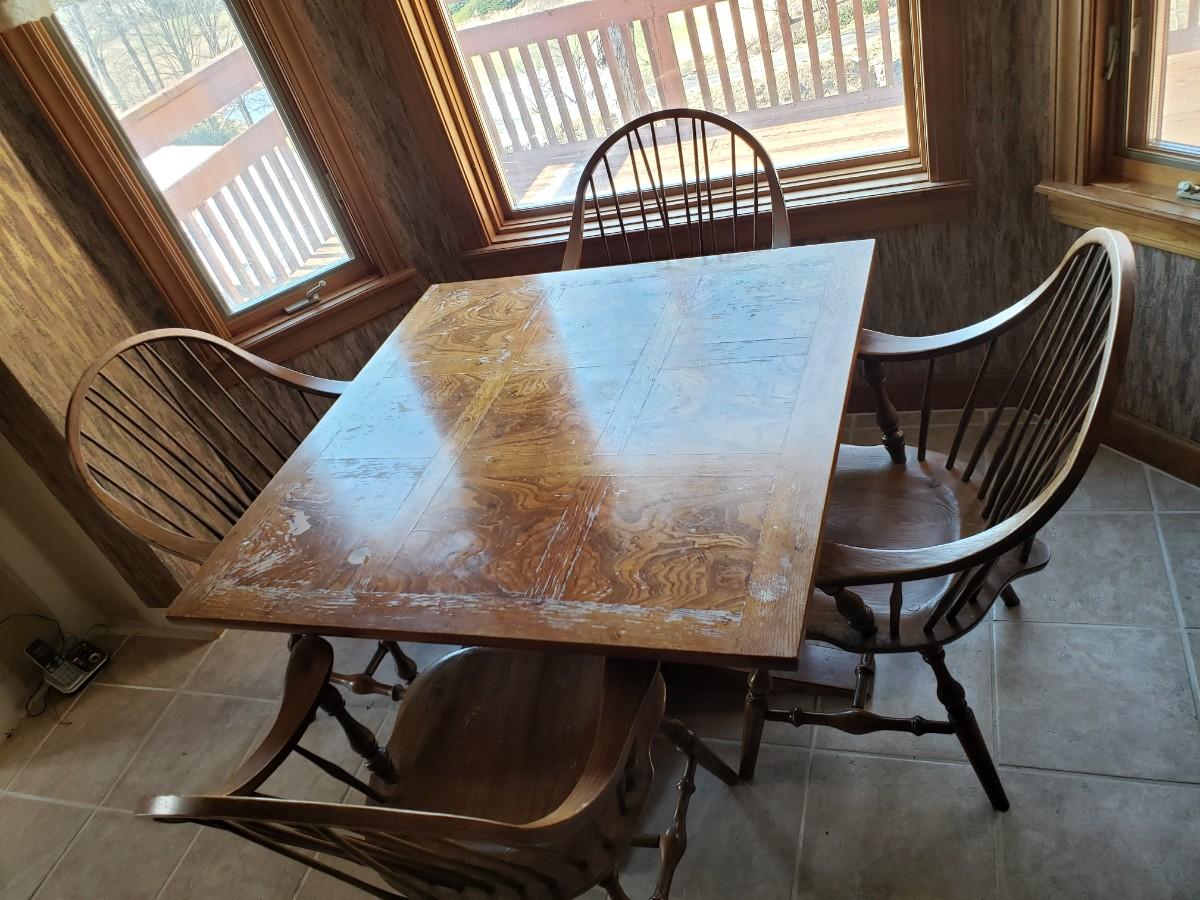 Hale Company Prospers arm chair autumn oak finish. Dining table and 4 arm chairs, top shows moderate wear. 42x42x30