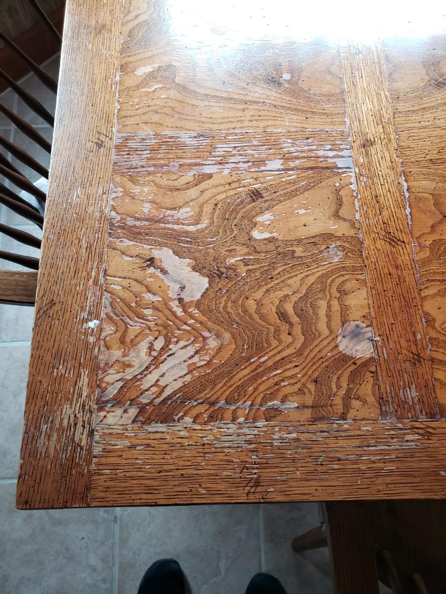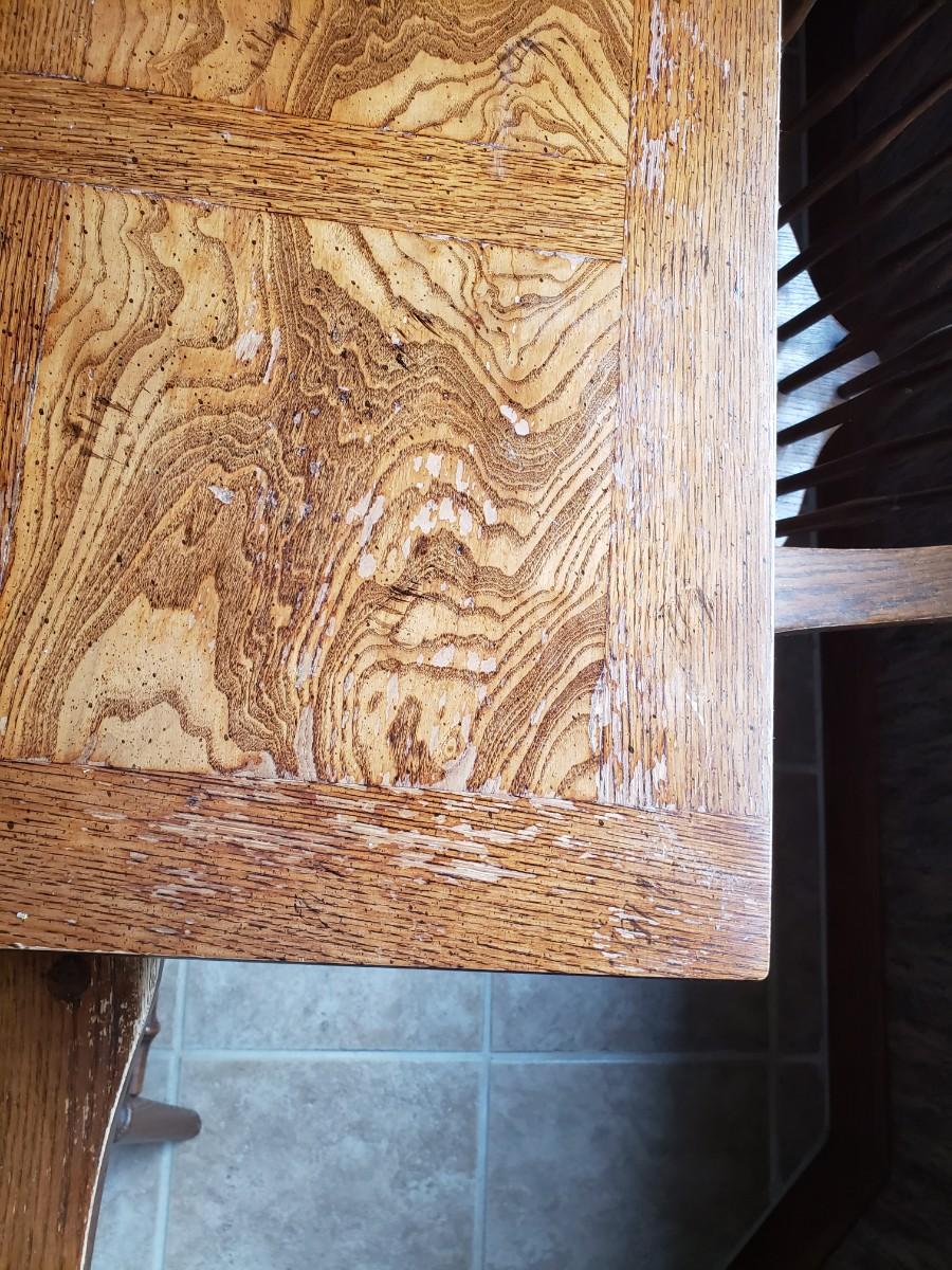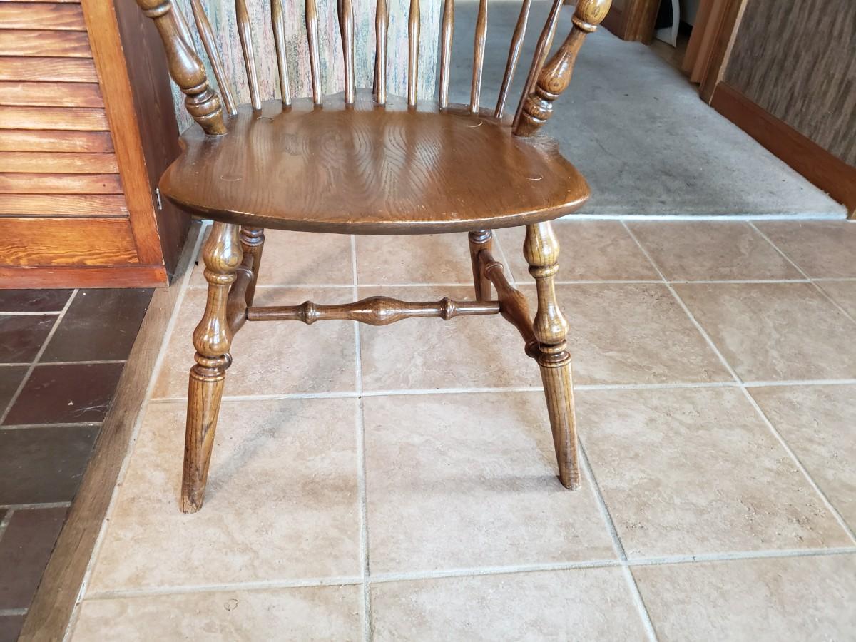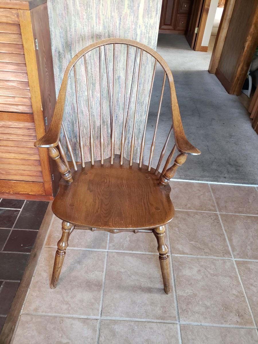 Hale Company Prospers arm chair autumn oak finish. Dining table and 4 arm chairs, top shows moderate wear. 42x42x30
