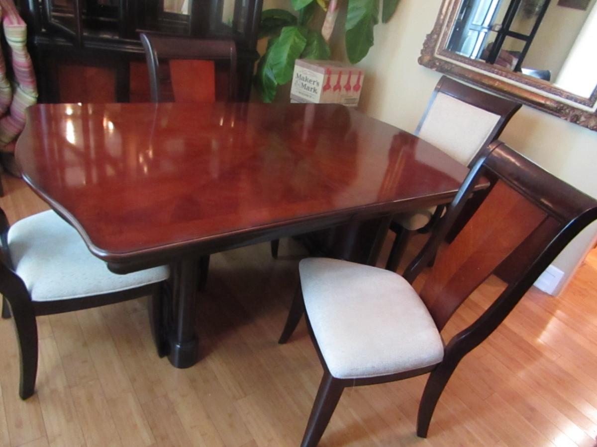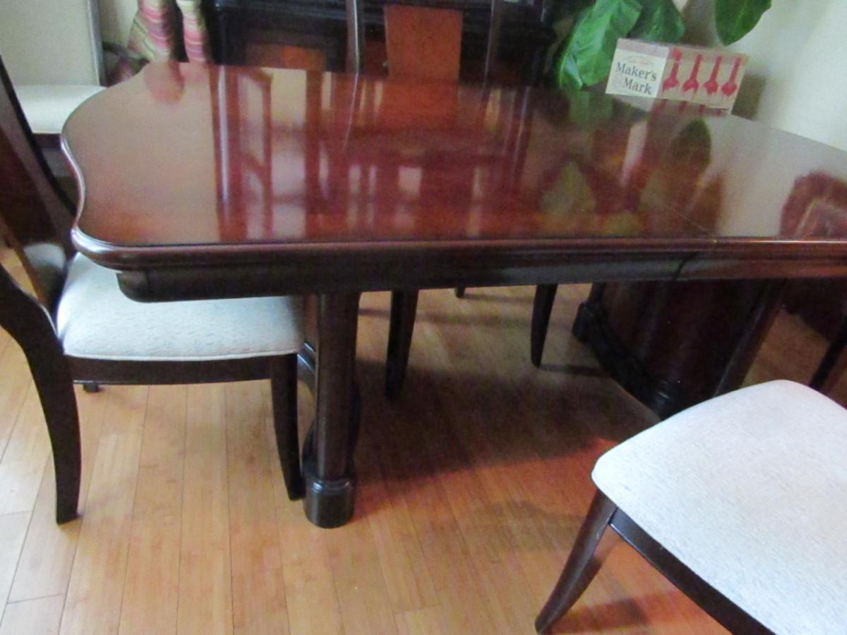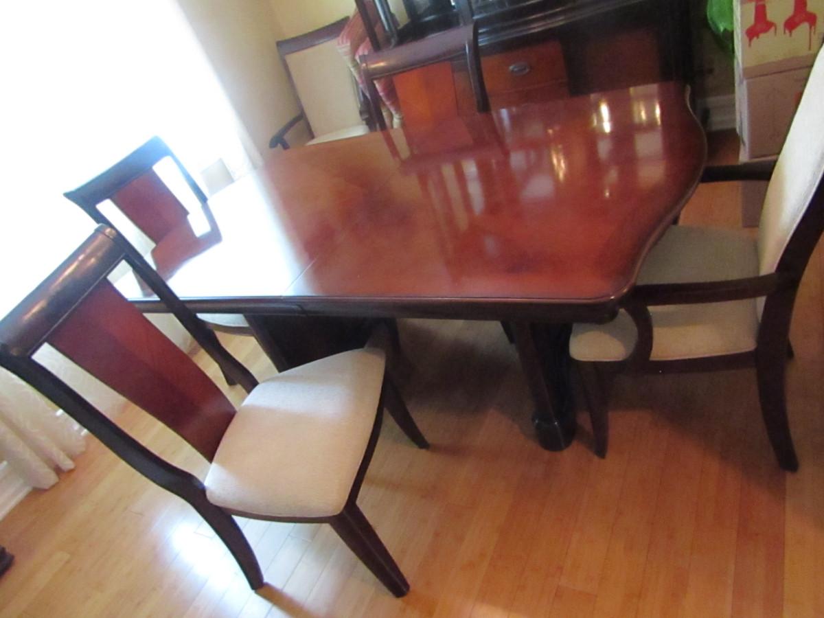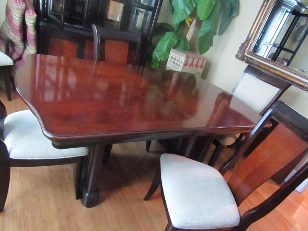 Dining Table and Six Chairs with upholstered seats. No maker's mark found. Two of the six chairs are carving chairs with arm rests. Table is 44" wide and measures approx 74" long without the leaf inserted. The leaf would add an additional 22".