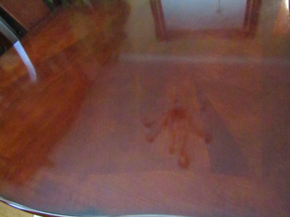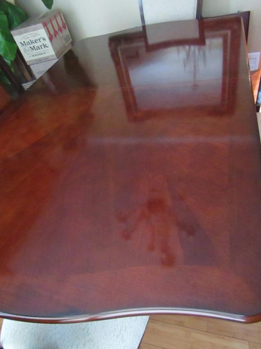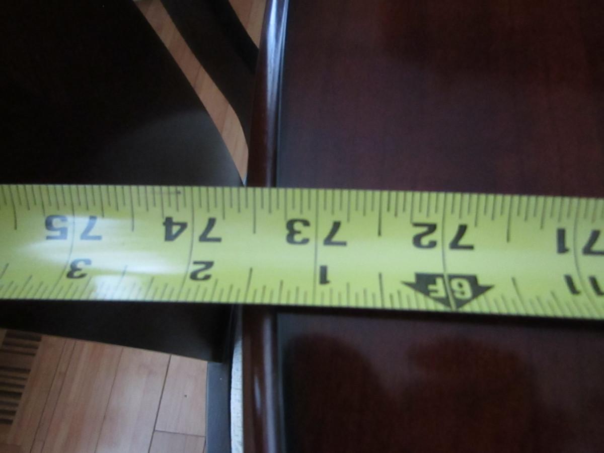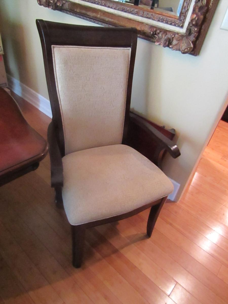 Dining Table and Six Chairs with upholstered seats. No maker's mark found. Two of the six chairs are carving chairs with arm rests. Table is 44" wide and measures approx 74" long without the leaf inserted. The leaf would add an additional 22".