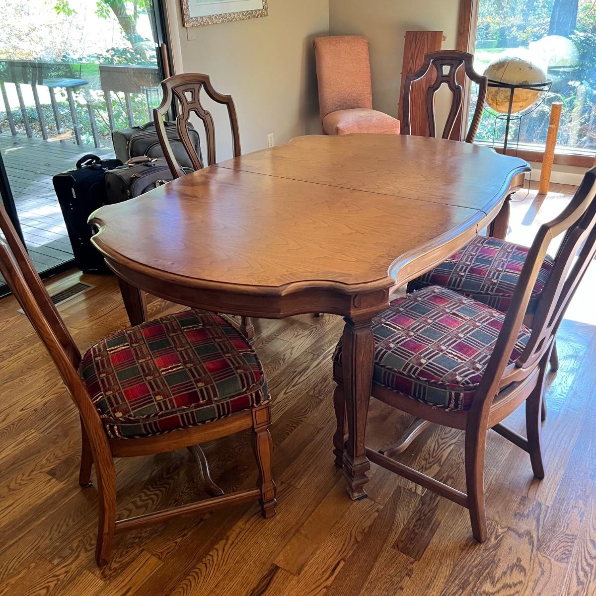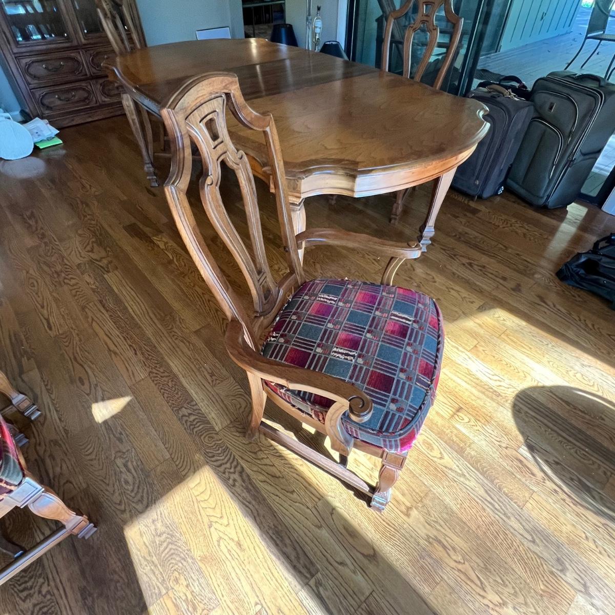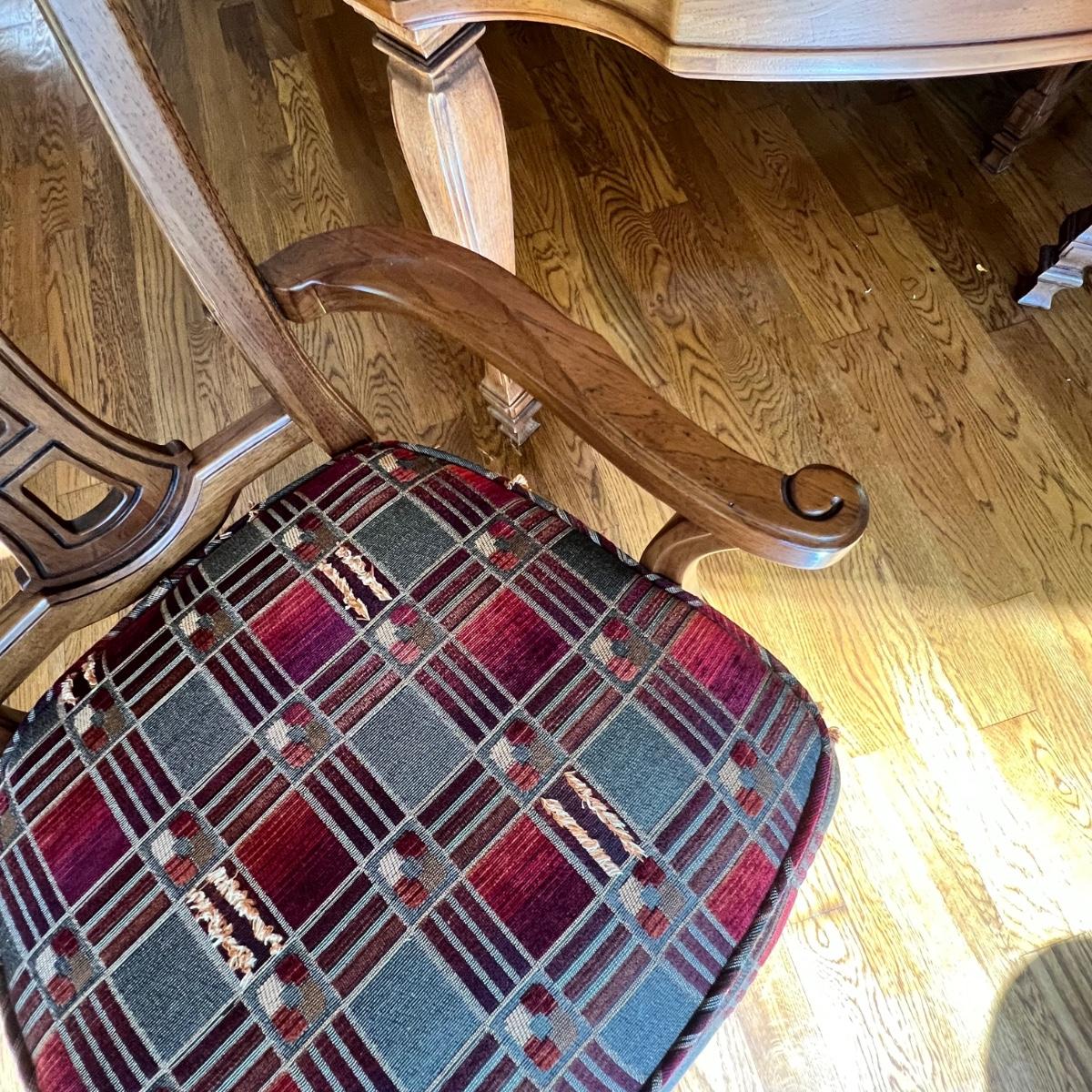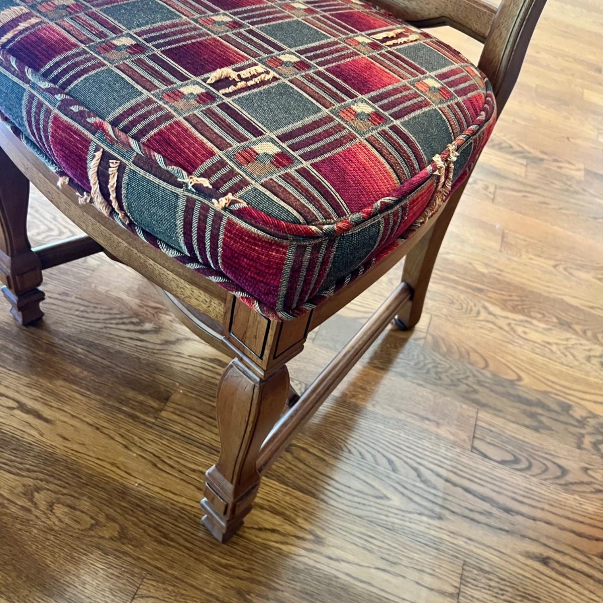 Solid wood dining table measures 43” x 64 x 29”H. Comes with five matching chairs, one has arms. Upholstery is a burgundy checked fabric. No leaf included.