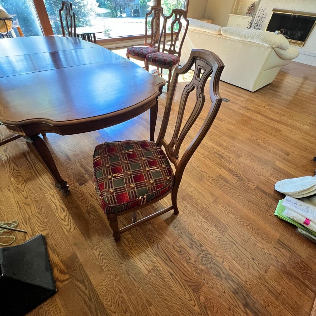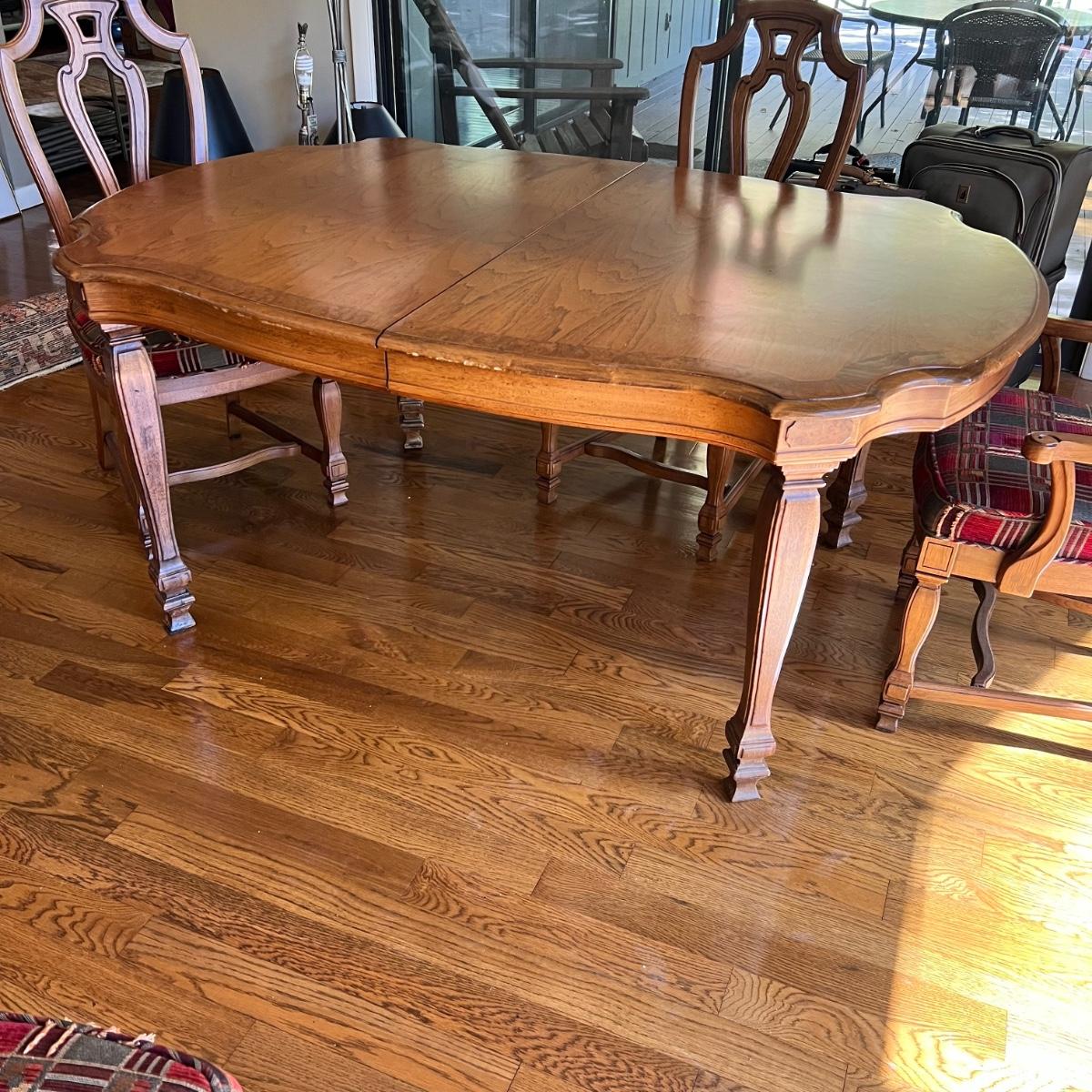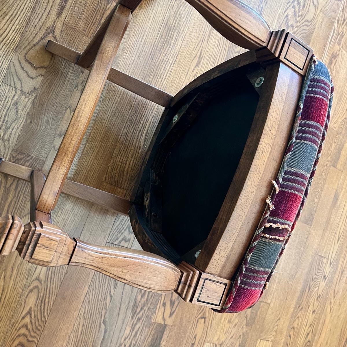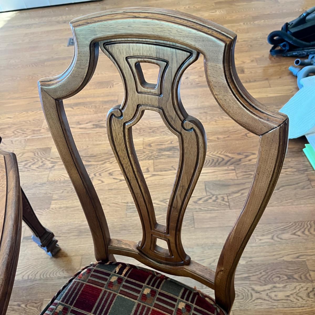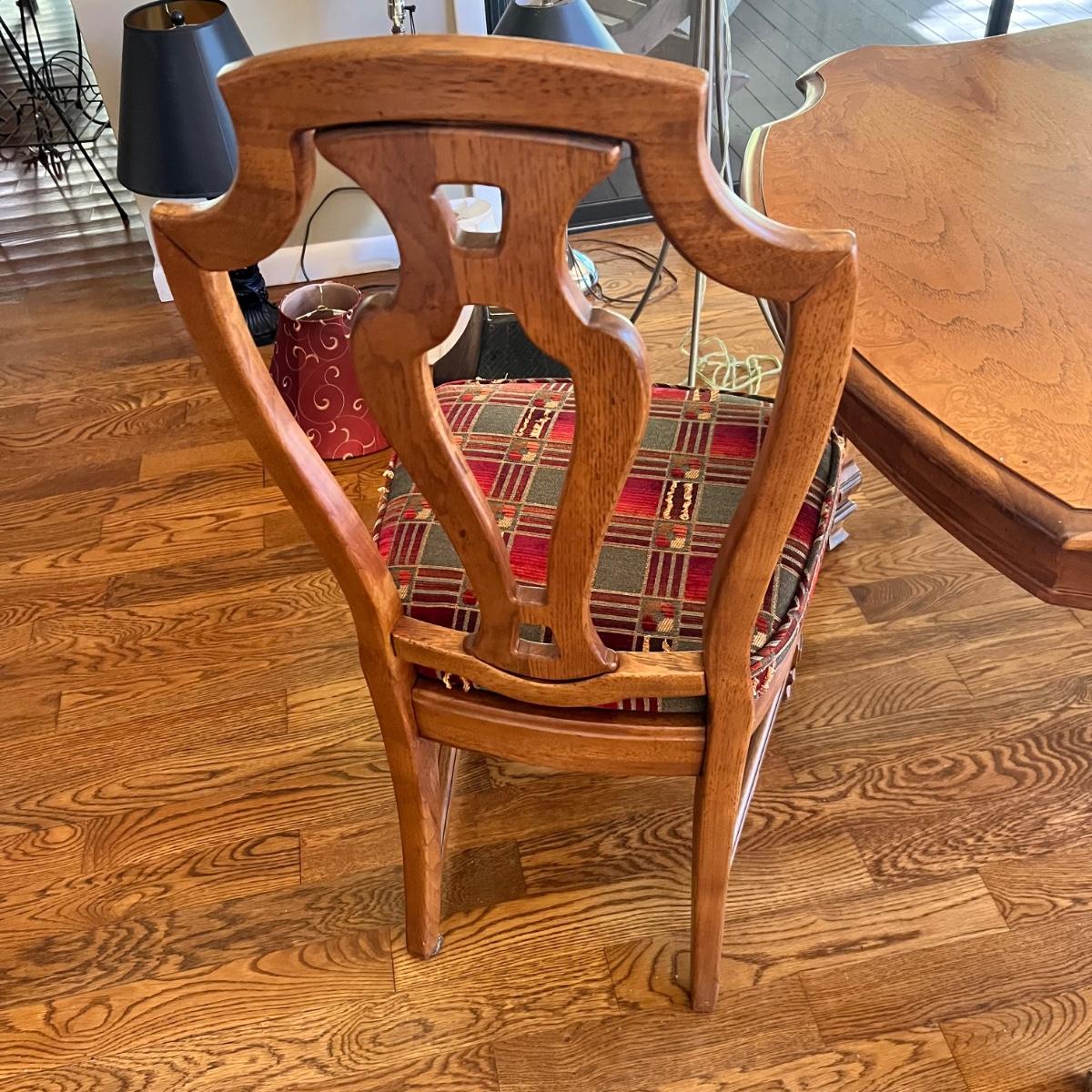 Solid wood dining table measures 43” x 64 x 29”H. Comes with five matching chairs, one has arms. Upholstery is a burgundy checked fabric. No leaf included.
