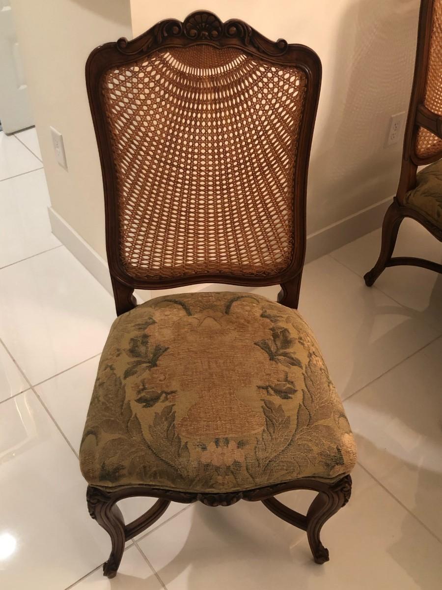 There are 12 cane chairs, 2 arm and 10 side. Chair seats are upholstered in fine fabric and the backs are cane. 44" tall, 26" wide and 25" deep.