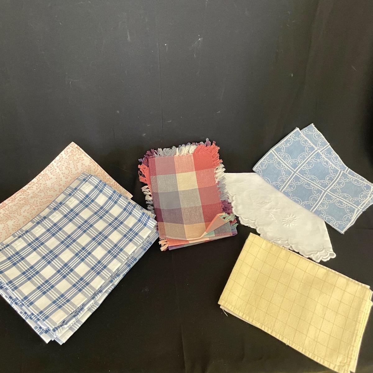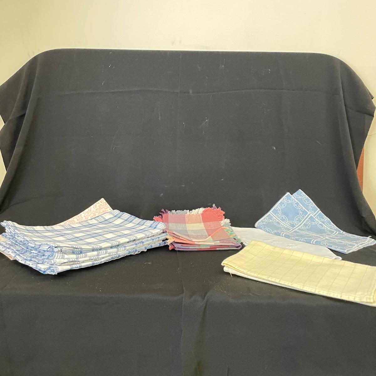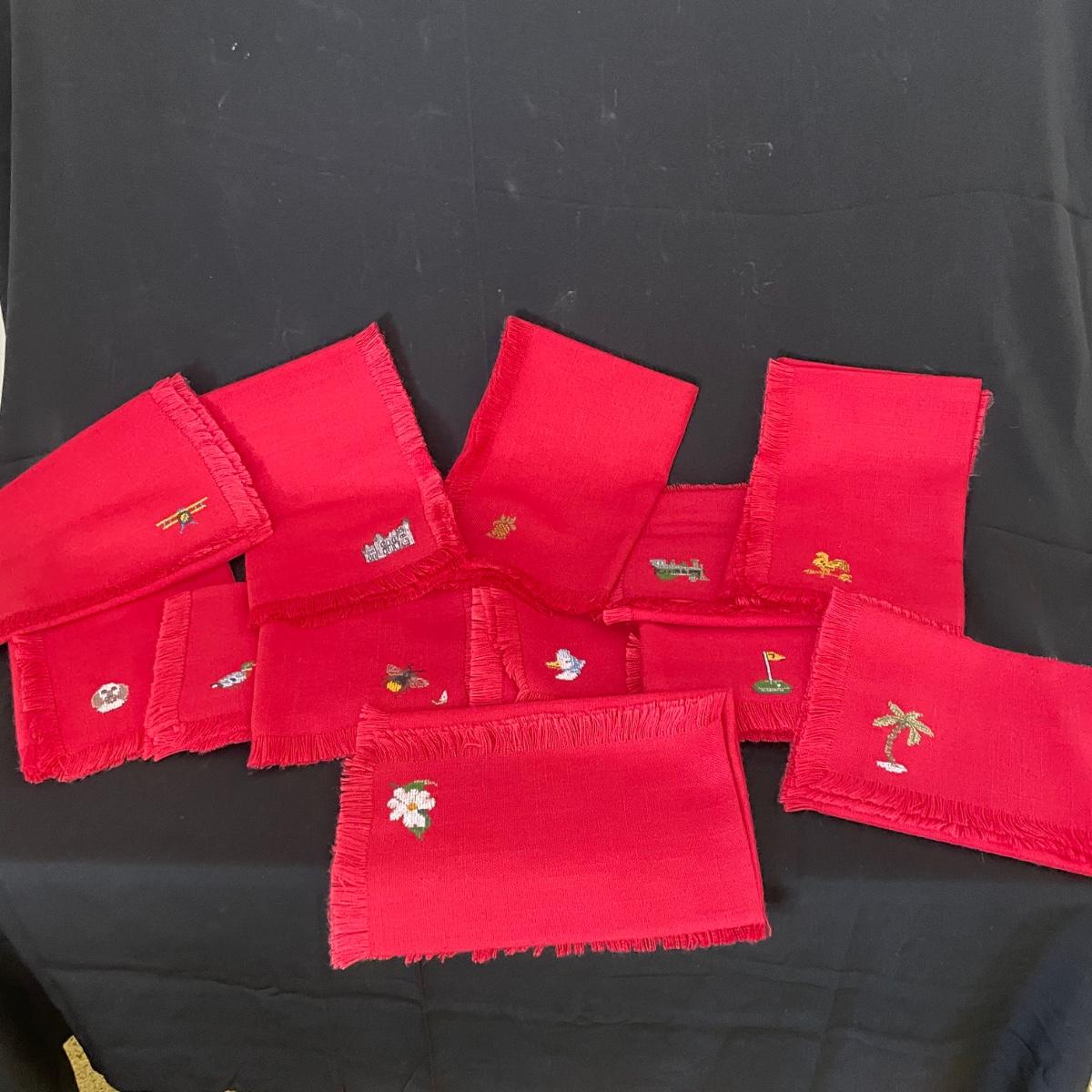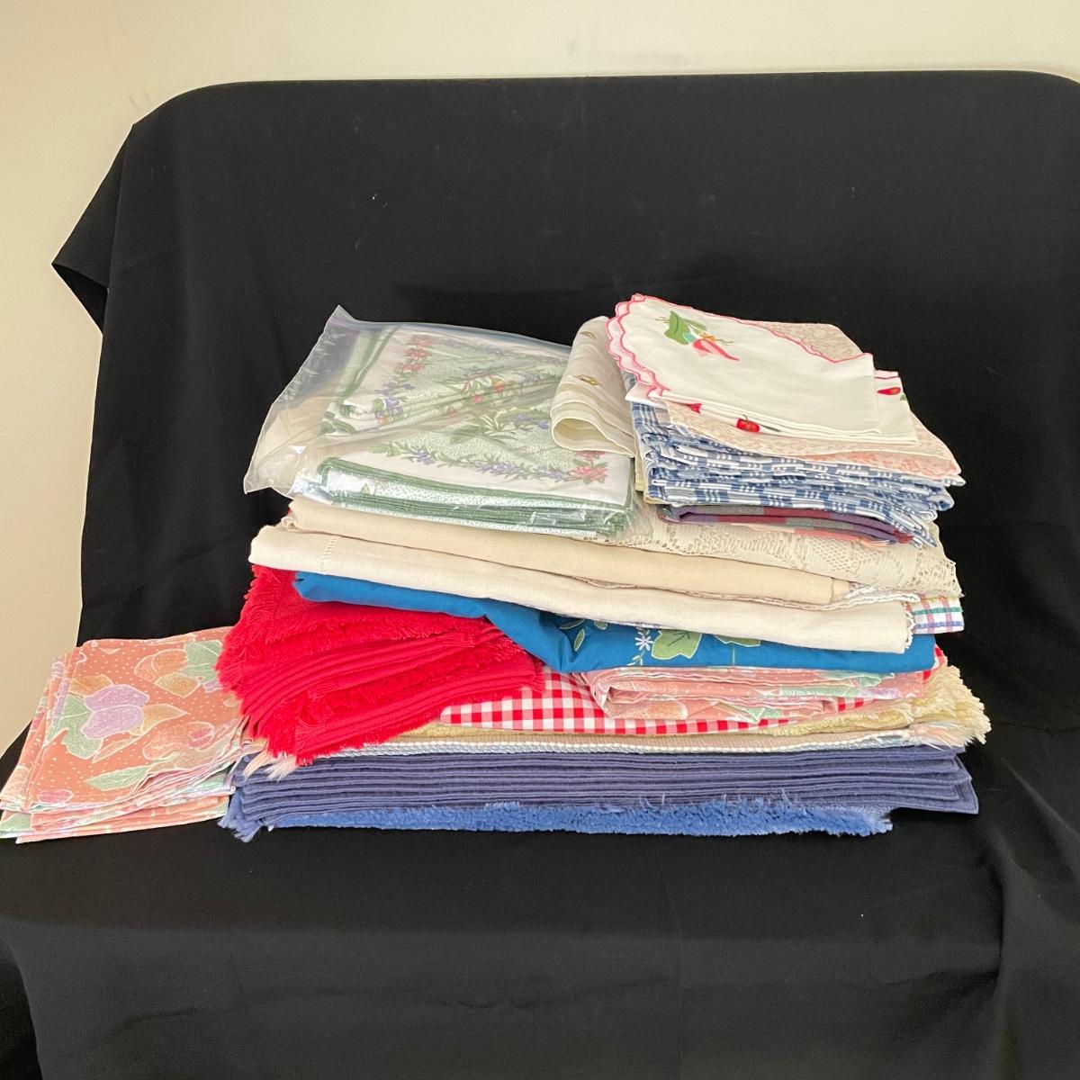 A well rounded collection of table cloths, cloth napkins, newer and vintage placemats and fine linen table decor. Some table cloths were photographed on a table measuring 54” x 21.5” x 29”. Table is not included in lot, but can be found by itself in another lot. The collection of red napkins have been hand embroidered and perfect for individual personalization at your next meal. A couple spots were found on the table cloths, they may come out with washing. The teal tablecloth also appears hand made and feels like cotton. See images. Shipping available.