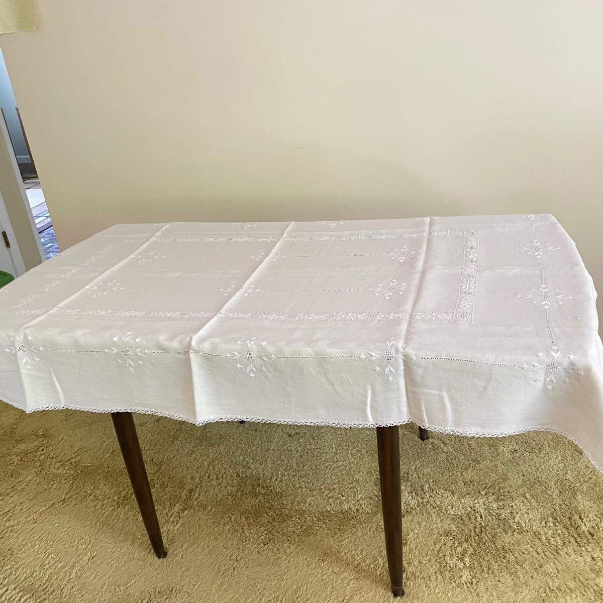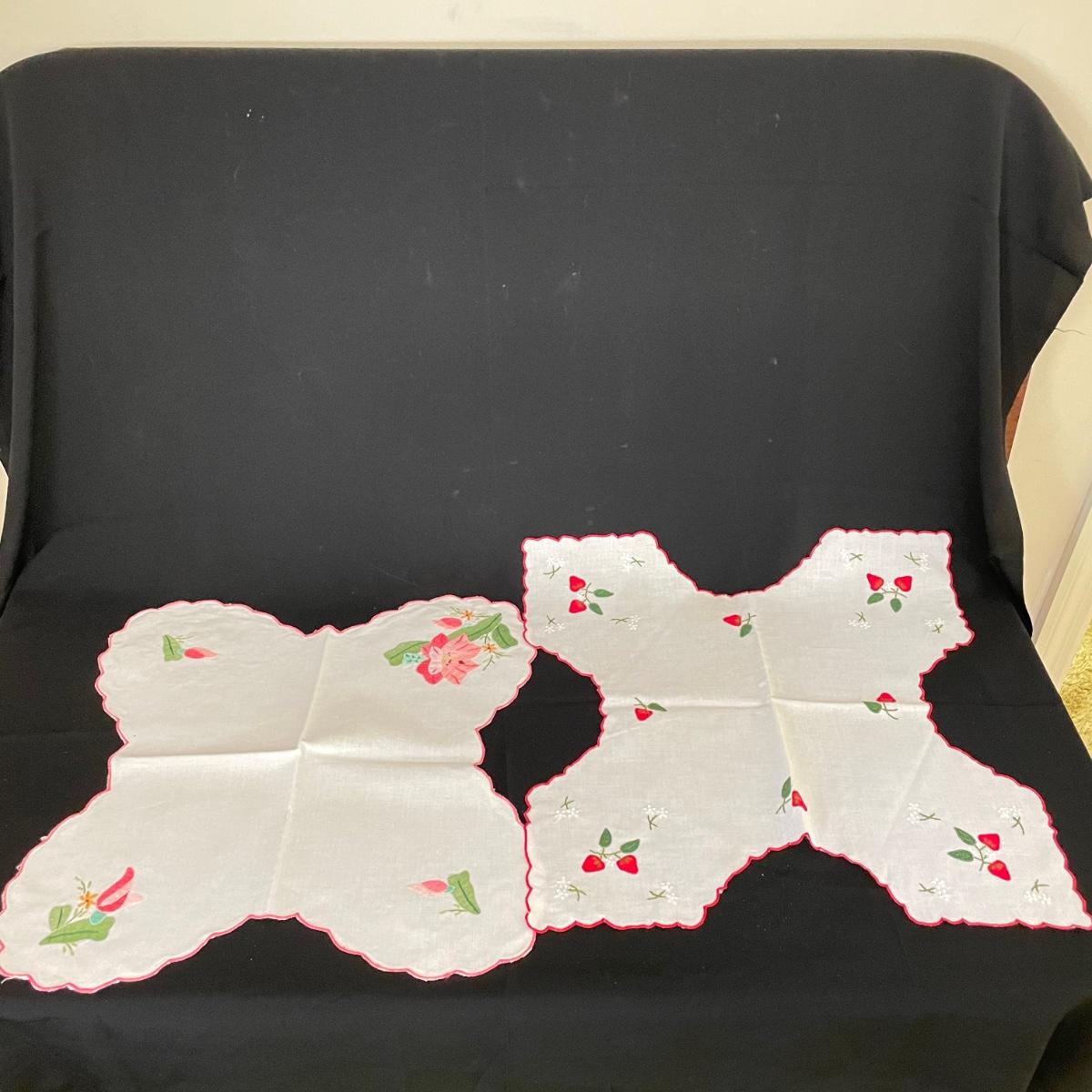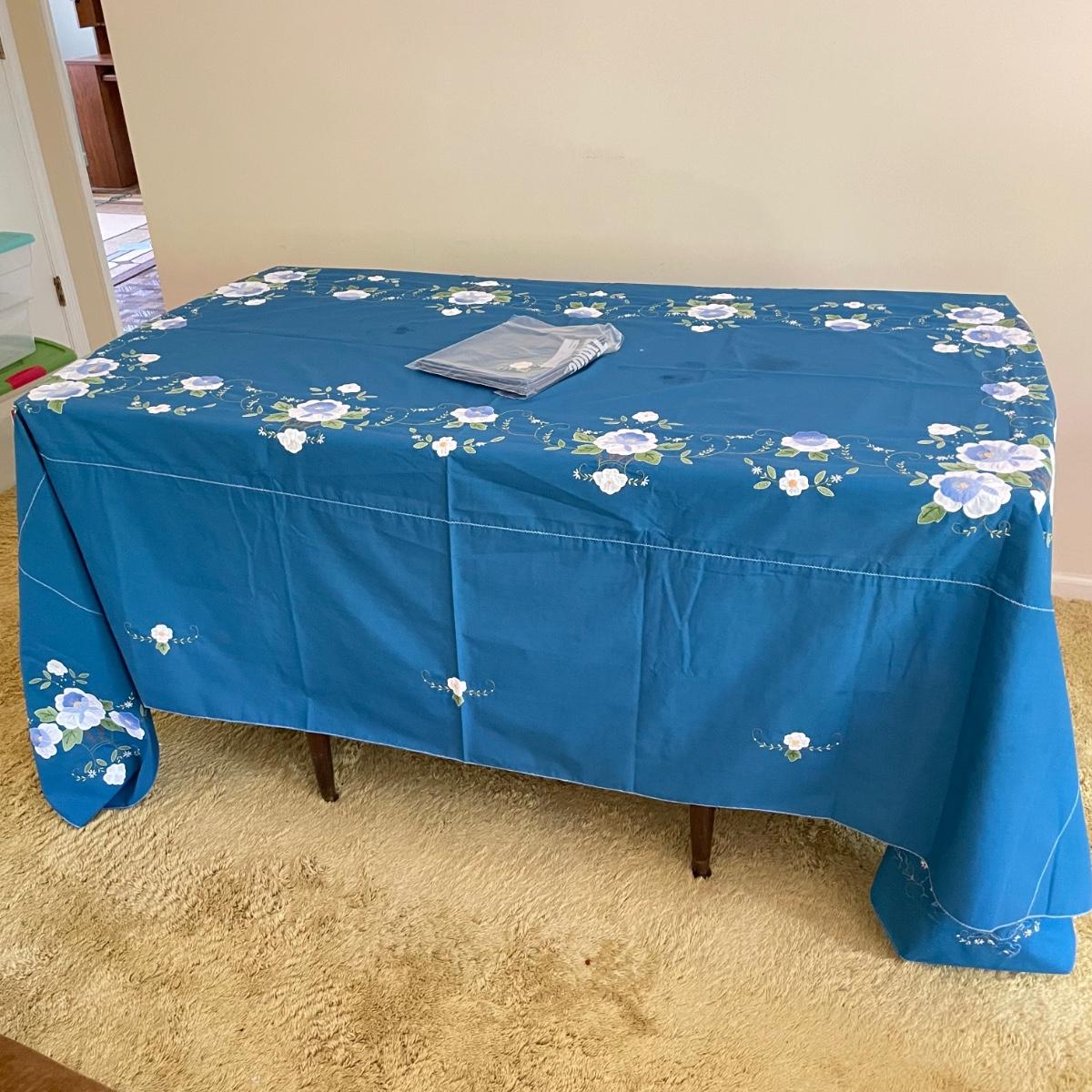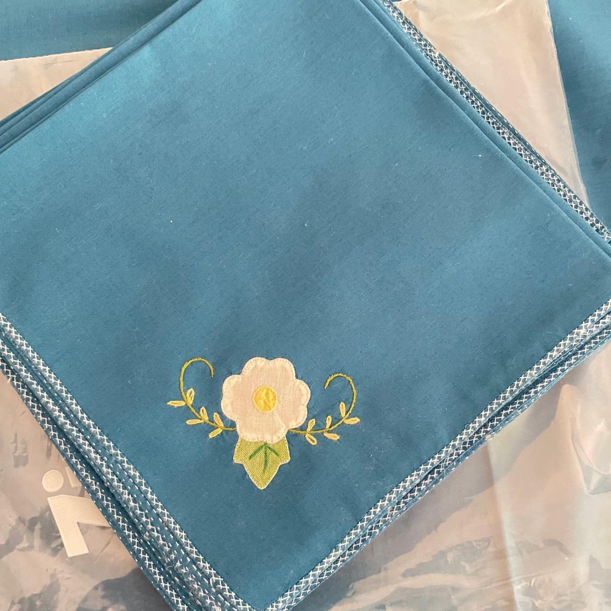 A well rounded collection of table cloths, cloth napkins, newer and vintage placemats and fine linen table decor. Some table cloths were photographed on a table measuring 54” x 21.5” x 29”. Table is not included in lot, but can be found by itself in another lot. The collection of red napkins have been hand embroidered and perfect for individual personalization at your next meal. A couple spots were found on the table cloths, they may come out with washing. The teal tablecloth also appears hand made and feels like cotton. See images. Shipping available.