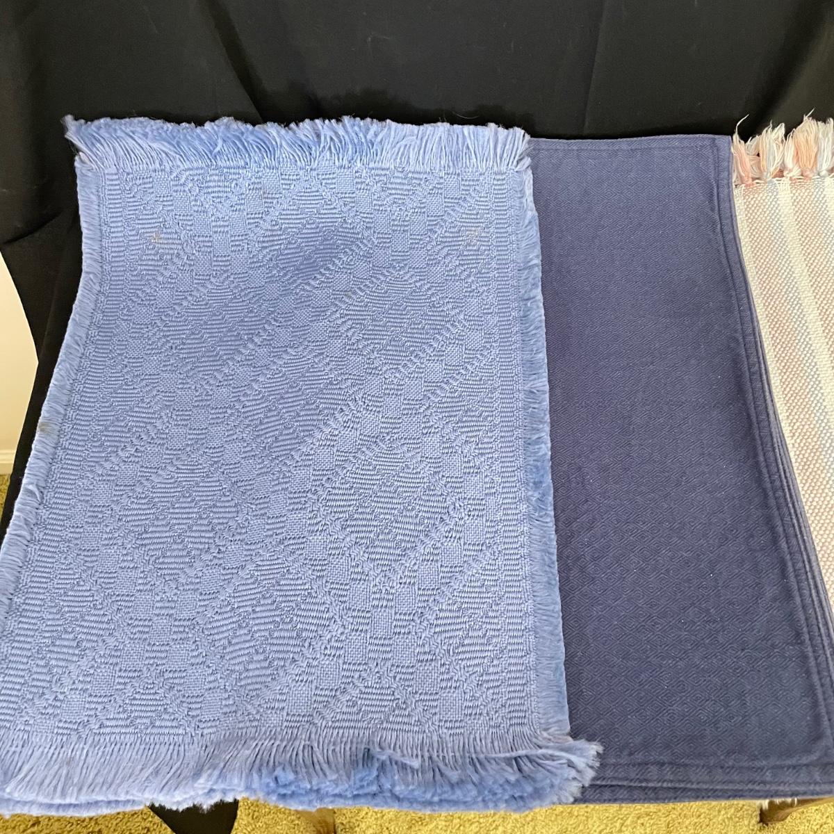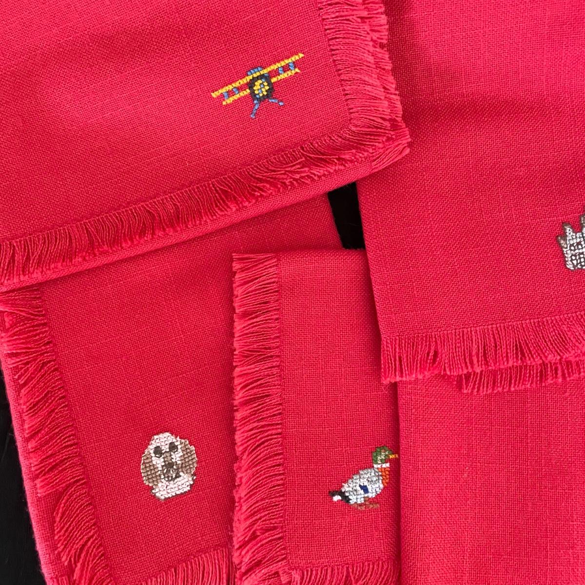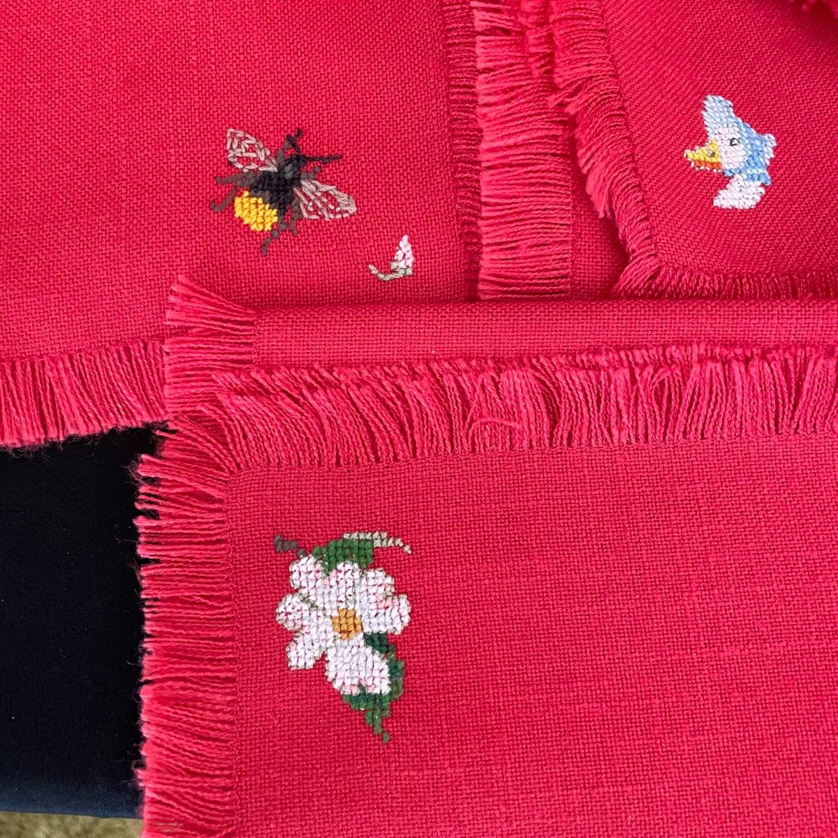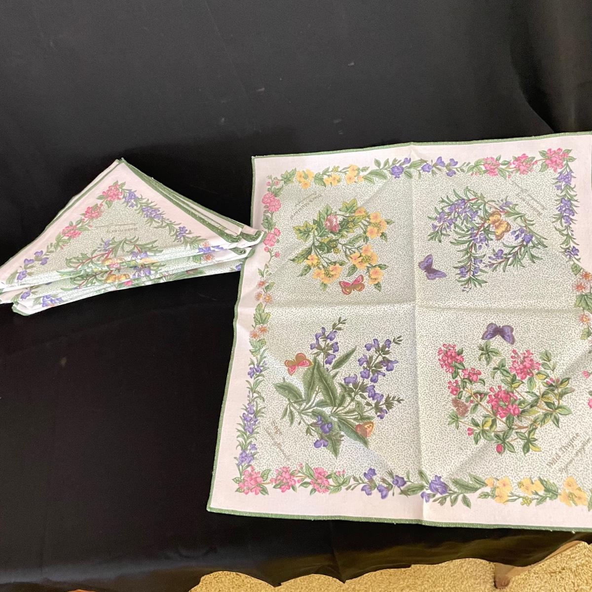 A well rounded collection of table cloths, cloth napkins, newer and vintage placemats and fine linen table decor. Some table cloths were photographed on a table measuring 54” x 21.5” x 29”. Table is not included in lot, but can be found by itself in another lot. The collection of red napkins have been hand embroidered and perfect for individual personalization at your next meal. A couple spots were found on the table cloths, they may come out with washing. The teal tablecloth also appears hand made and feels like cotton. See images. Shipping available.