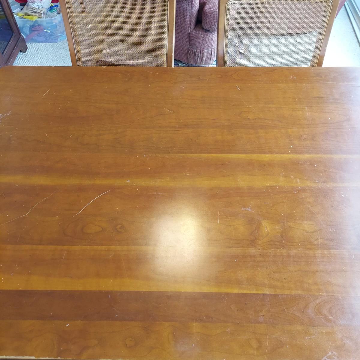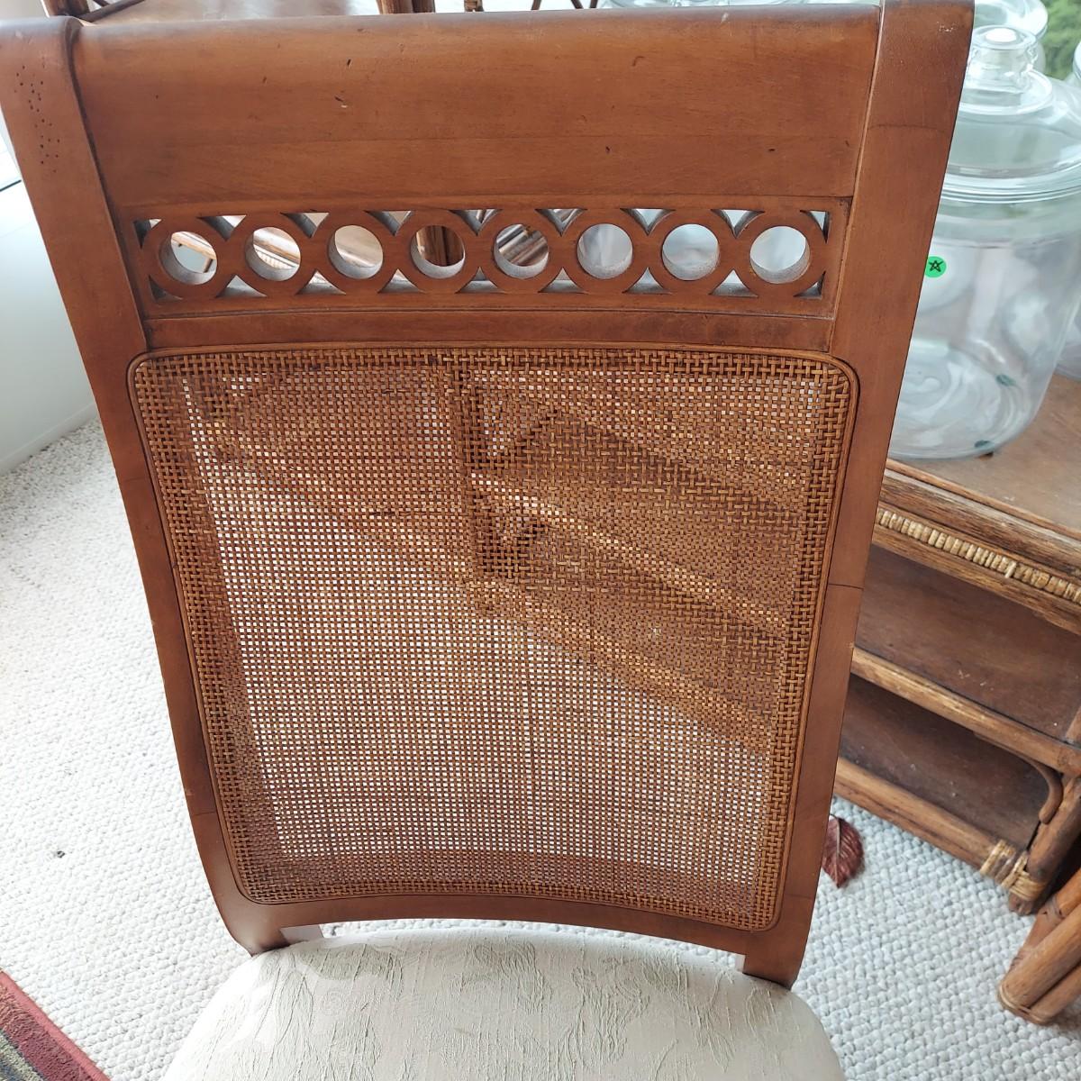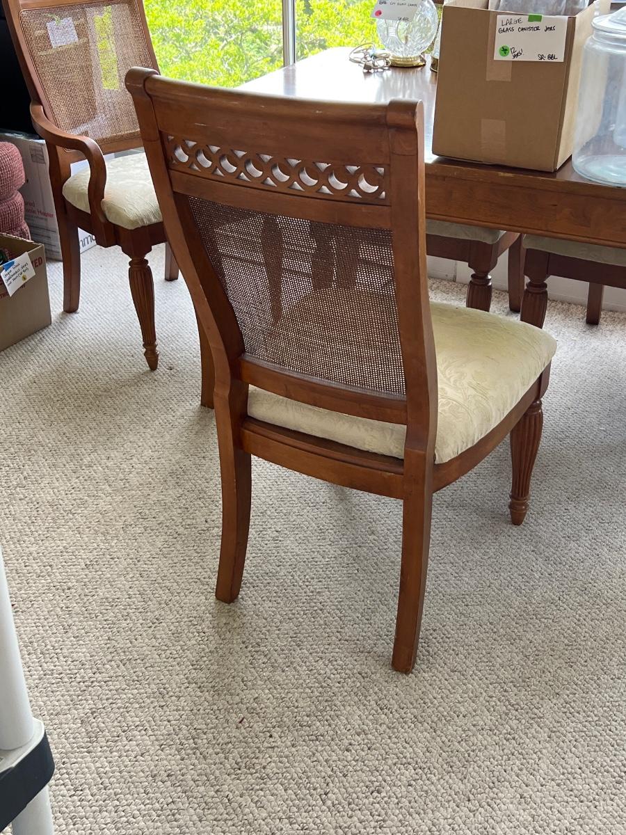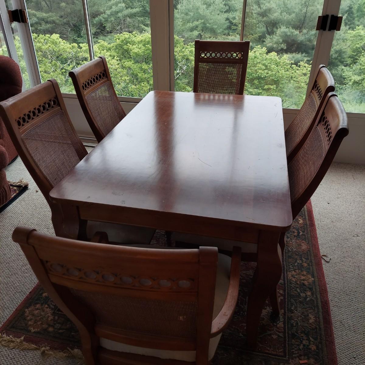 Lot includes wooden dining table that measures 60” x 38” x 30"H. Plus six chairs with upholstered seats. Two chairs have arms and are therefore a bit wider measuring 23” x 21” x 41"H with a 19"H seat height. There are overall condition issues including one chair with damage to cane, another chair with a spot on the seat and table has several scratches. Please see photos for details. Local Pickup Only. Winning bidder must bring assistance to help move and load this item due to its weight and/or size.