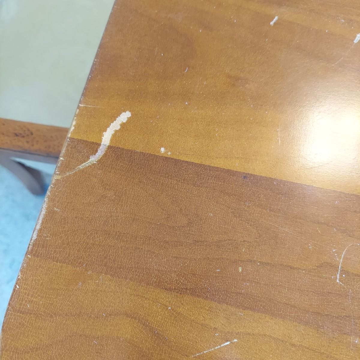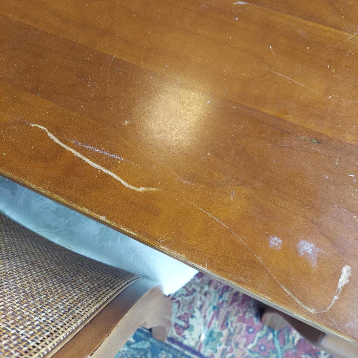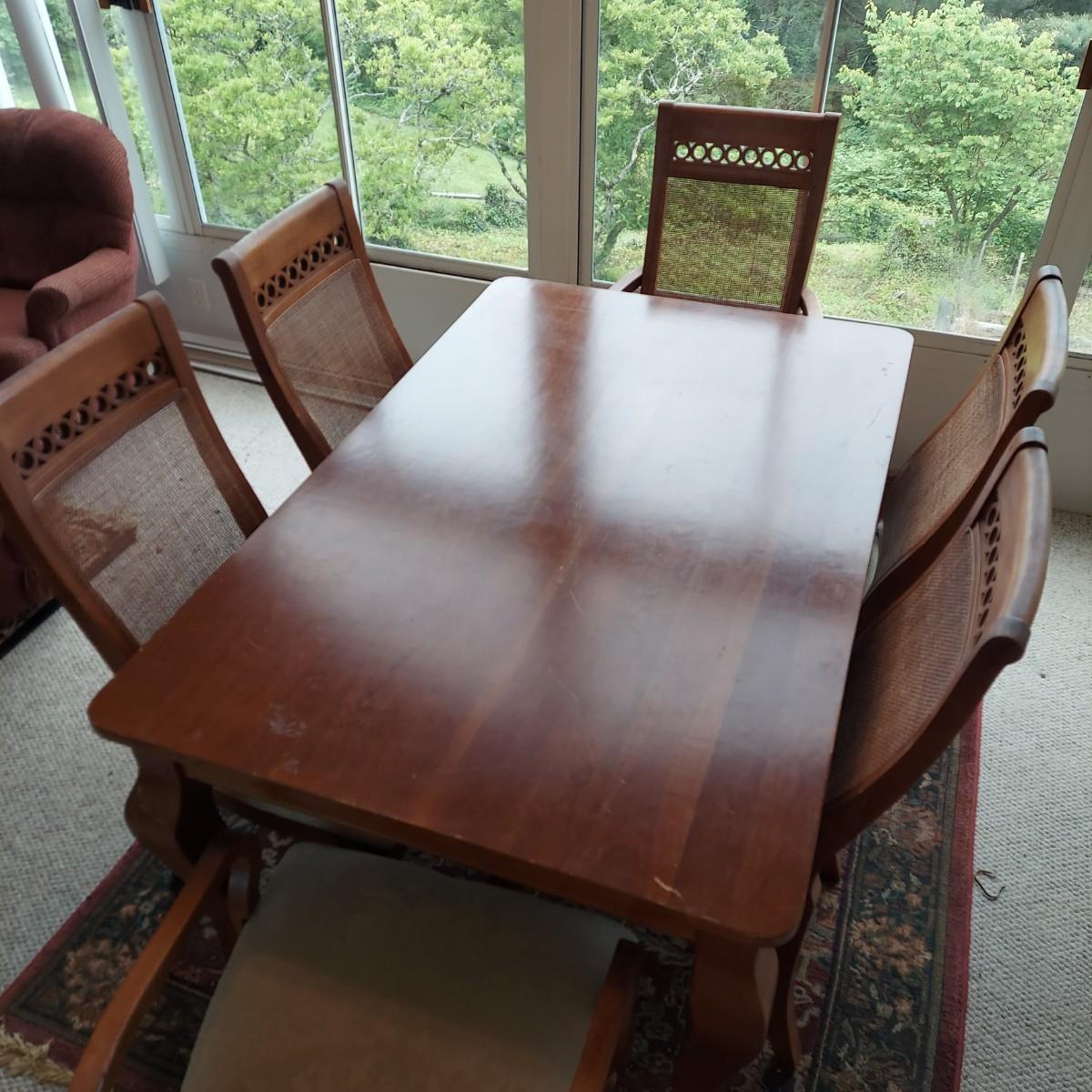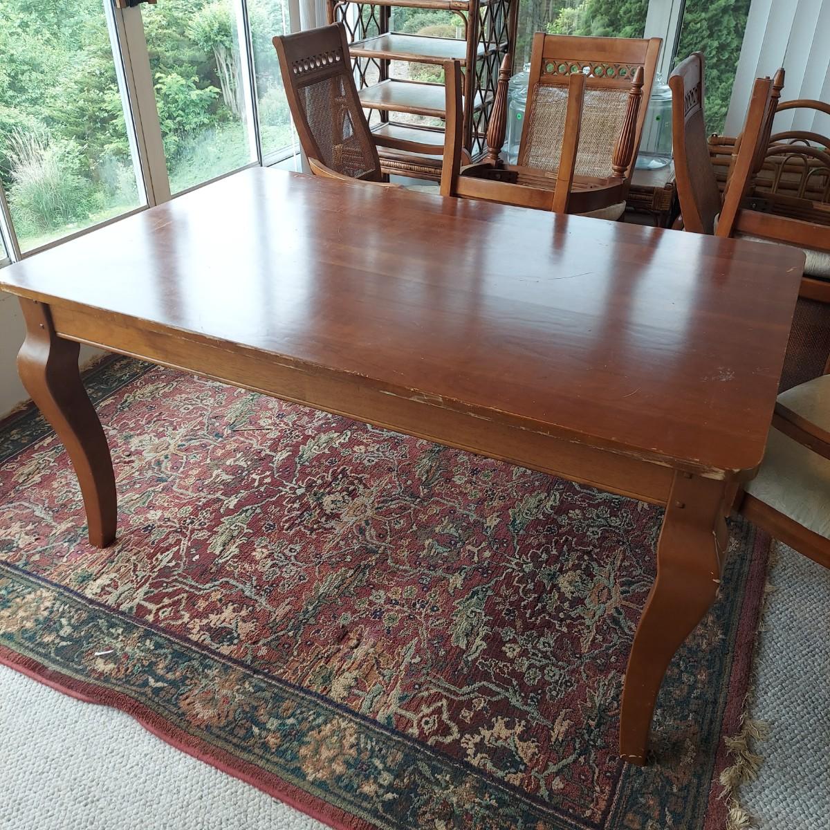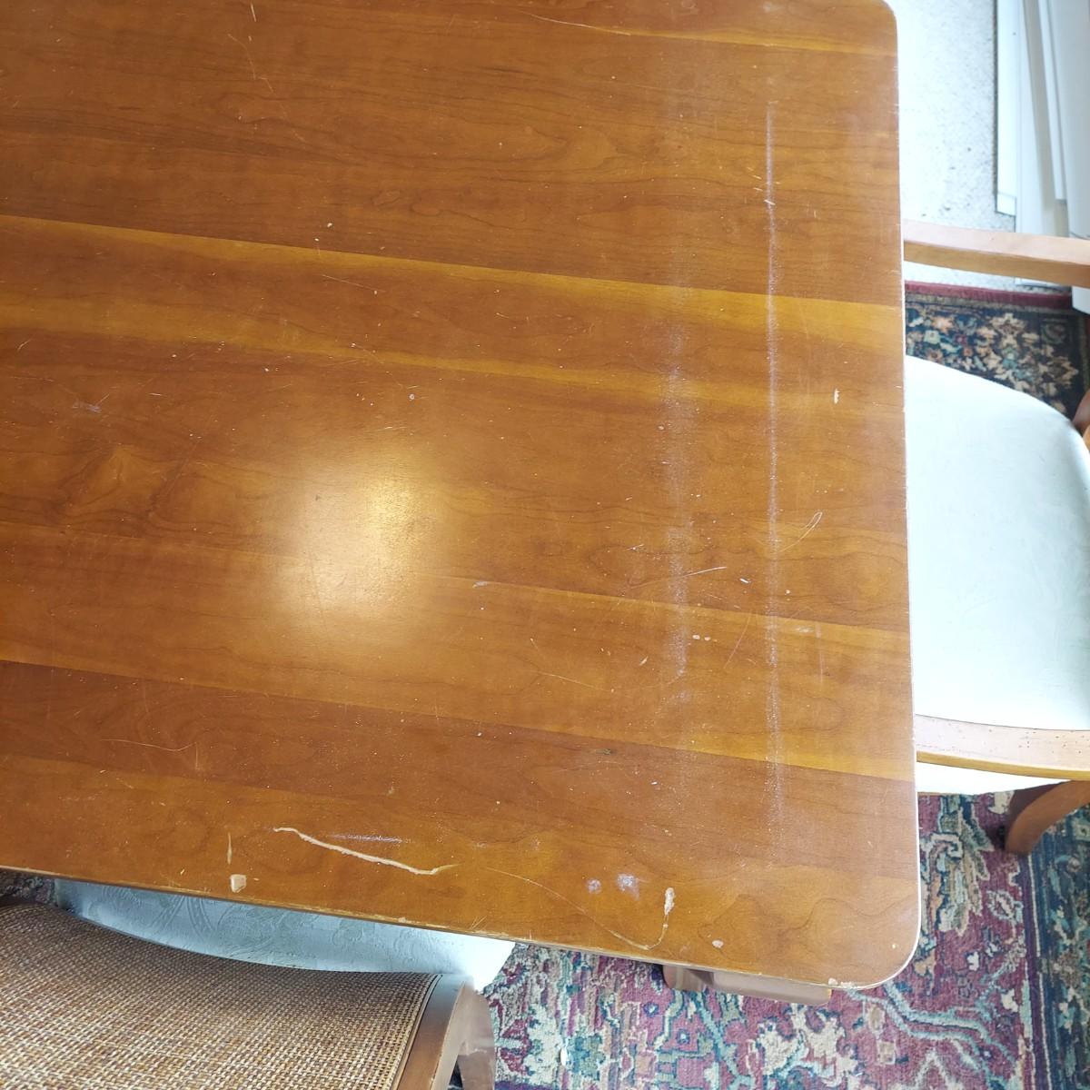 Lot includes wooden dining table that measures 60” x 38” x 30"H. Plus six chairs with upholstered seats. Two chairs have arms and are therefore a bit wider measuring 23” x 21” x 41"H with a 19"H seat height. There are overall condition issues including one chair with damage to cane, another chair with a spot on the seat and table has several scratches. Please see photos for details. Local Pickup Only. Winning bidder must bring assistance to help move and load this item due to its weight and/or size.