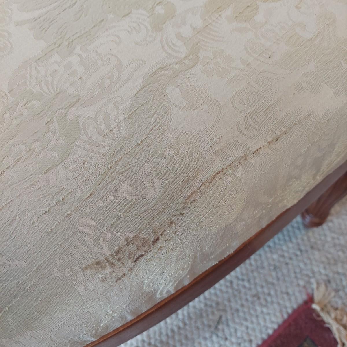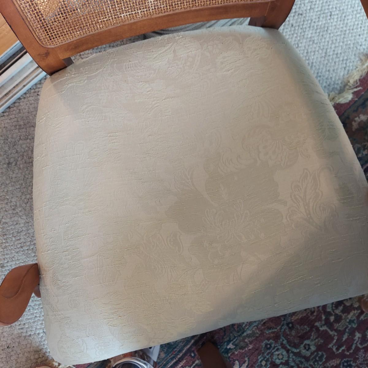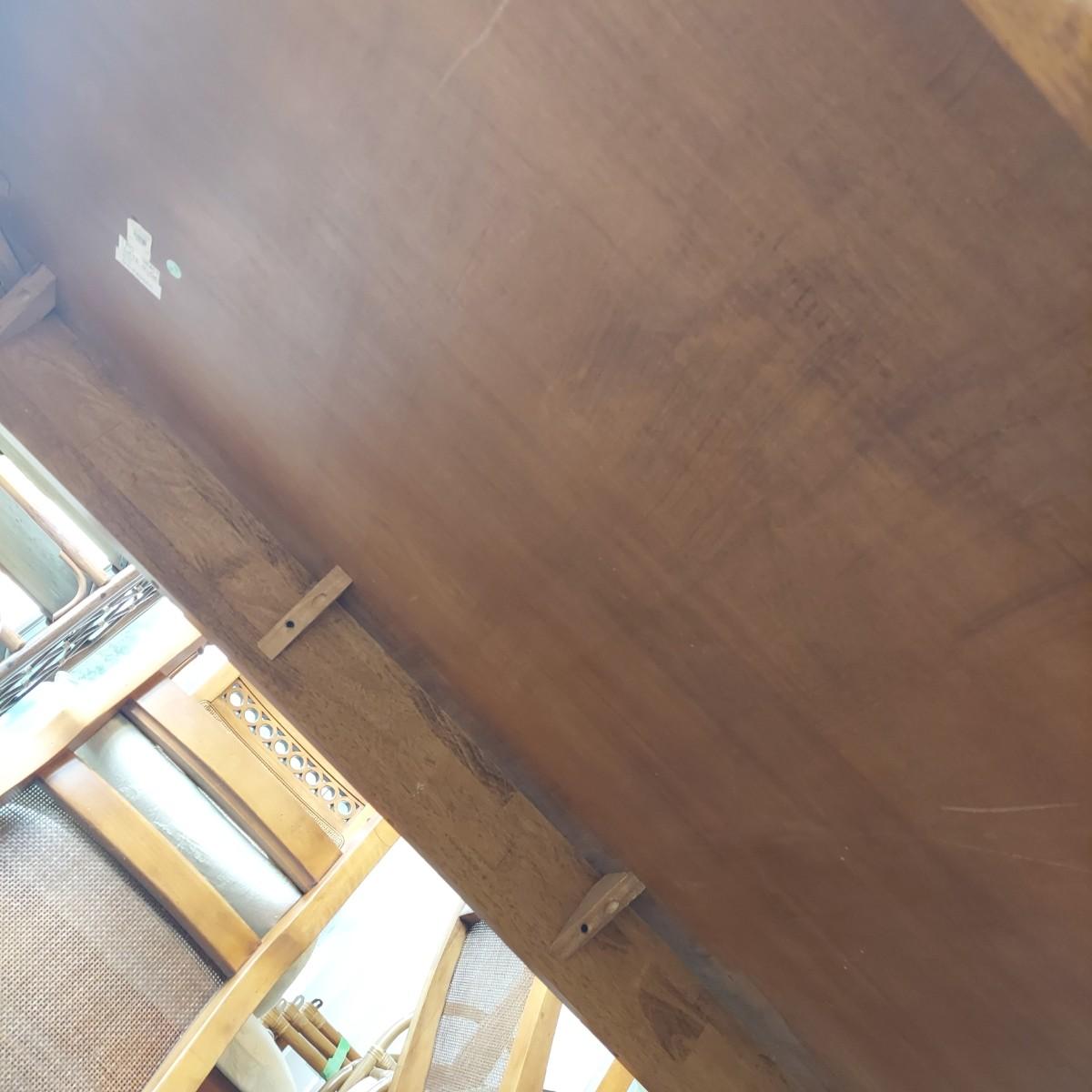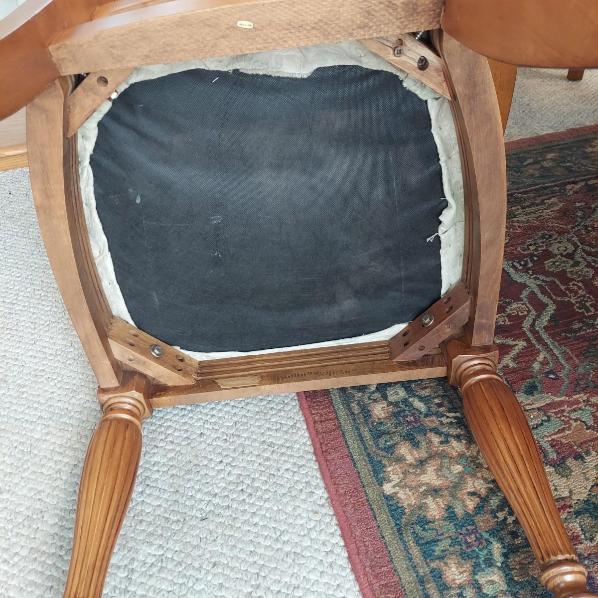 Lot includes wooden dining table that measures 60” x 38” x 30"H. Plus six chairs with upholstered seats. Two chairs have arms and are therefore a bit wider measuring 23” x 21” x 41"H with a 19"H seat height. There are overall condition issues including one chair with damage to cane, another chair with a spot on the seat and table has several scratches. Please see photos for details. Local Pickup Only. Winning bidder must bring assistance to help move and load this item due to its weight and/or size.