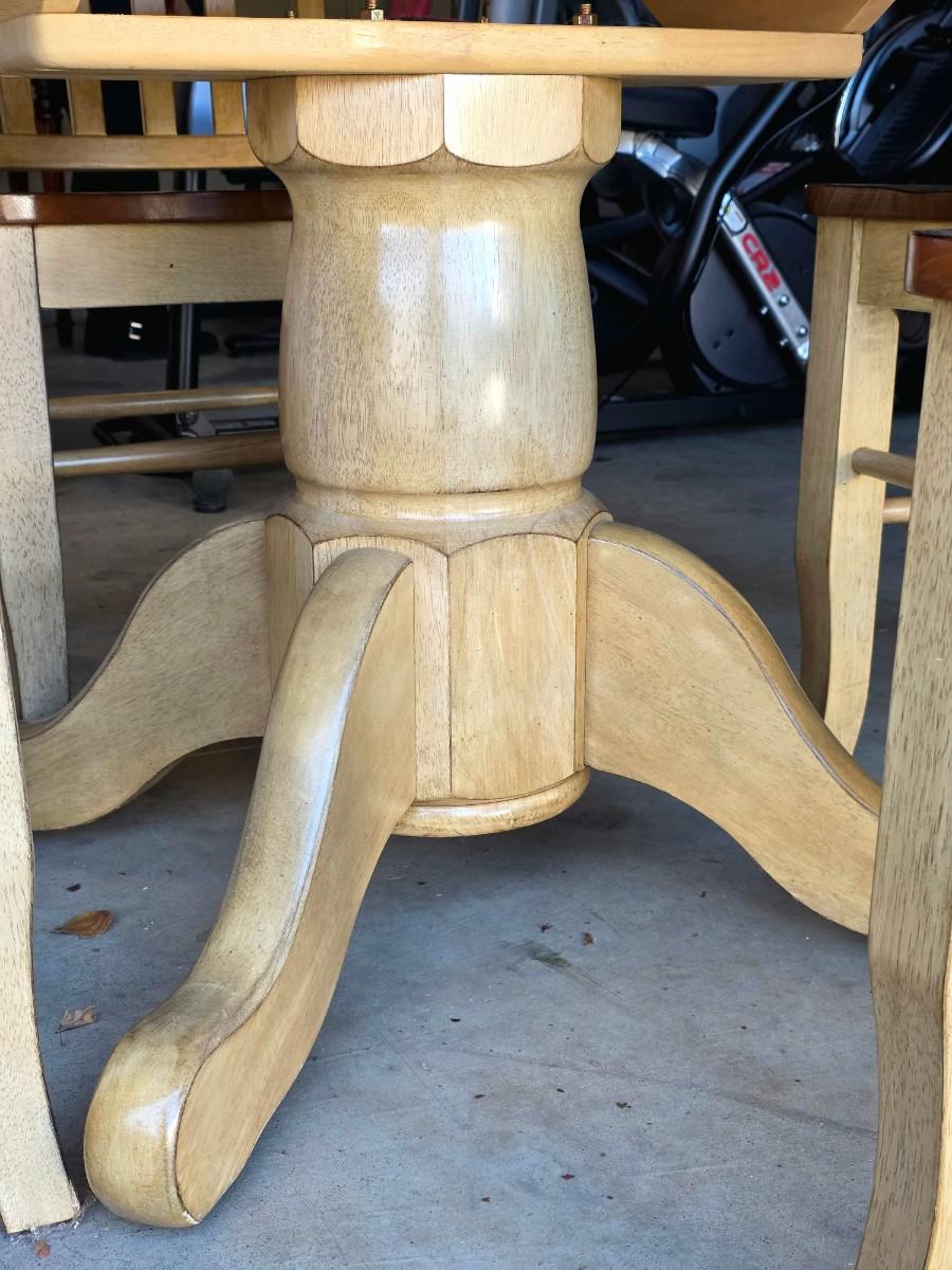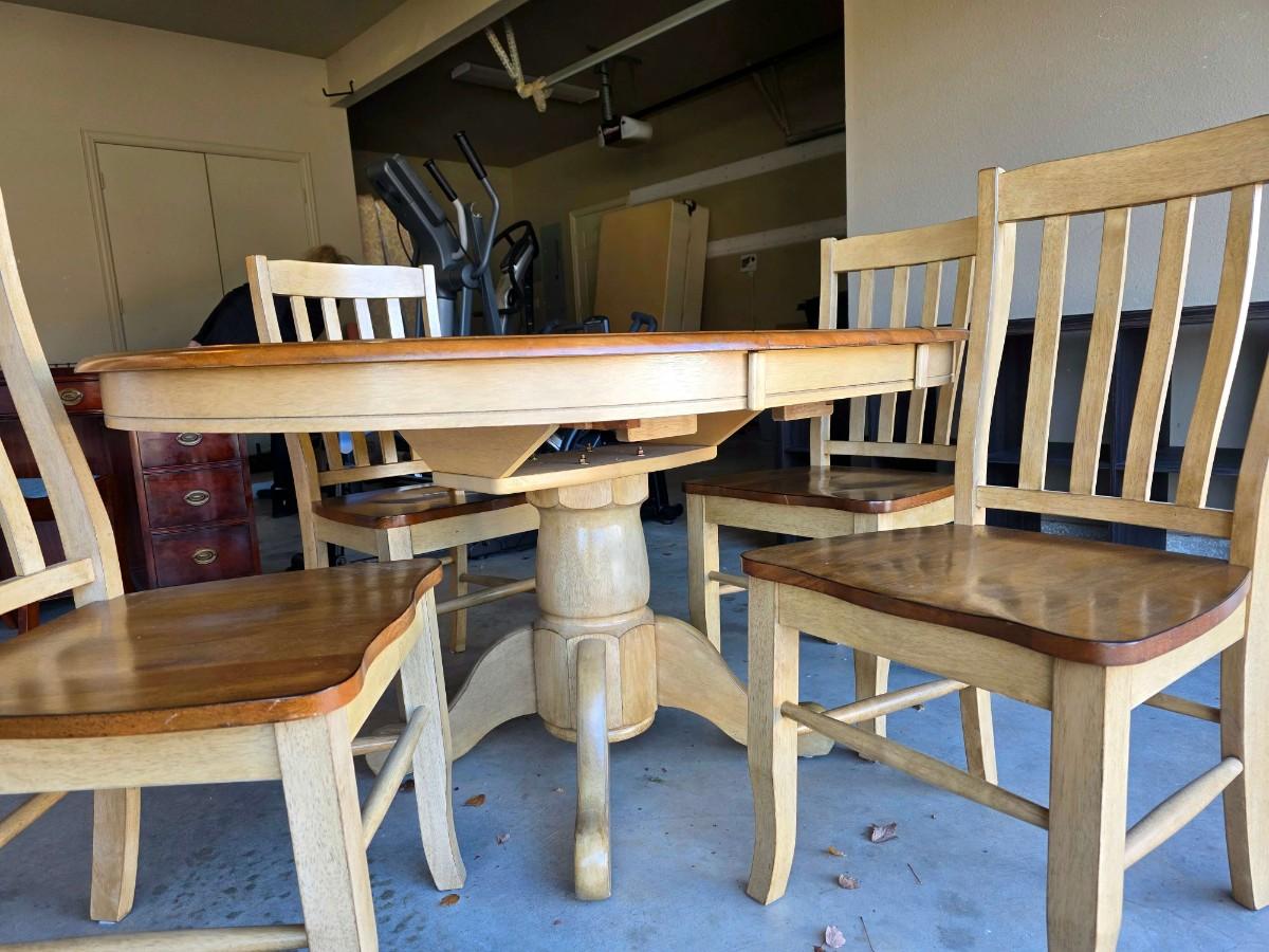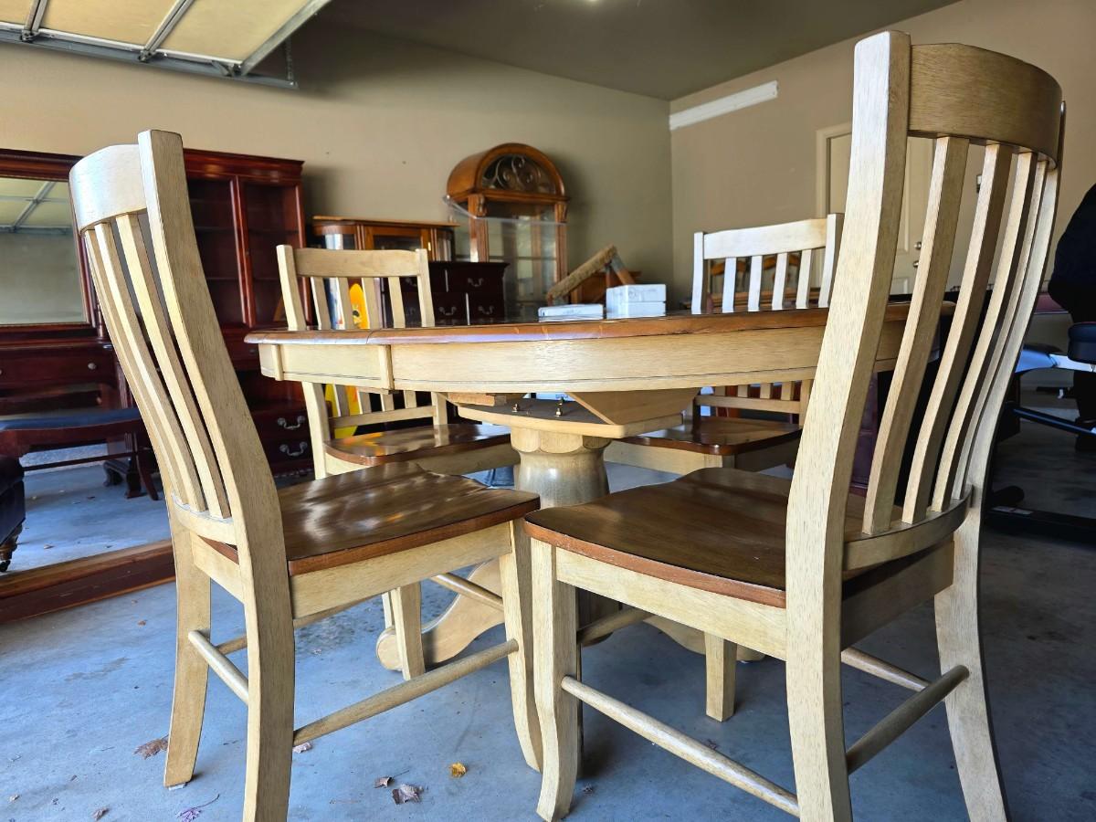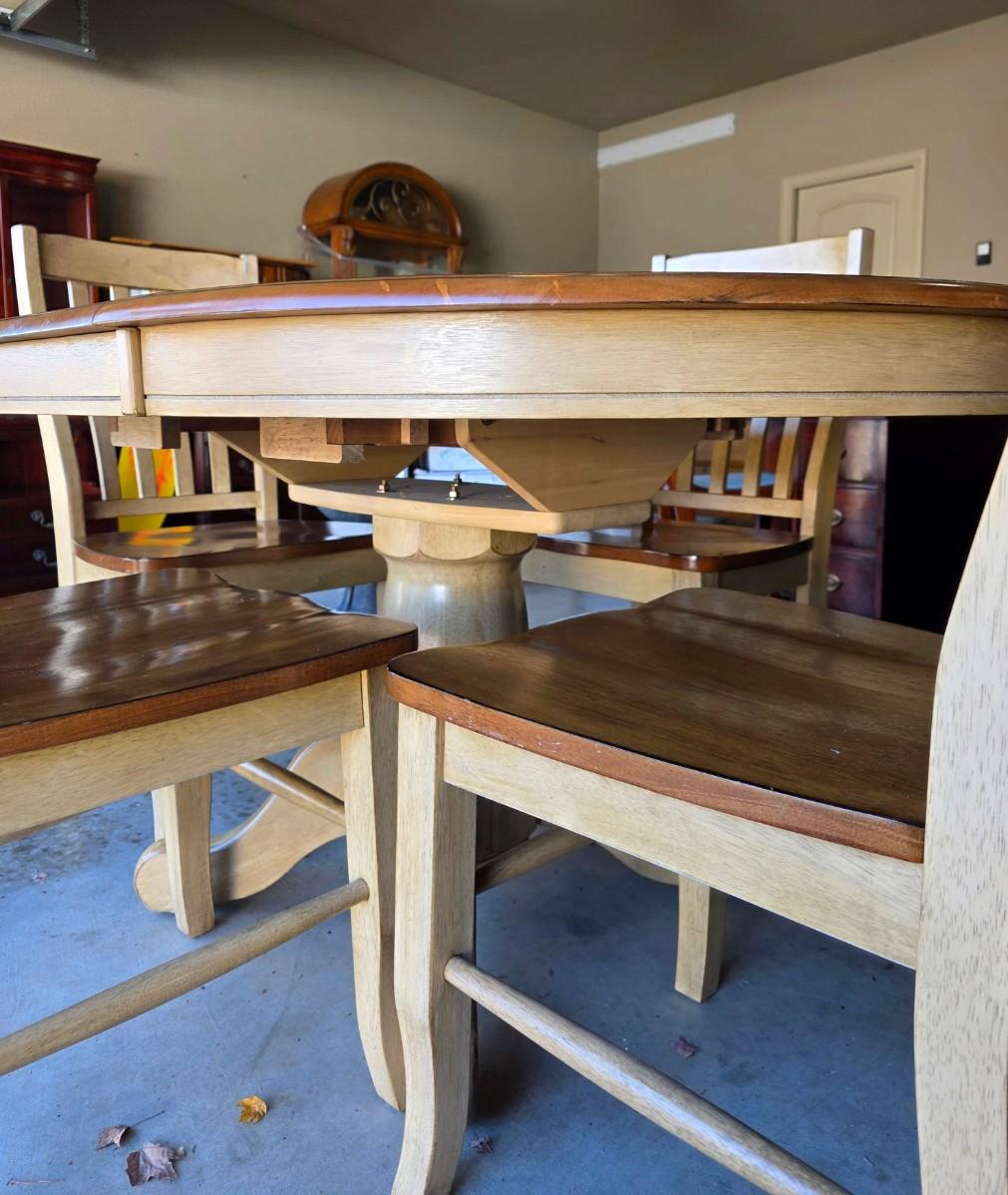 Round/Oval pedestal dining table with expandable butterfly leaf and 4 chairs. With leaf measurements are 56"L x 15"W x 30"H. Beautiful 2 tone, light wood and distressed cream. Very good condition. Few very minor superficial discolorations on top as pictured.