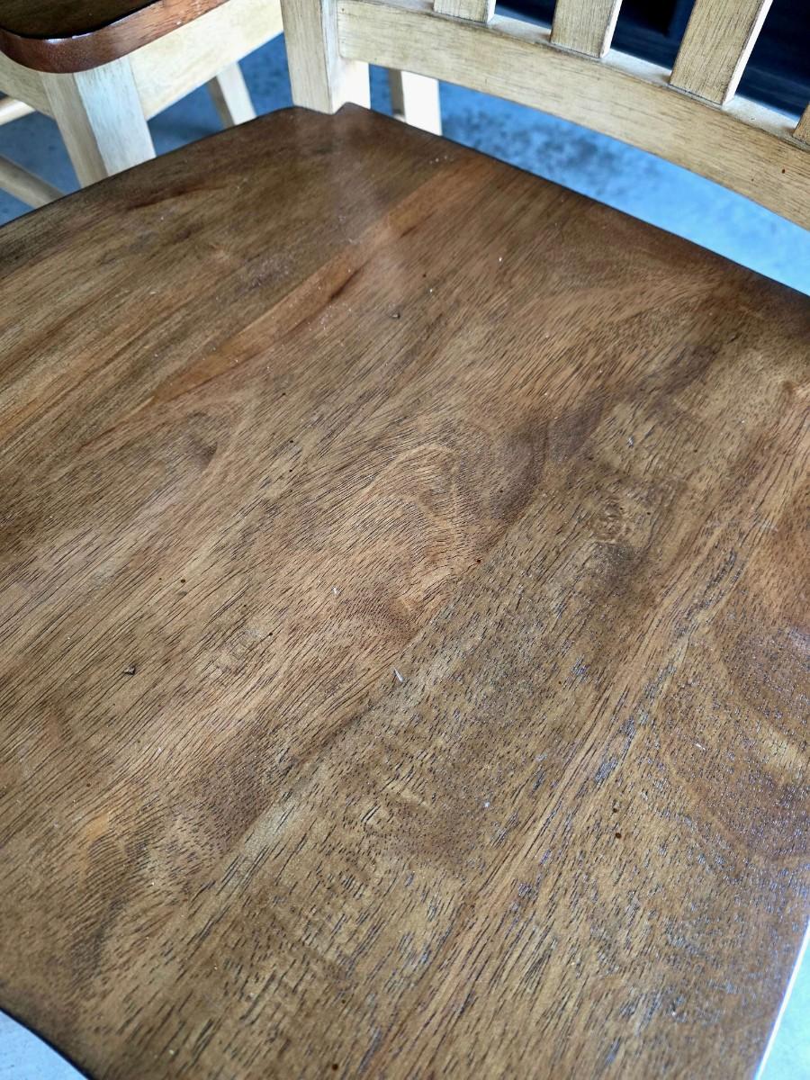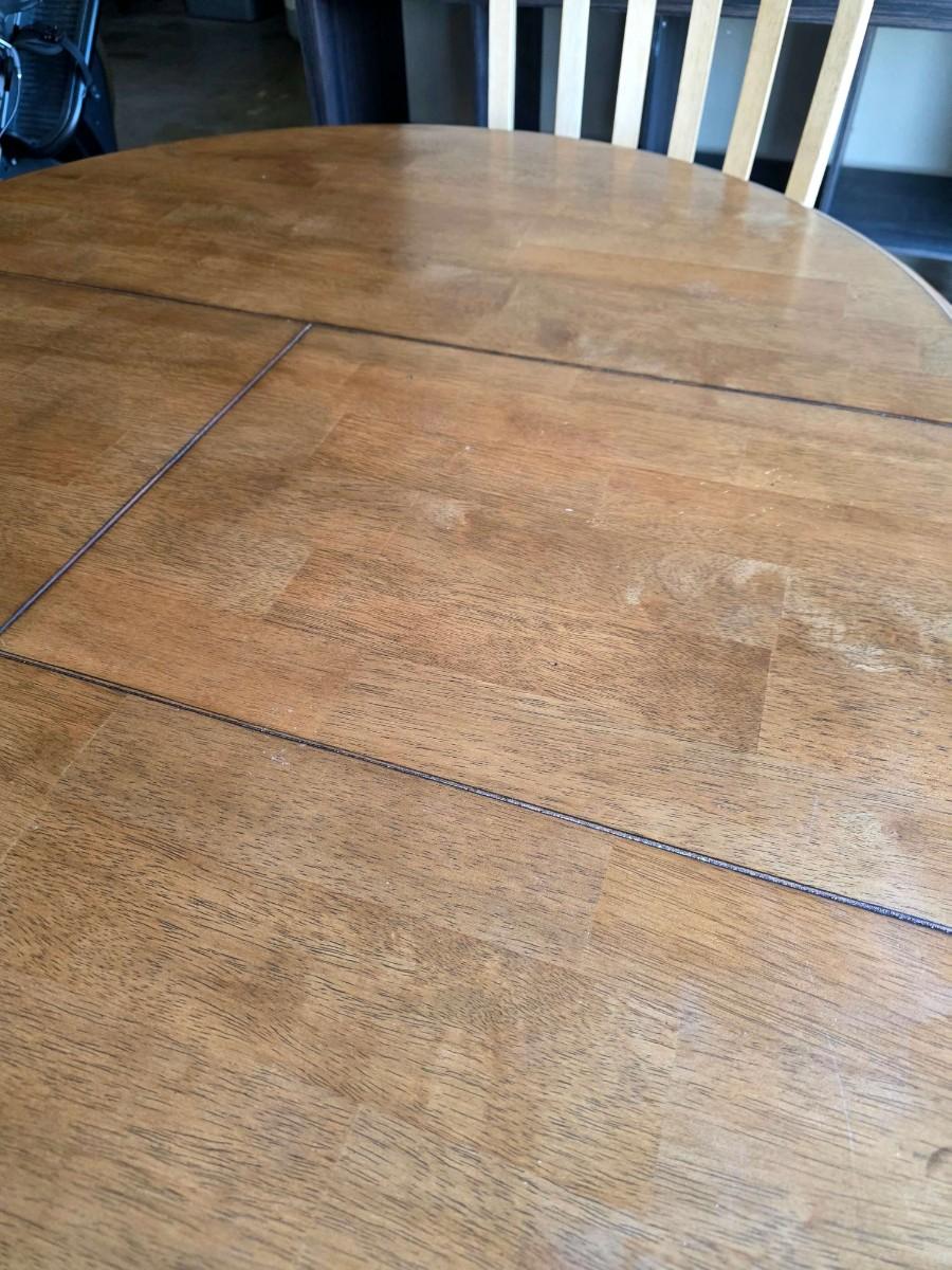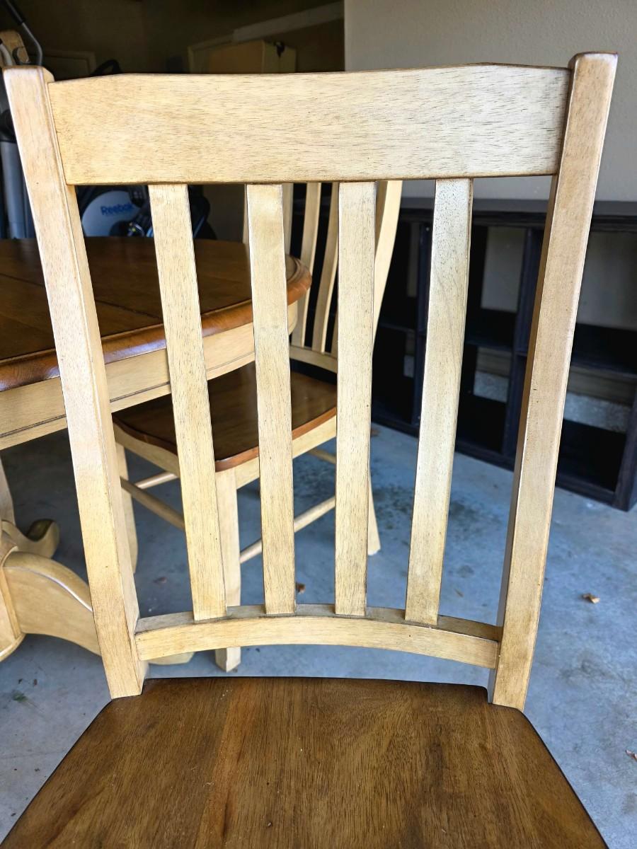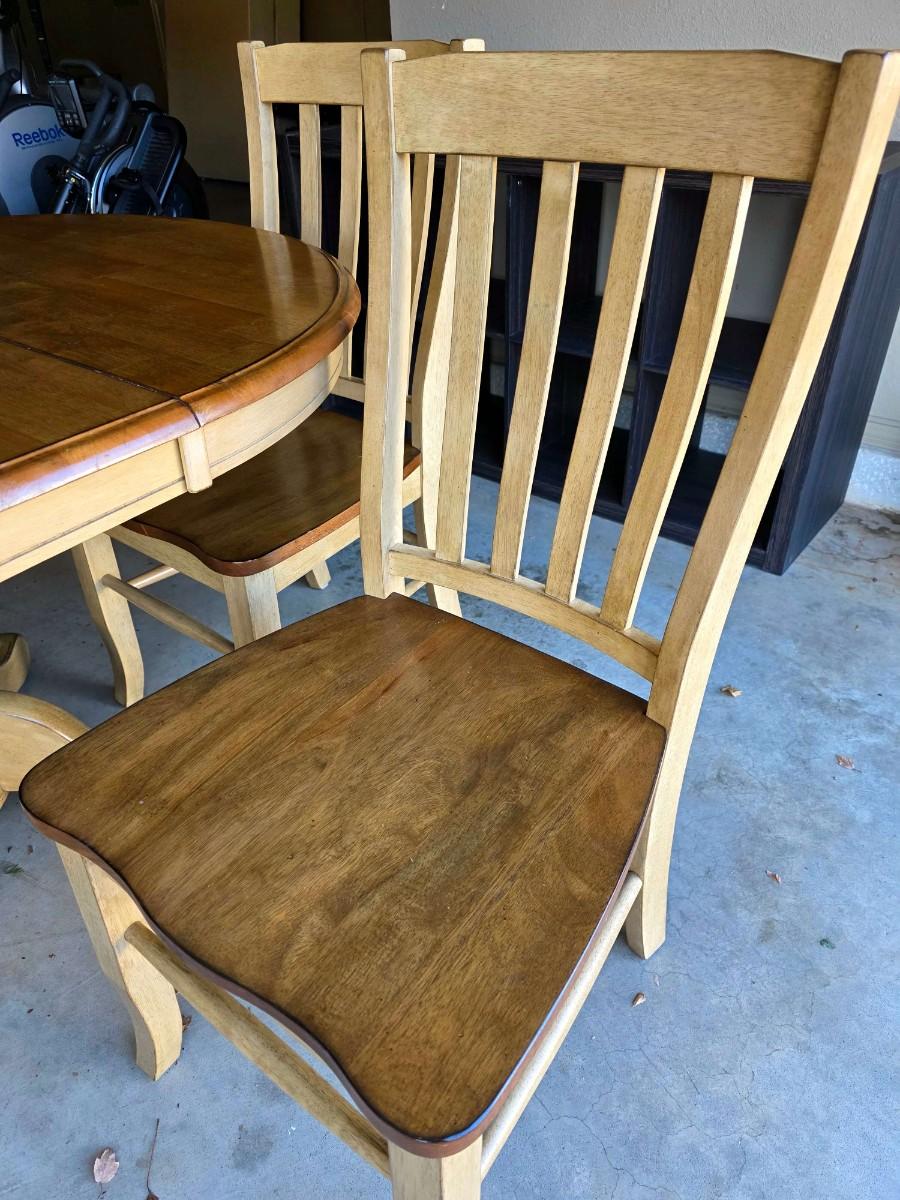 Round/Oval pedestal dining table with expandable butterfly leaf and 4 chairs. With leaf measurements are 56"L x 15"W x 30"H. Beautiful 2 tone, light wood and distressed cream. Very good condition. Few very minor superficial discolorations on top as pictured.