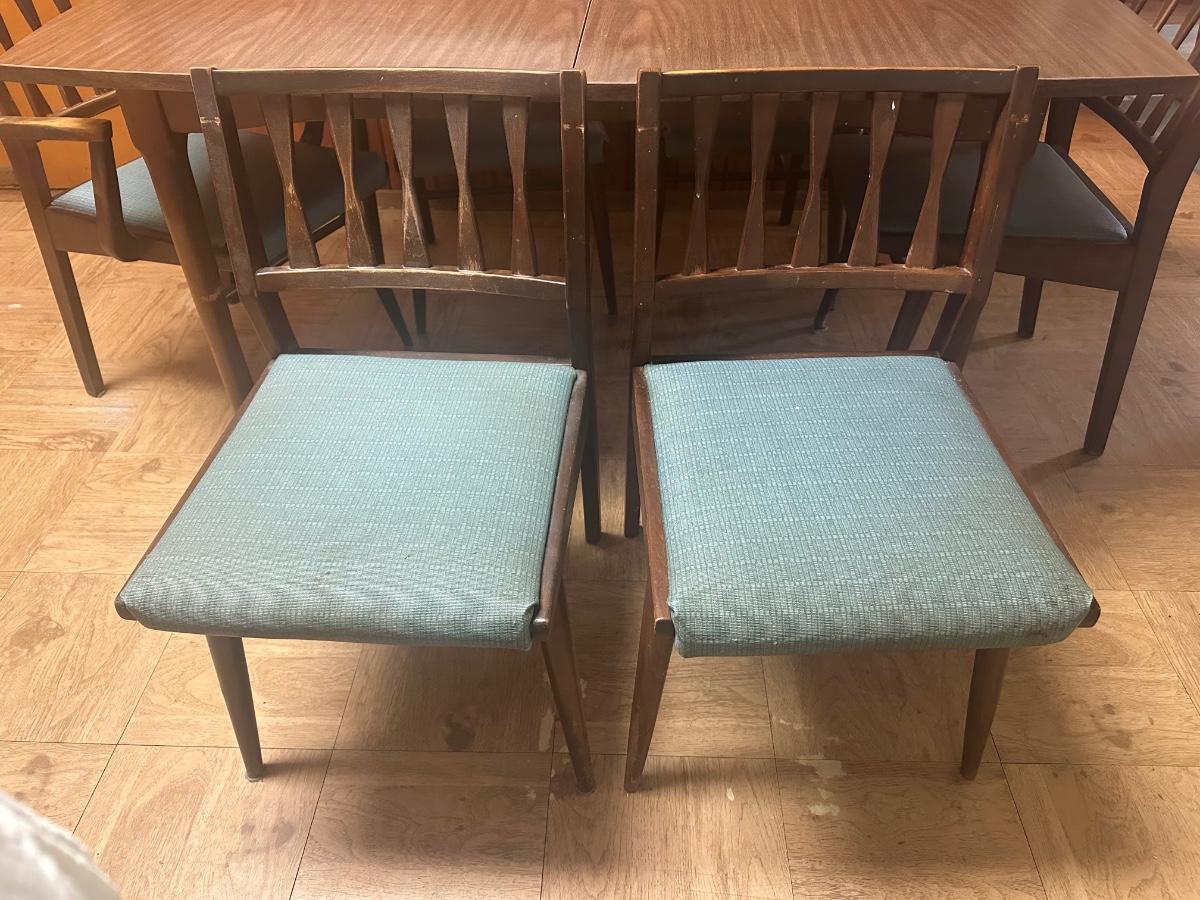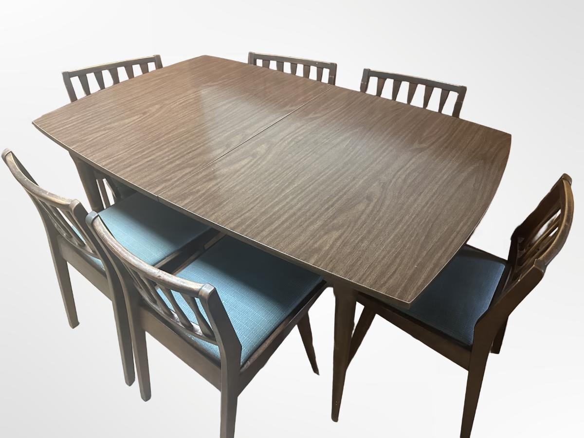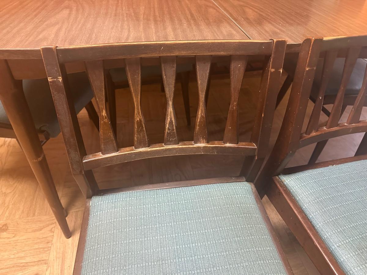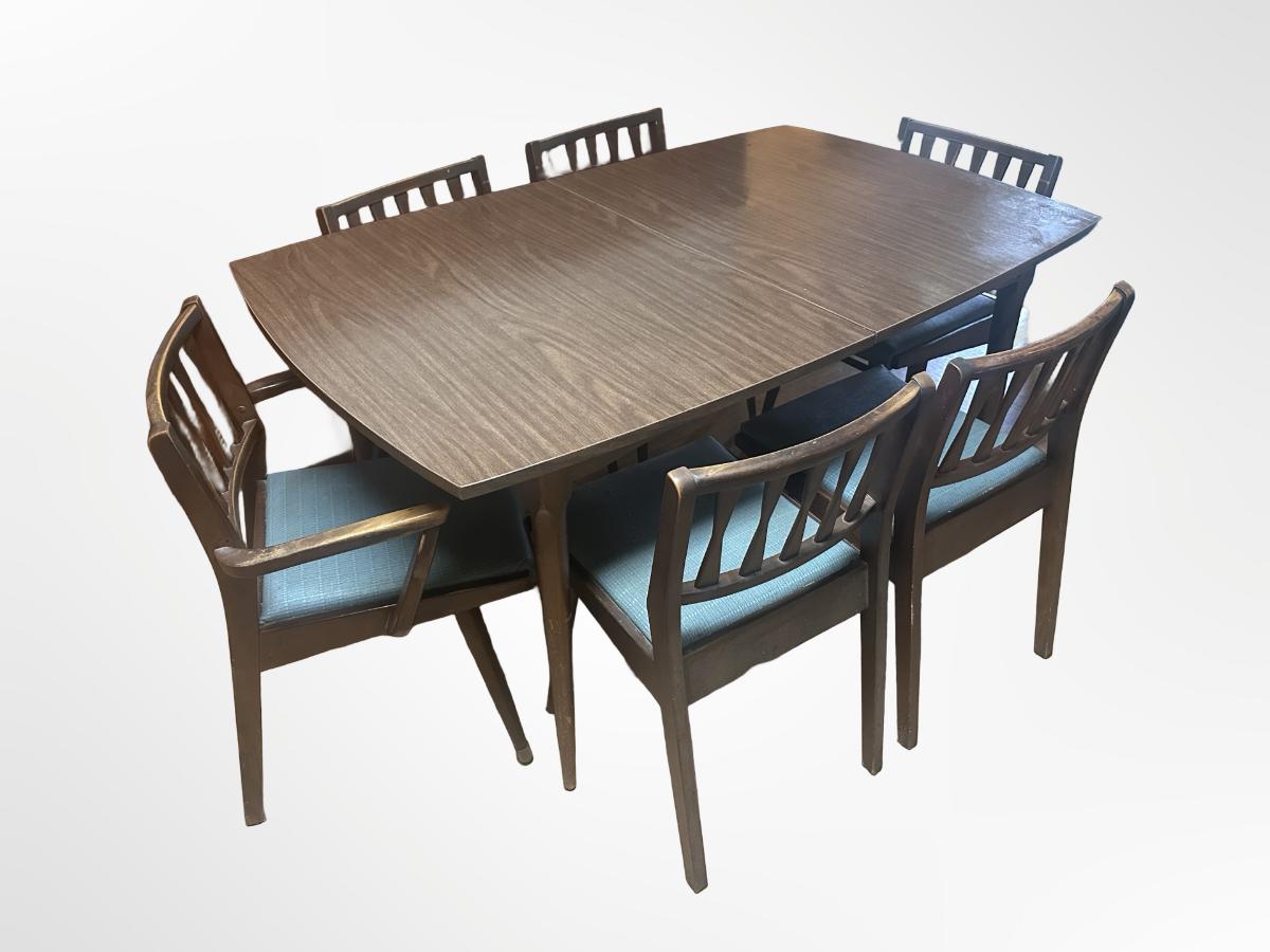 Vintage wooden dining set with a Danish walnut finish. Includes table and six matching chairs. Some surface wear from use; sturdy overall.