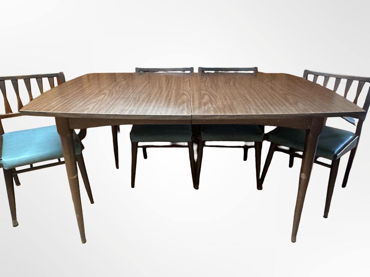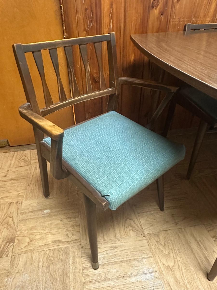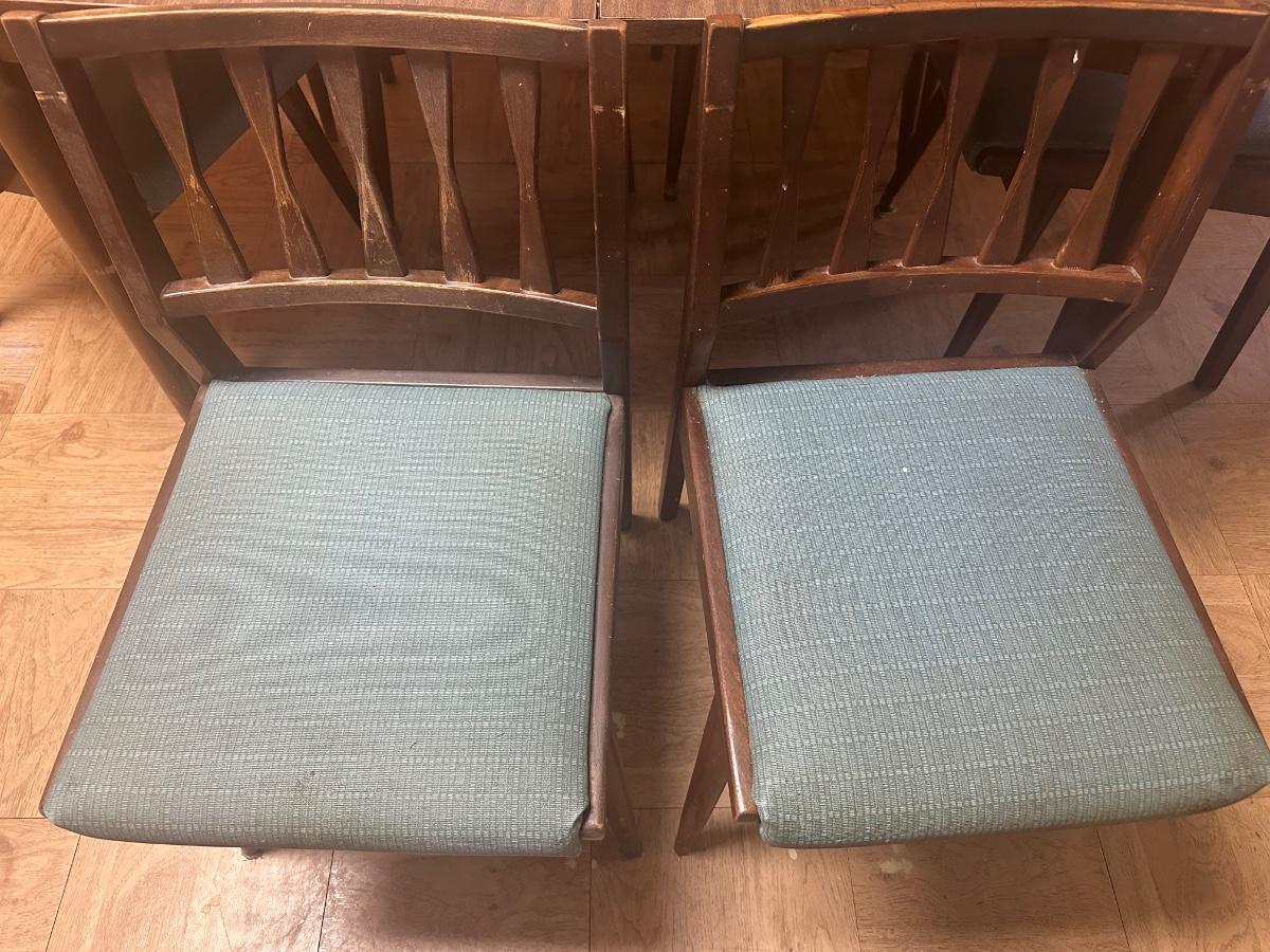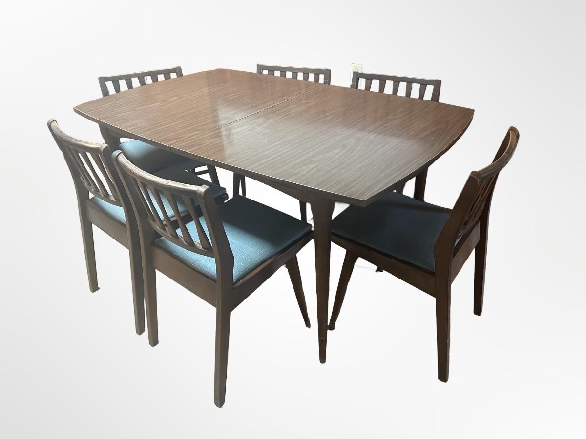 Vintage wooden dining set with a Danish walnut finish. Includes table and six matching chairs. Some surface wear from use; sturdy overall.