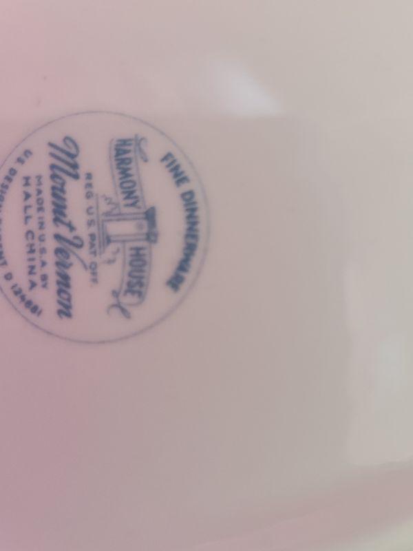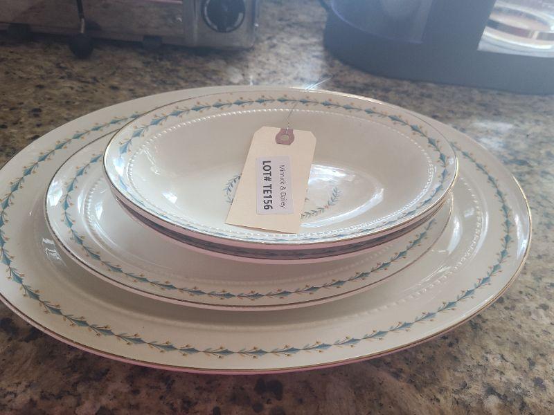Dinnerware in good conditon contains a serving plate, a plate, and small soup bowls