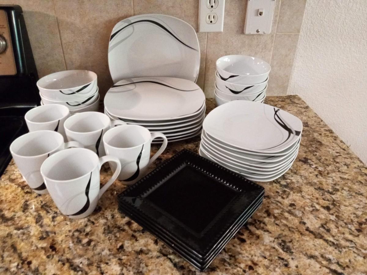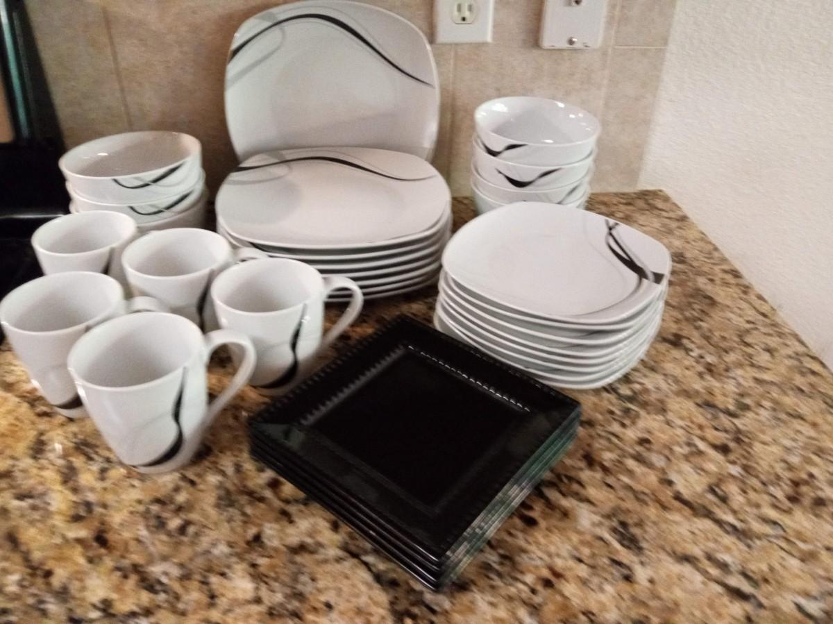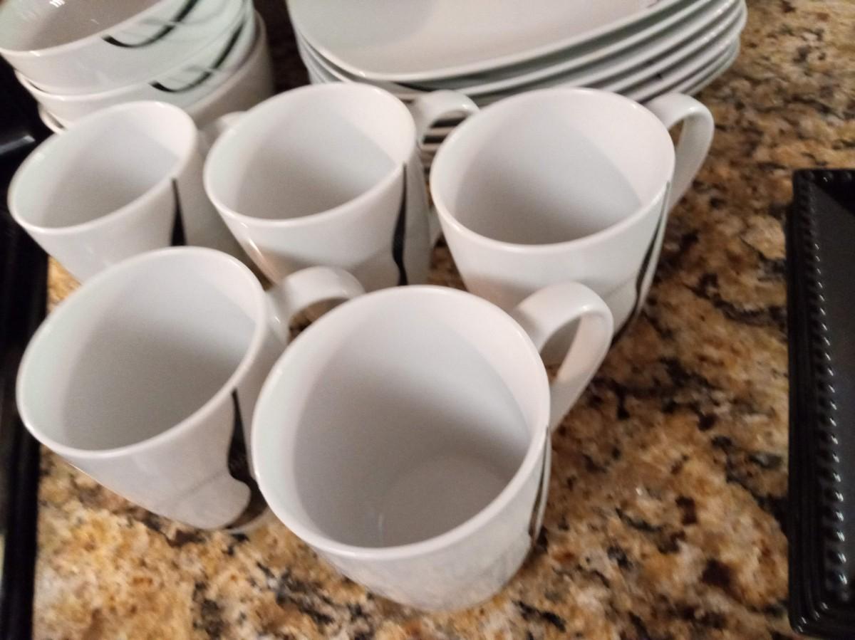 THERE ARE 8 DINNER PLATES, 8 SALAD PLATES, 7 BOWLS, 5 COFFEE MUGS, 4 BLACK PLATES THAT DIDN'T ORIGINALLY GO WITH THIS SET