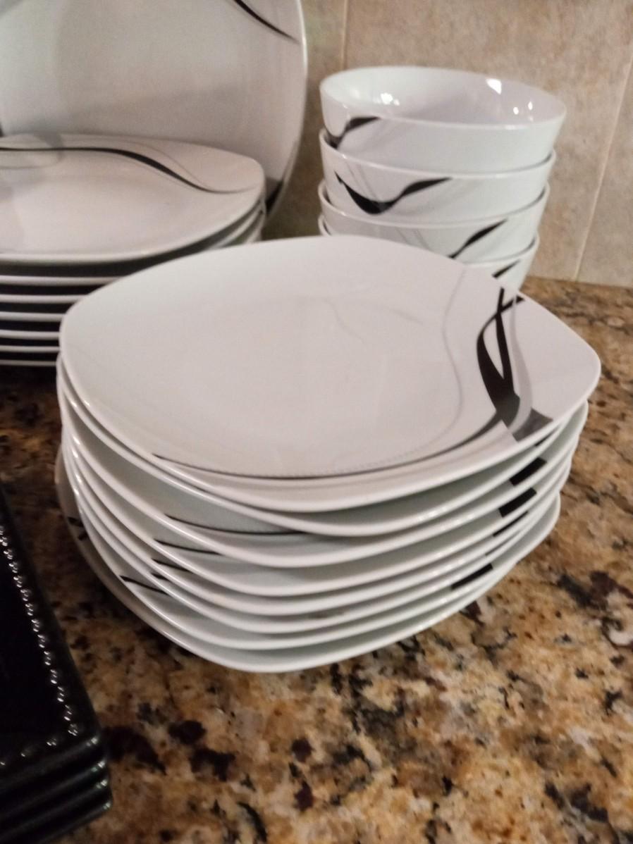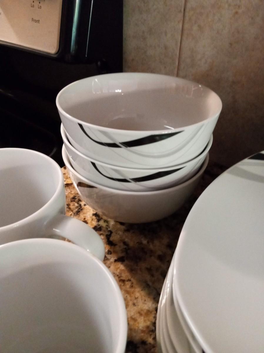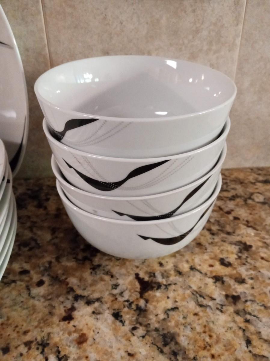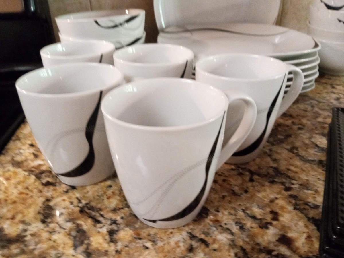 THERE ARE 8 DINNER PLATES, 8 SALAD PLATES, 7 BOWLS, 5 COFFEE MUGS, 4 BLACK PLATES THAT DIDN'T ORIGINALLY GO WITH THIS SET