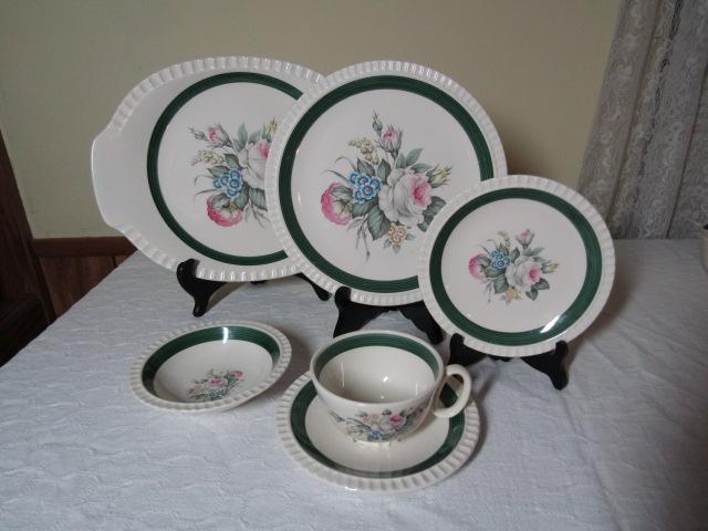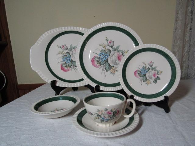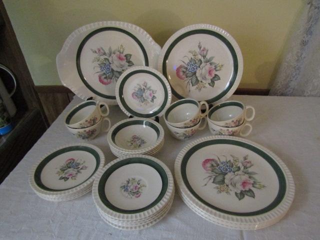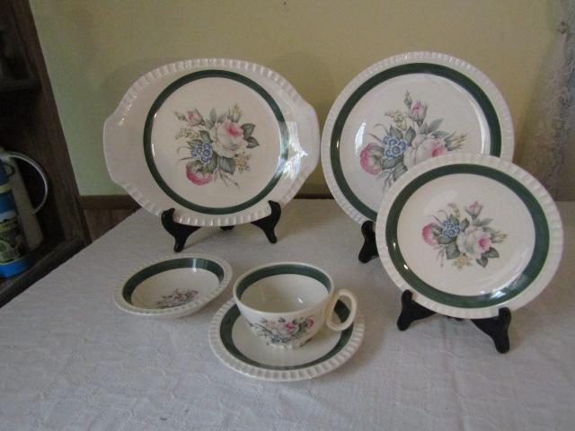 Dinnerware- Antoinette by Salem China Co. -29 Pieces: 1 Serving Platter, 5 Dinner Plates, 6 Bread Plates, 6 Cups and Saucers, 5 Fruit Bowls. May have some scratching and chips.