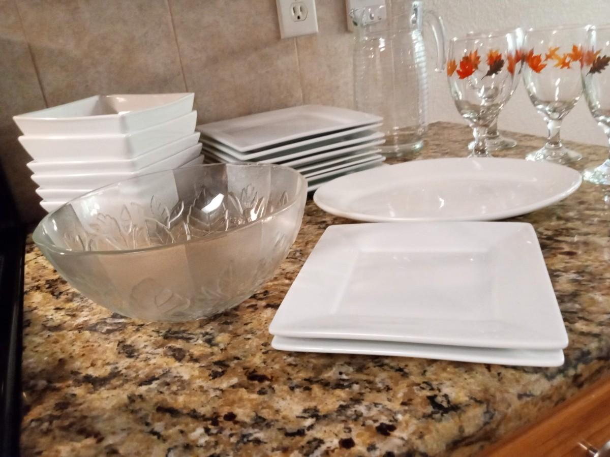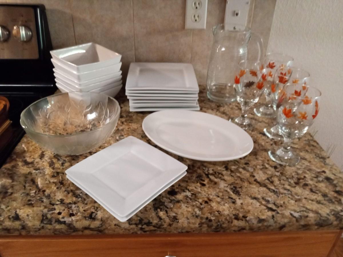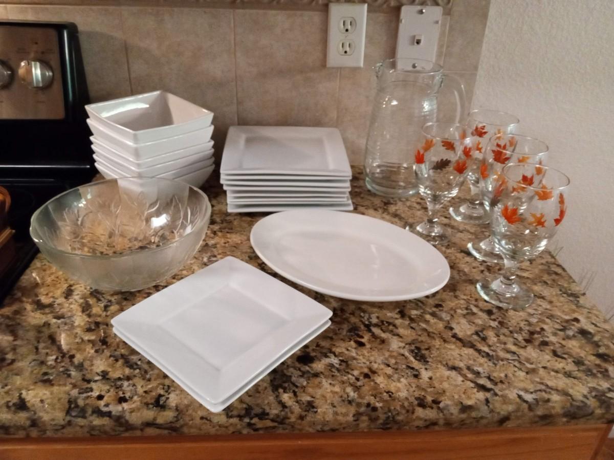 DINNERWARE, SERVING BOWL, GLASS PITCHER, STEMMED GLASSES