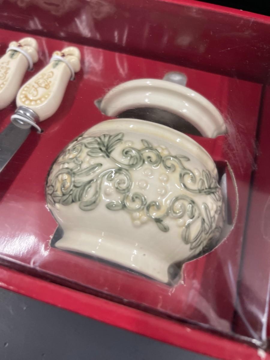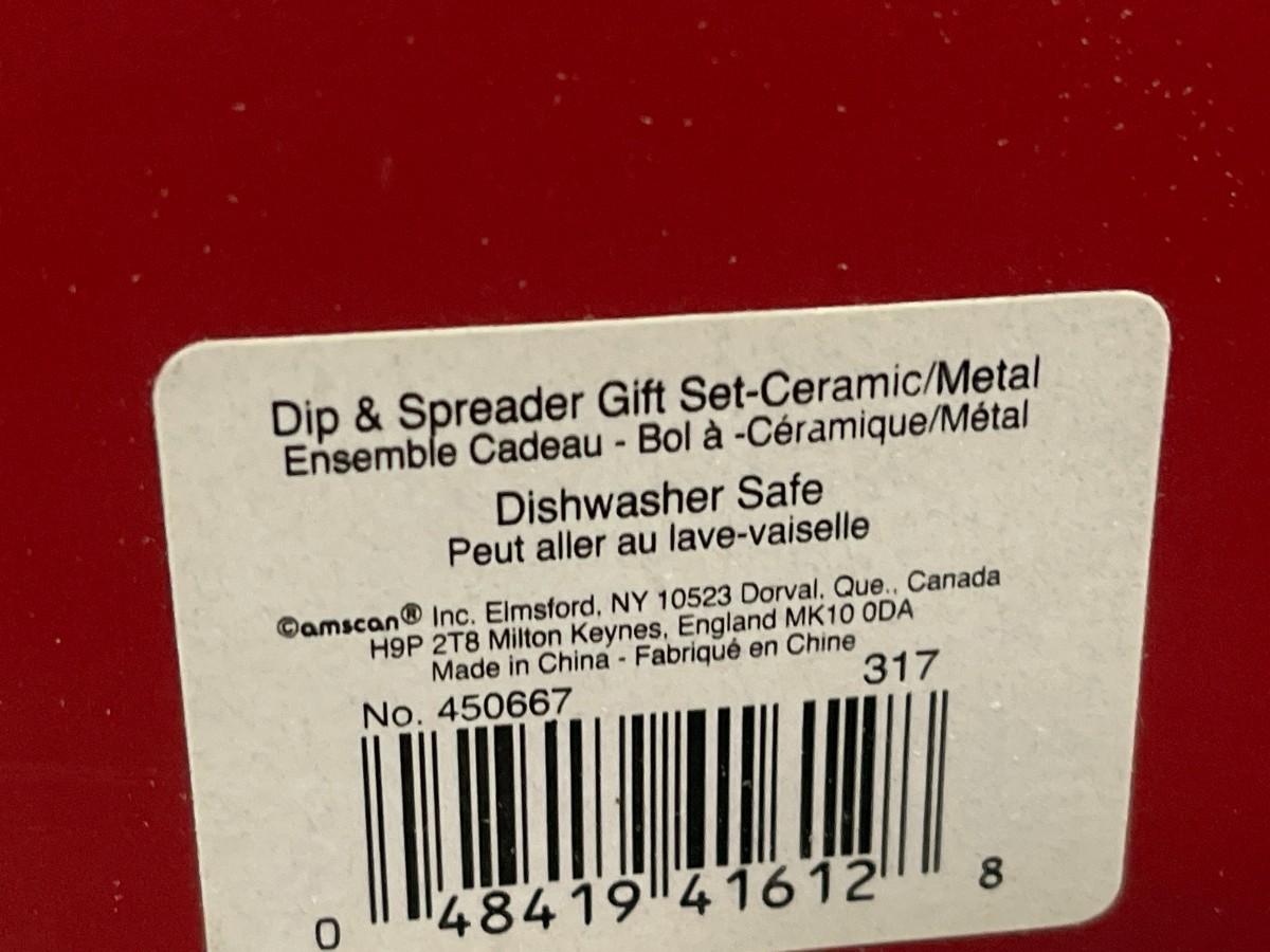 Ceramic dip and spreader gift set, new in box. Excellent condition, but box shows some wear.