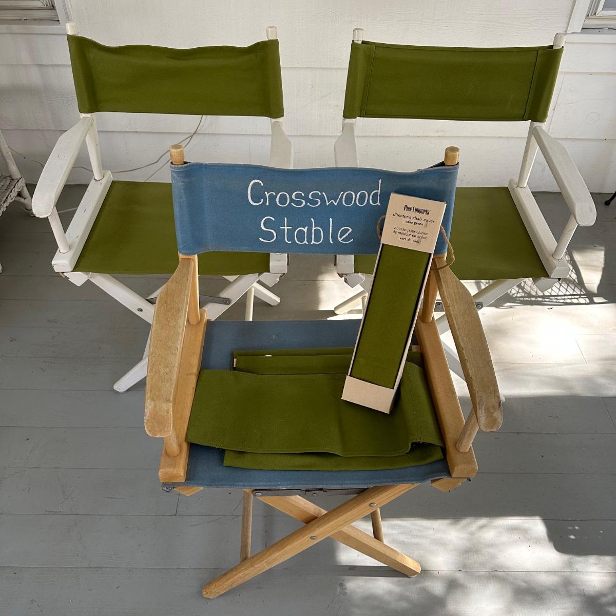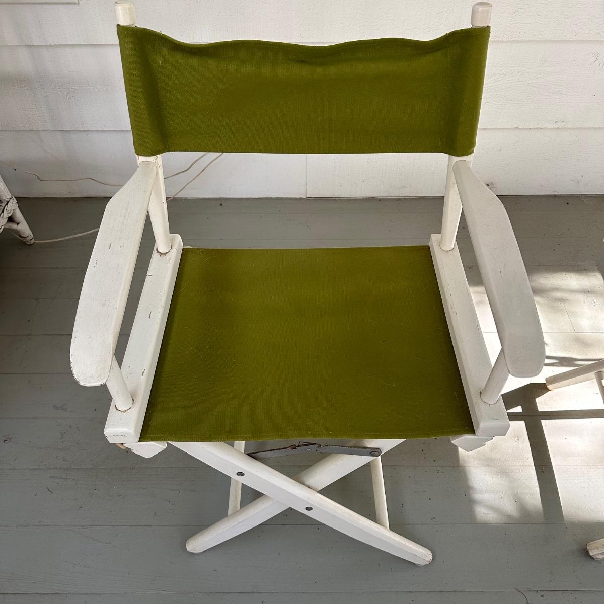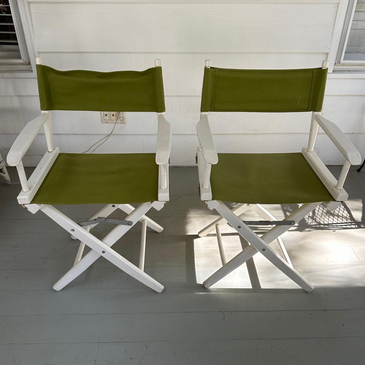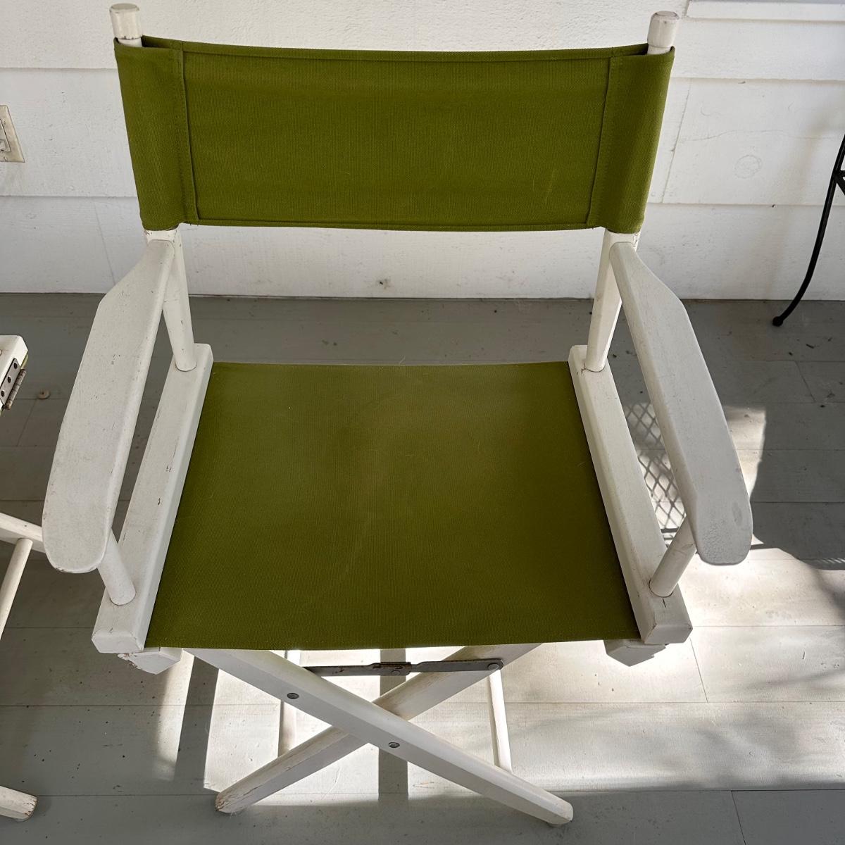 Three directors chairs with white frames that measure 22” x 16” x 34.5”H. Extra "Director's Chair Covers" are included. Local pickup only.