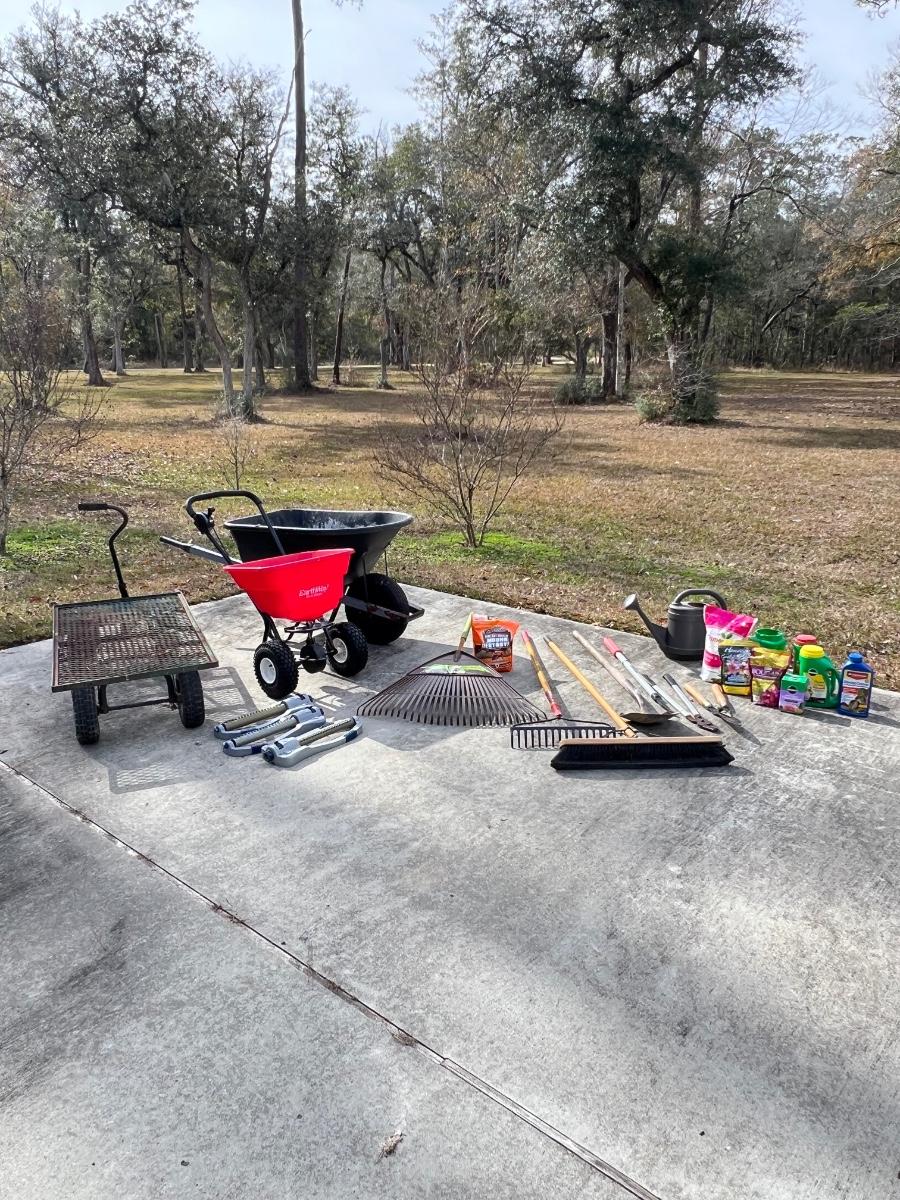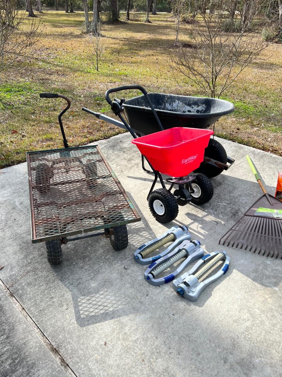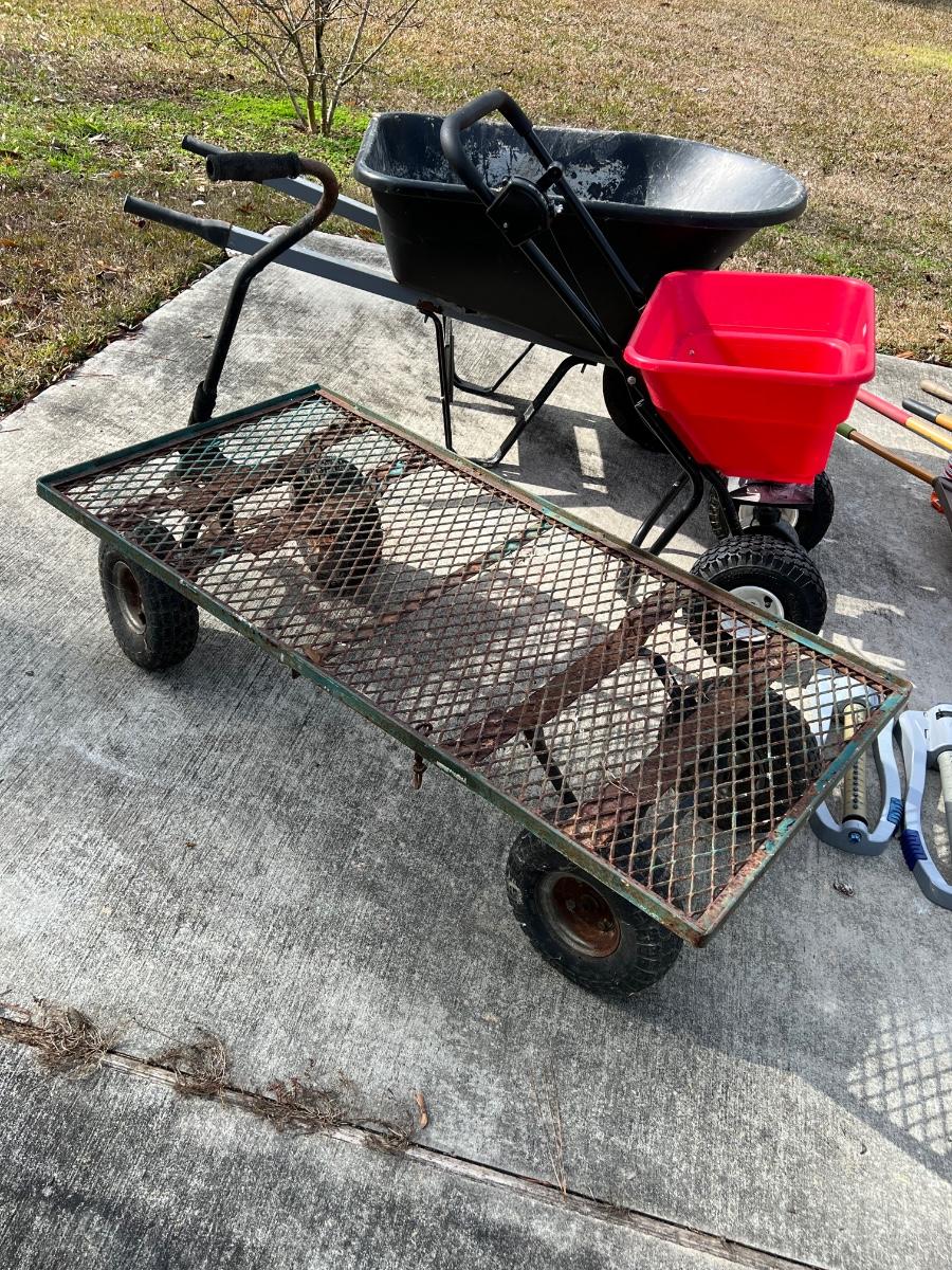 Includes everything pictured ~ Wheelbarrow & cart have surface rust, see photos ~ Some products included have never been opened or they're half way full or more ~ Cart = 12.5” H x 48” W x 24” D