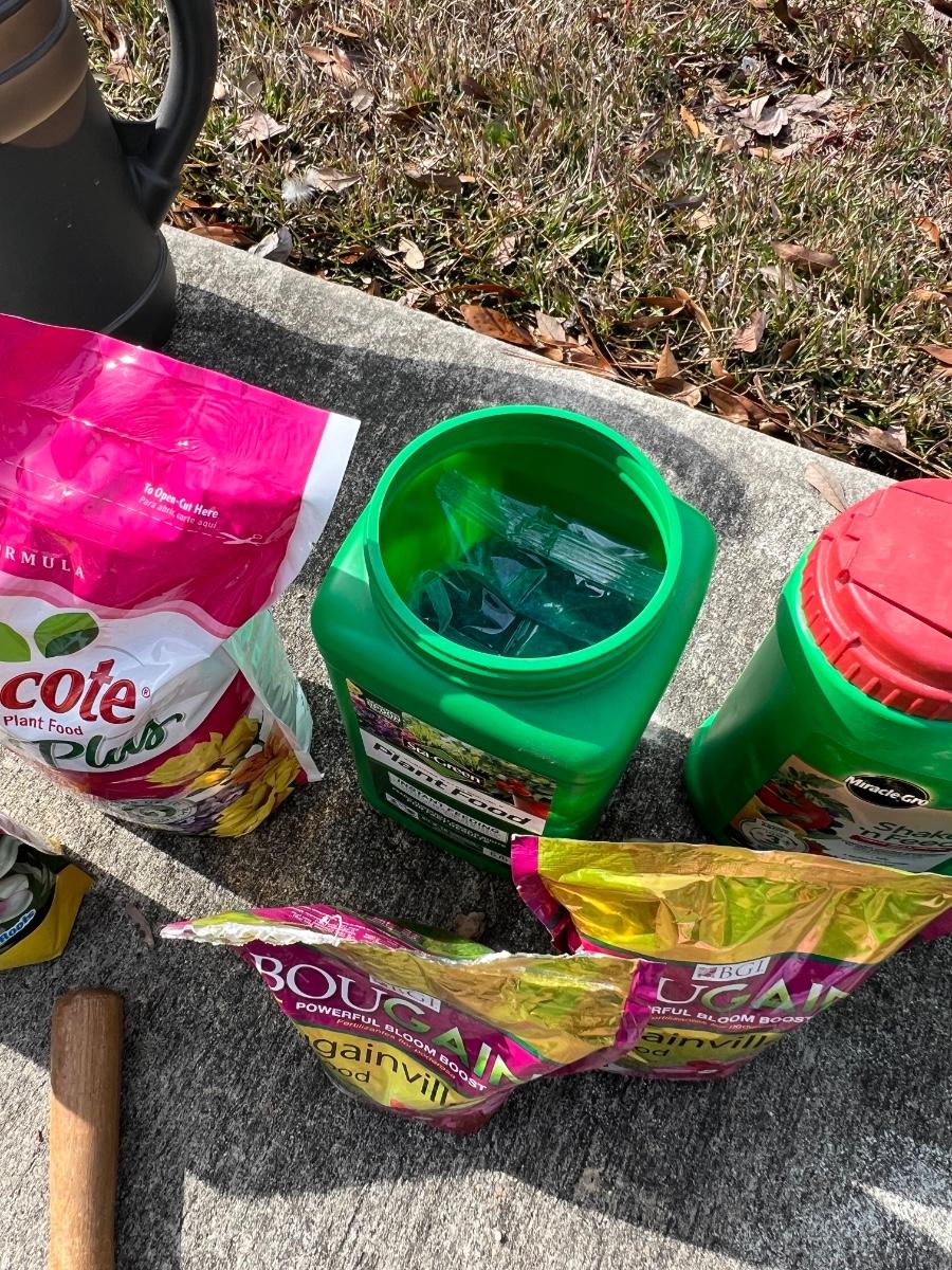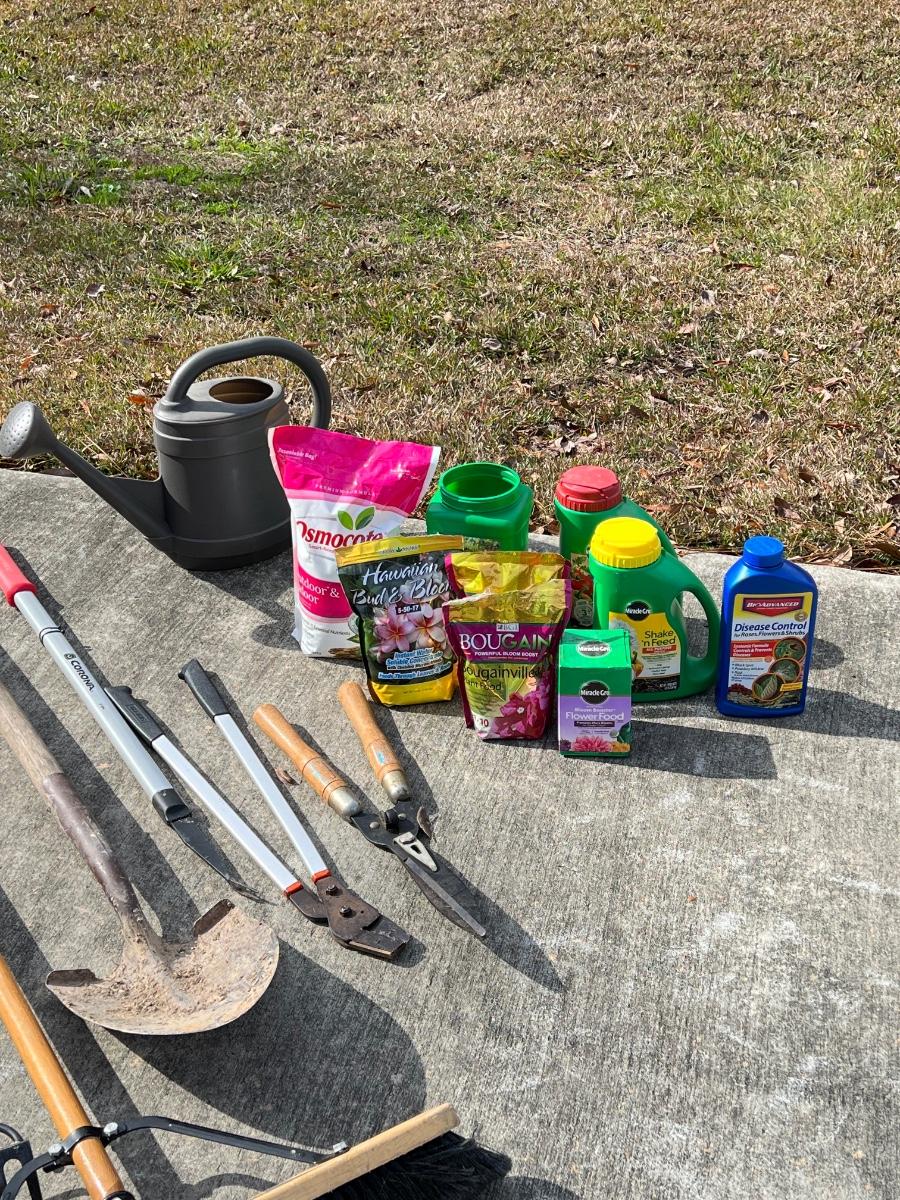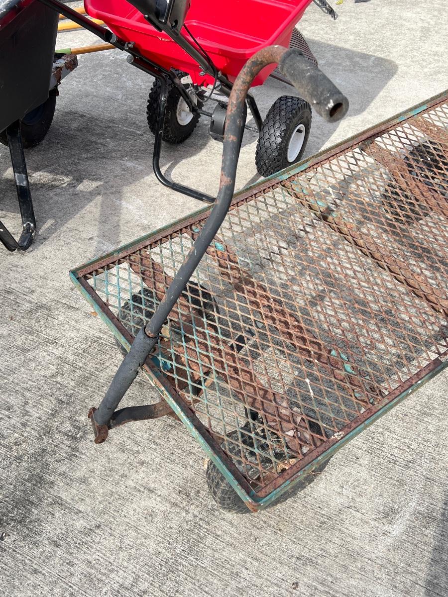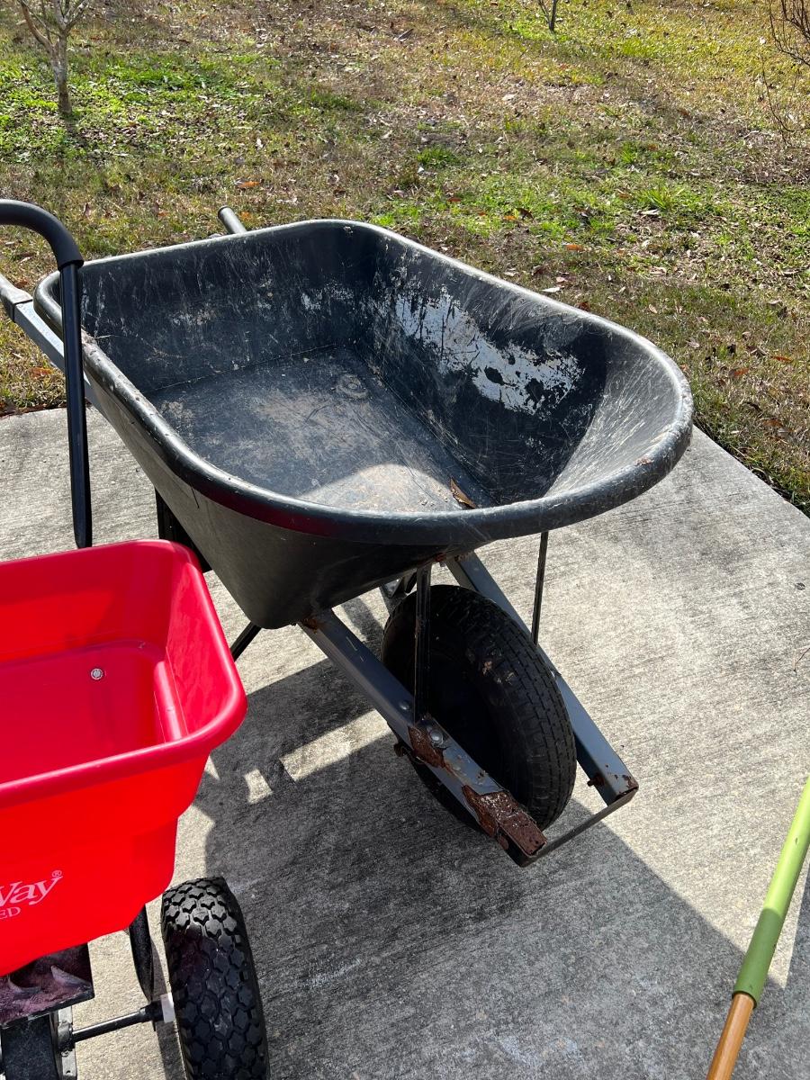 Includes everything pictured ~ Wheelbarrow & cart have surface rust, see photos ~ Some products included have never been opened or they're half way full or more ~ Cart = 12.5” H x 48” W x 24” D