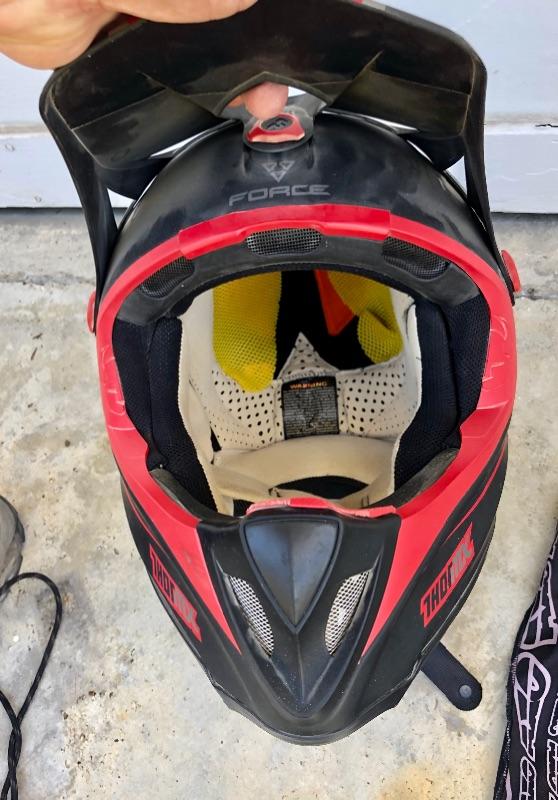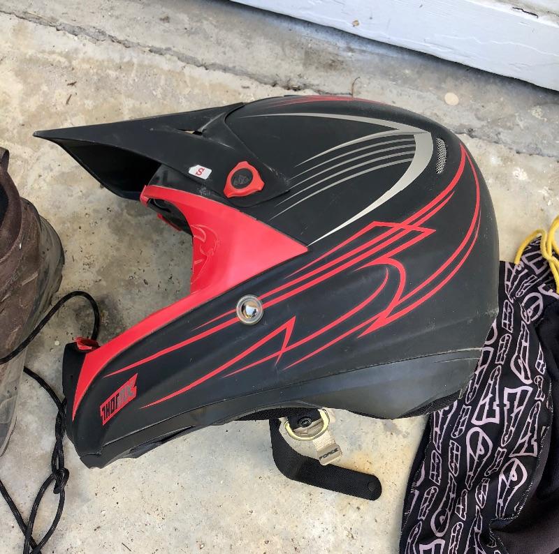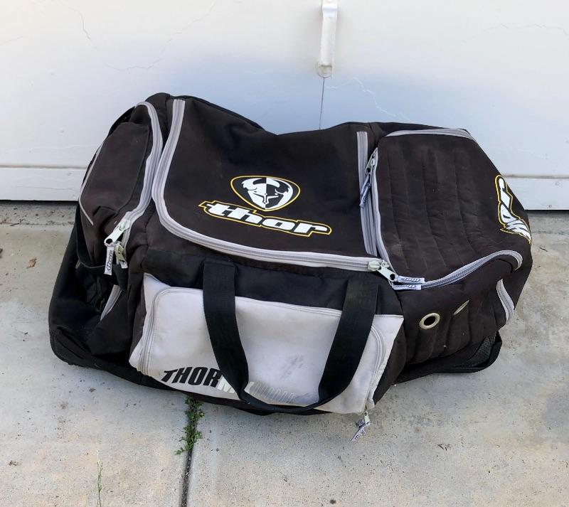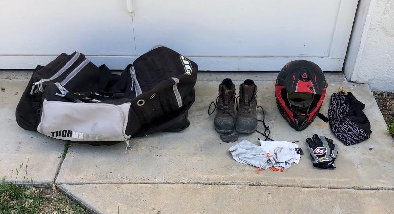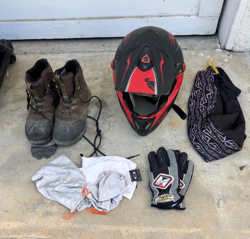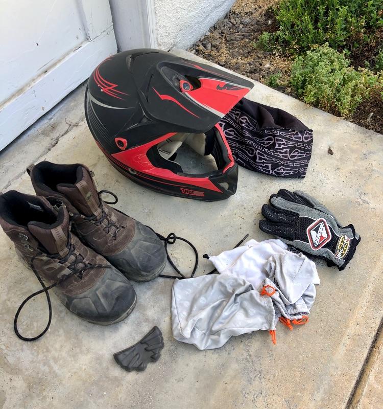 Helmet, boots (size 8?), gloves, and large zippered gear bag. See photos for additional details.
