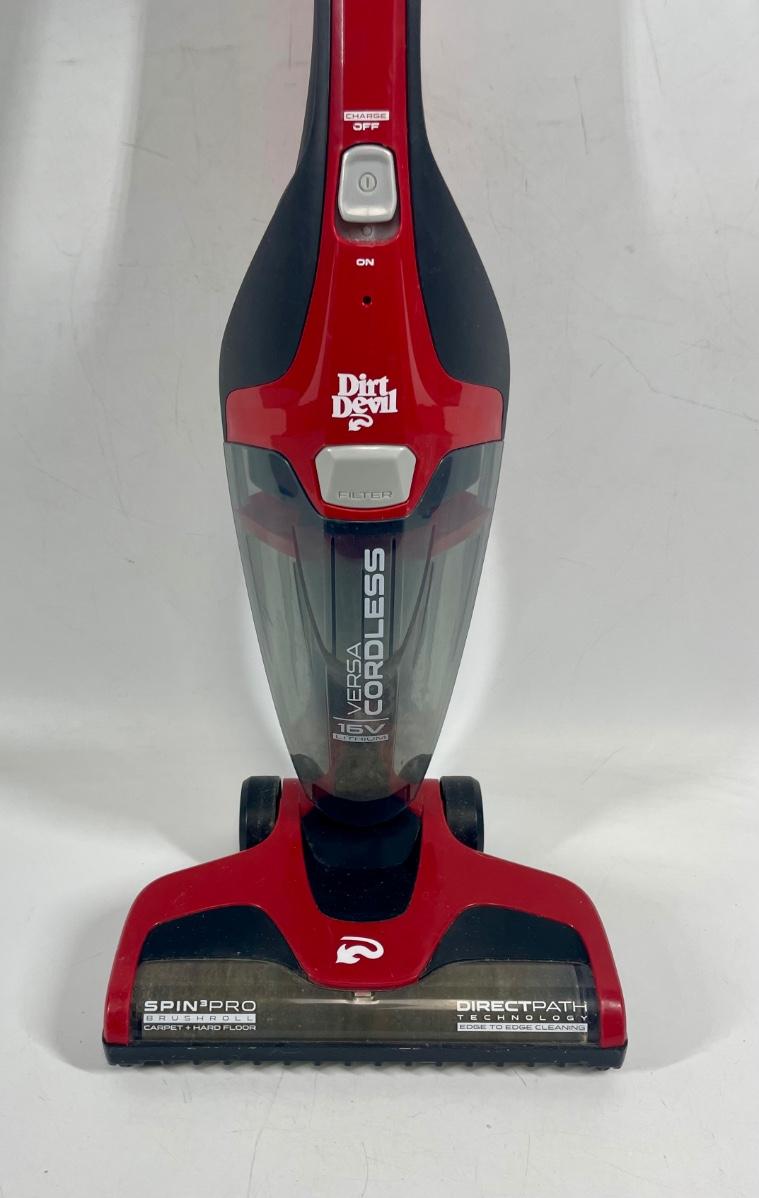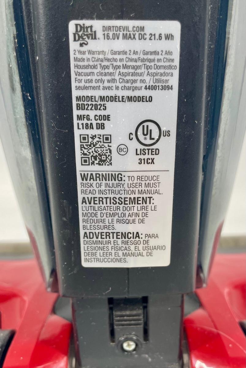 Dirt Devil cordless rechargeable lightweight vacuum. Model BD22025. Tested, works great. Recharging cord stows inside handle, see photos.